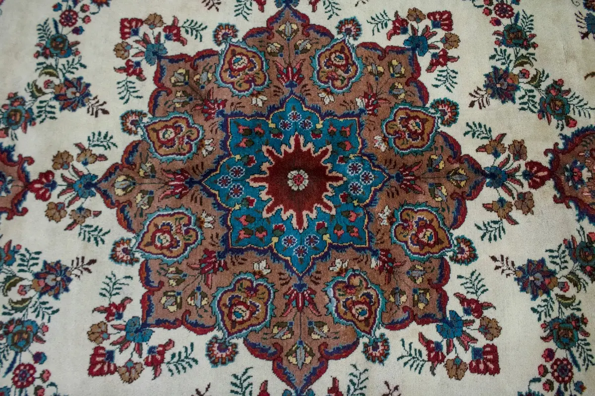 Hand Knotted vintage 10X13 ivory Persian rug made with vegetable dyes (fine wool pile and cotton foundation), superior knot count, and appealing ancient designs. This Oriental rug never will go out of style and would be among your most valuable treasure