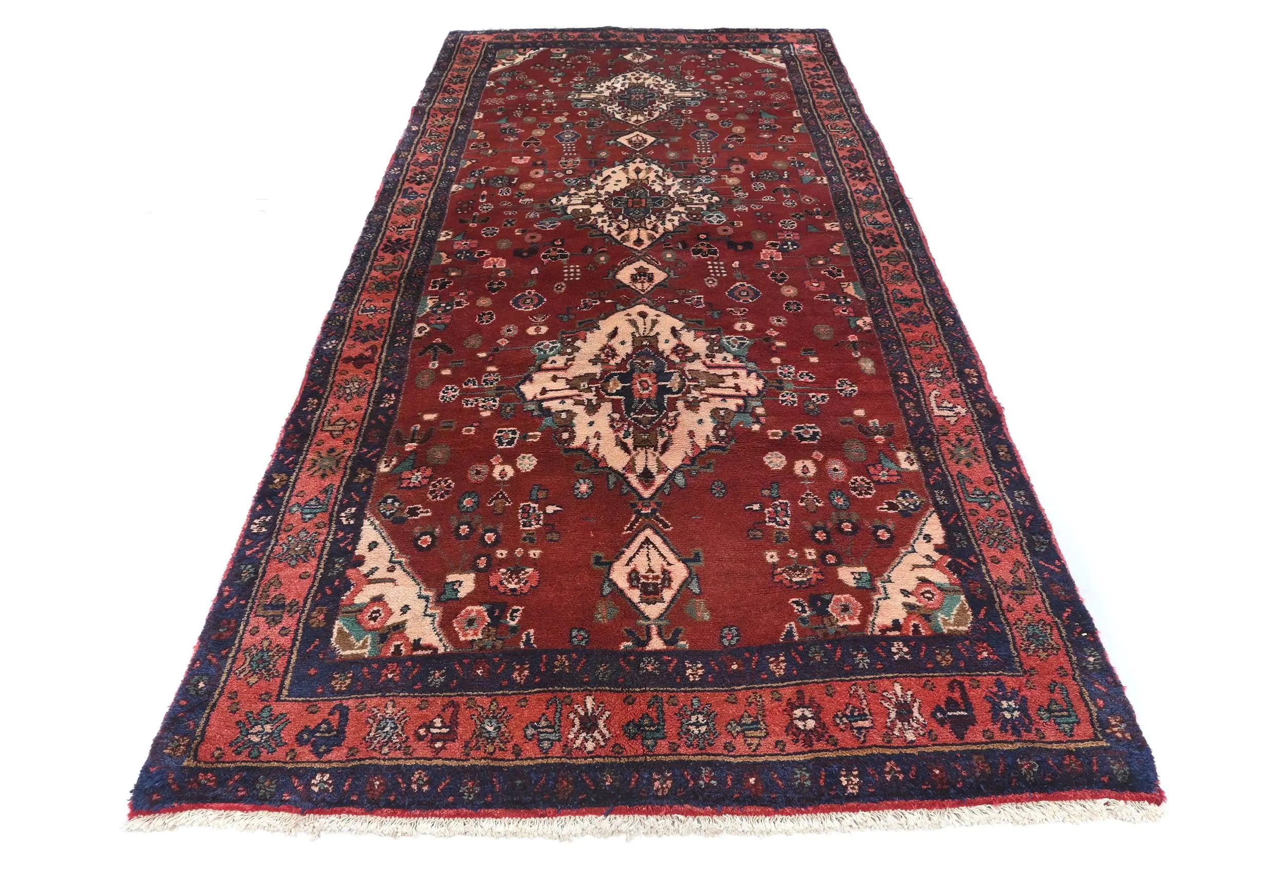 Handmade vintage 4X10 Maroon red Persian runner made with vegetable dyes (fine wool pile and cotton foundation), exceptional knot count, and appealing ancient designs. This Oriental runner never will go out of style and would be among your most valuable treasures.