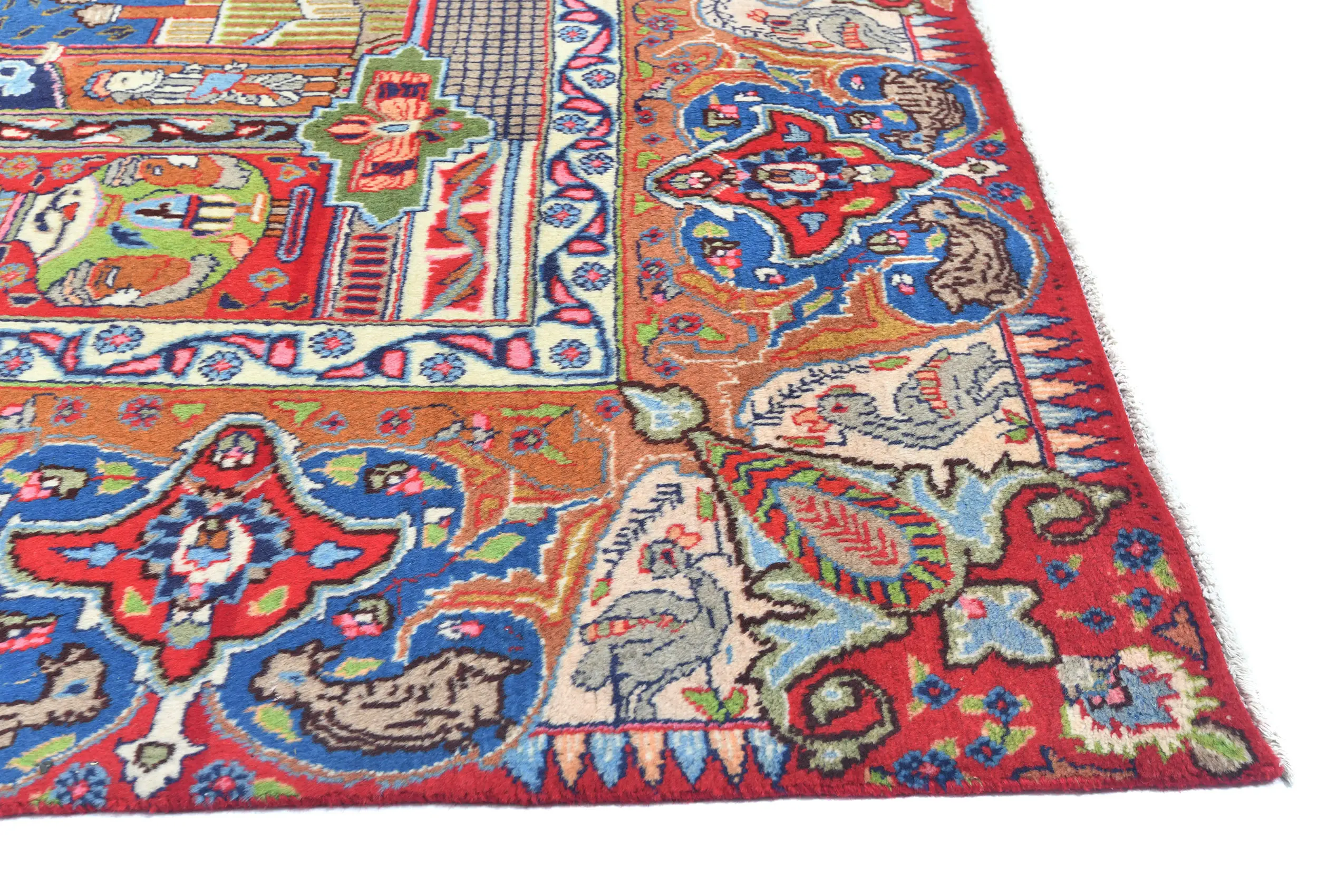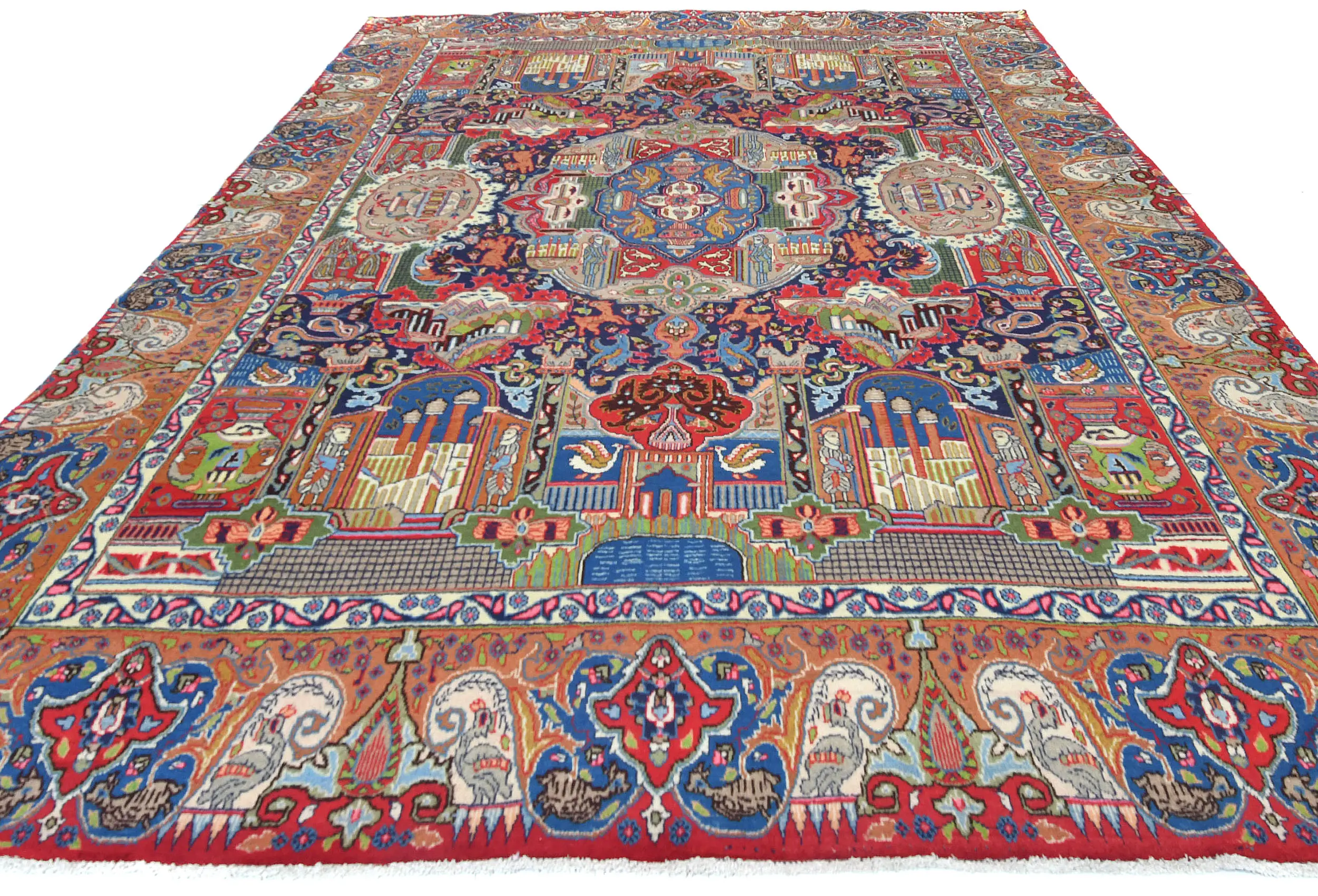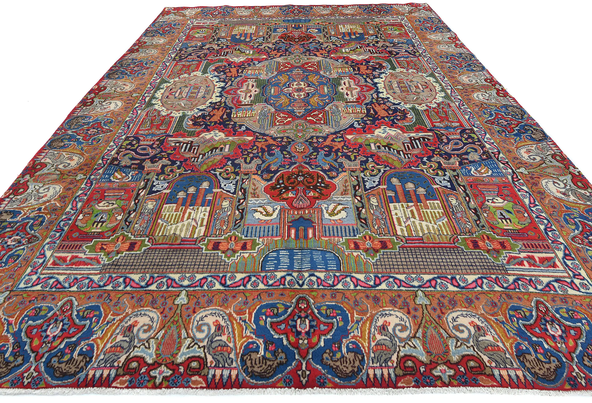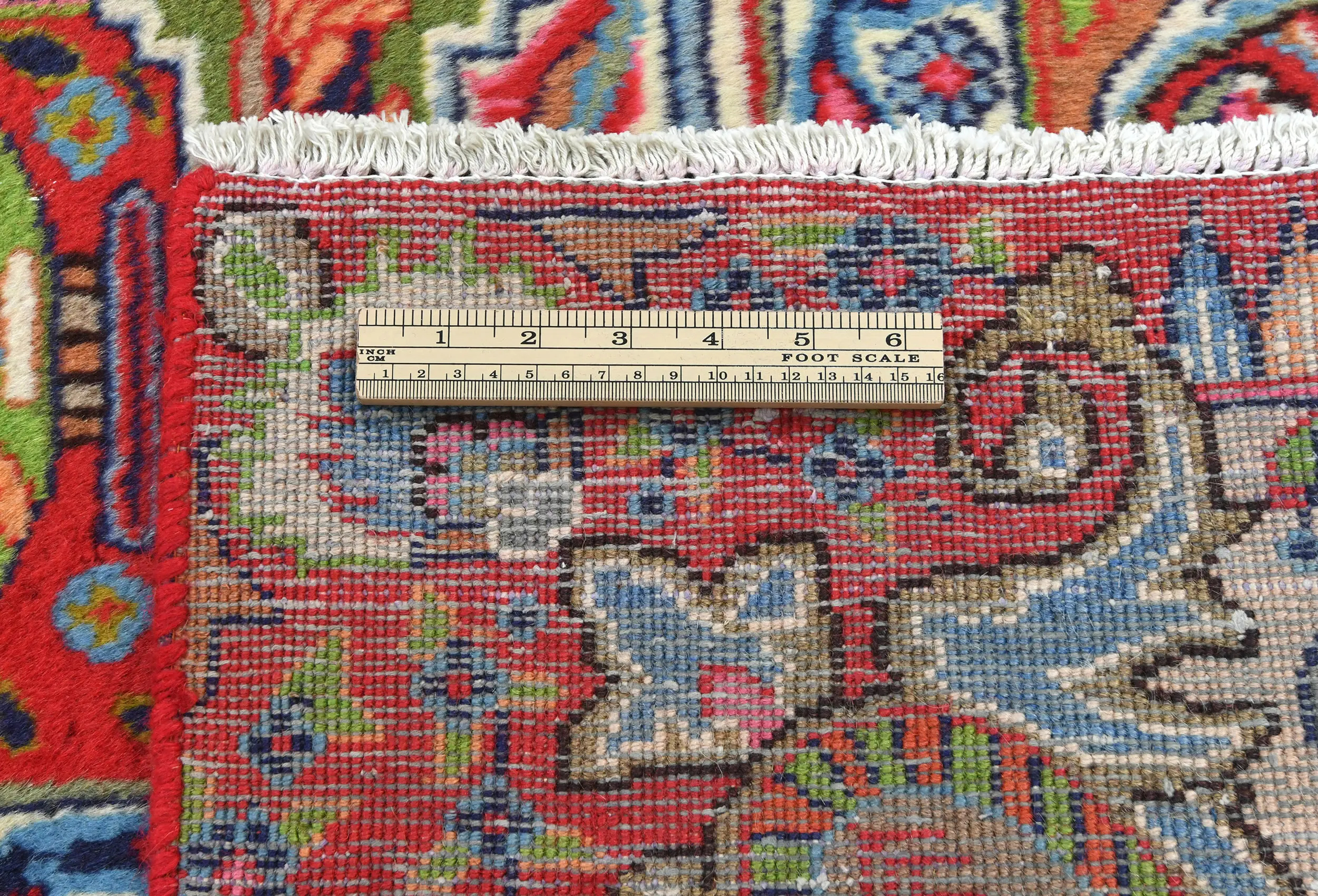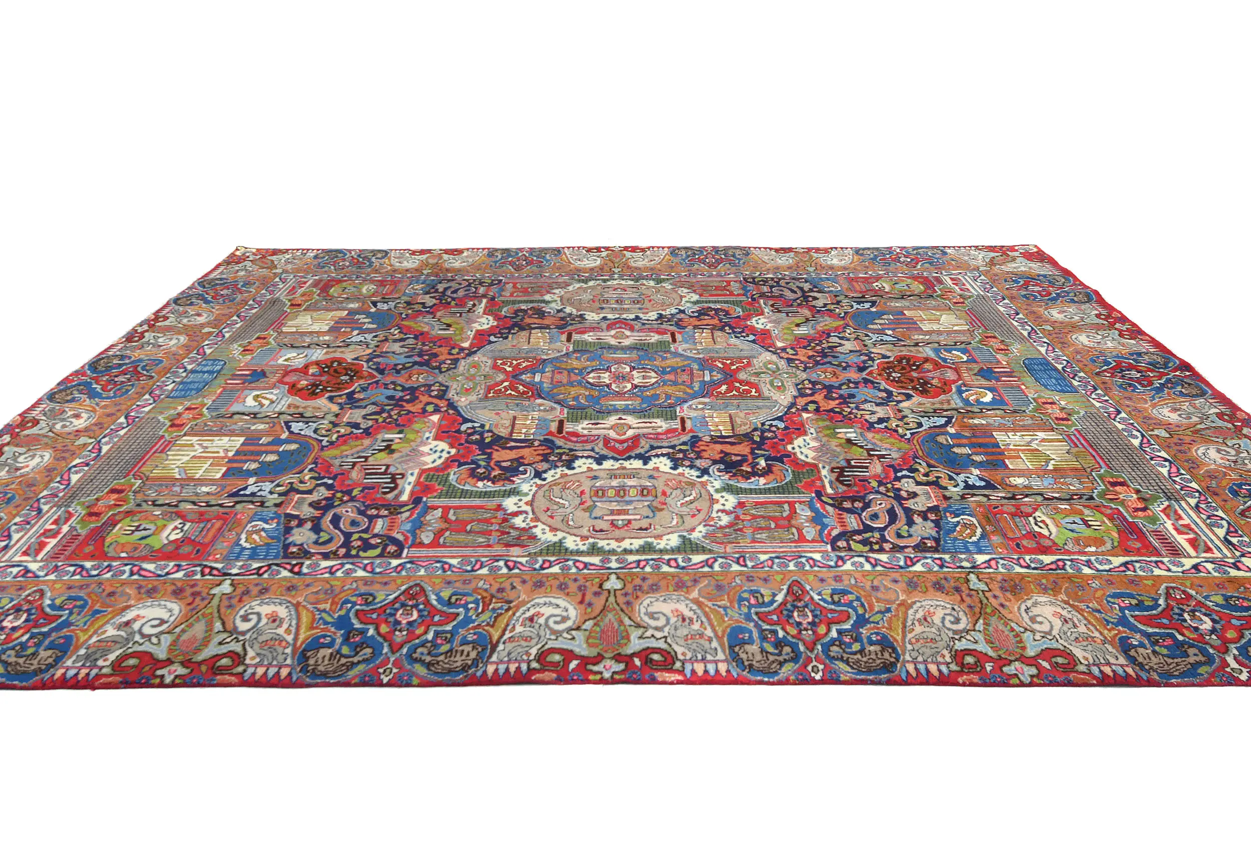 This authentic 10X13 multicolored vintage Persian rug was finely knotted by the hands of weavers influenced by a variety of amazing artistic designs, to recreate the aged look of the exceptional piece with a richness of color and embellished floral background field. What set this traditional Oriental area rug from the others are the material and dye used (wool pile and cotton foundation), knot count, antique designs, fantastic grades, and its regional historical connection: it has deep roots, from the story of the people who produced it to the meaning of the symbols and colors displayed across its canvas that have been praised for centuries. This classic home décor carpet will be completely cozy and inviting that never will go out of style! Also, this Oriental rug would be among your most valuable treasures, it is a great investment that increase in value over time, and it will last a lifetime because was woven with high-quality, all-natural wool; it won’t rip, tear, or shed. Eco-friendly, opulent yet affordable; this Persian rug will give you an extra pop of character to help define your home environment with luxury and warmth that will capture the eyes and attention of your audience (homeowners, designers, decorators, family and friends). <