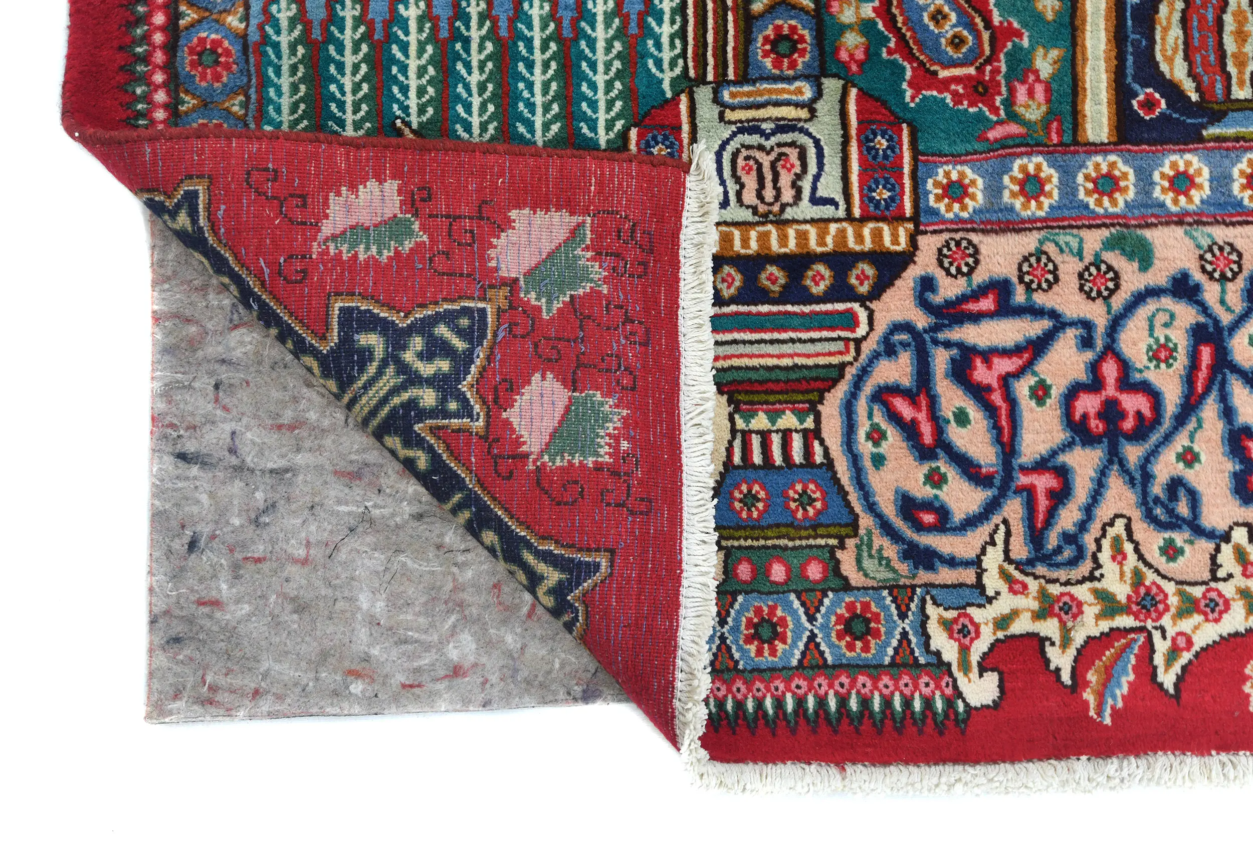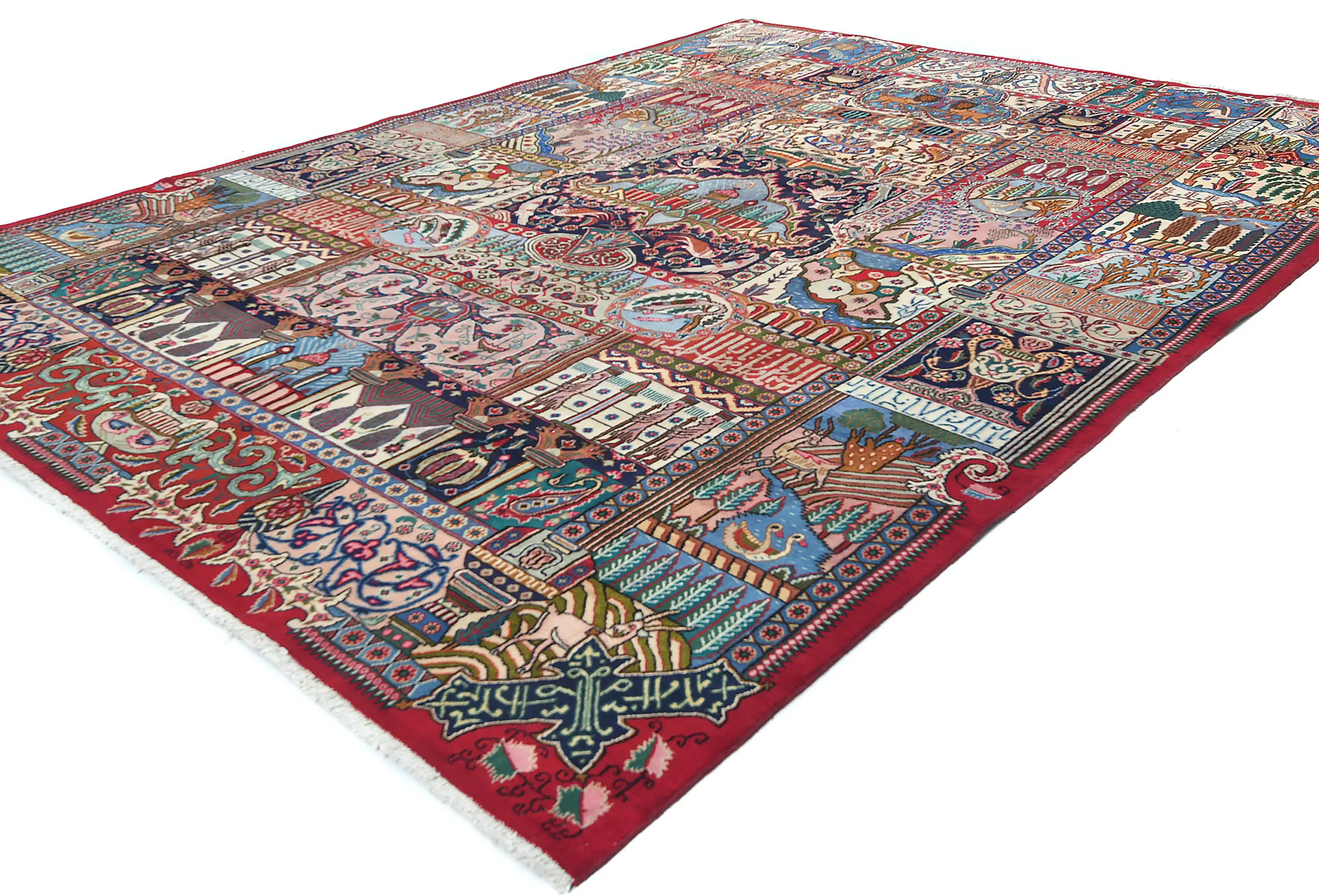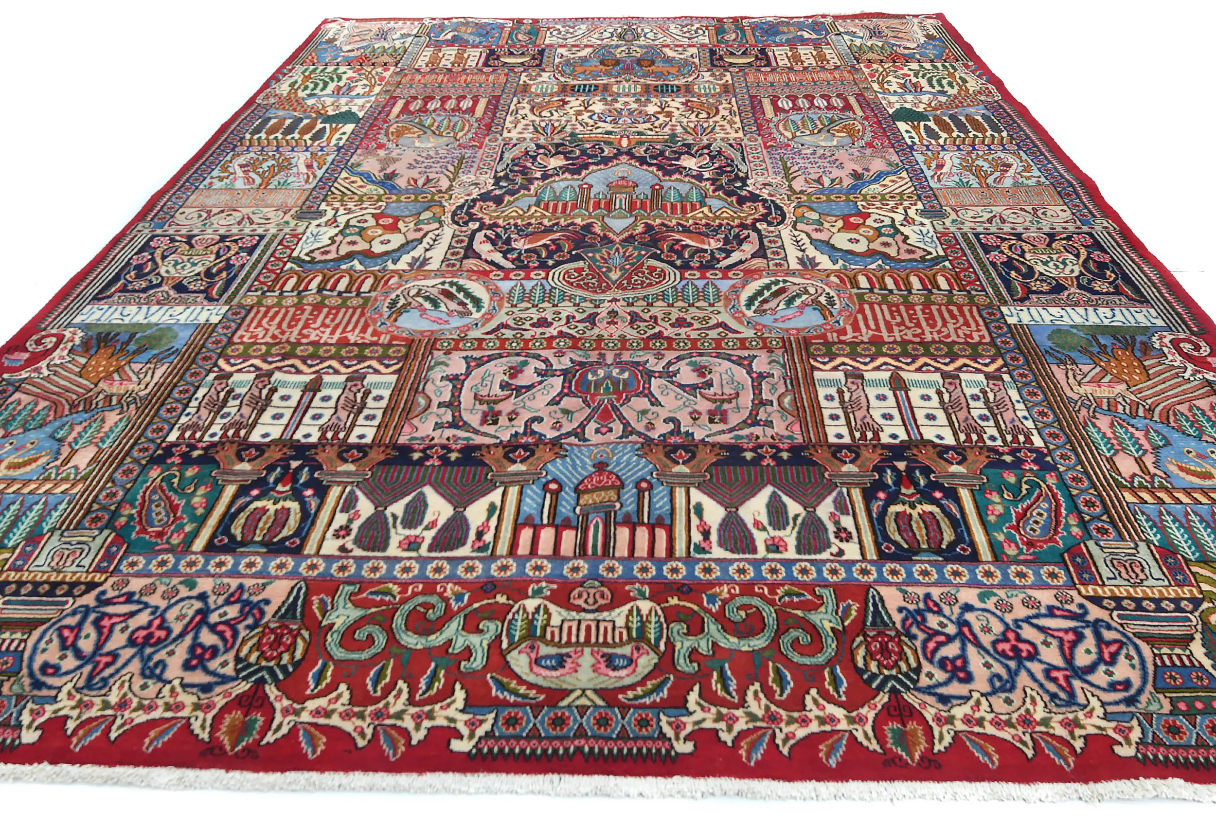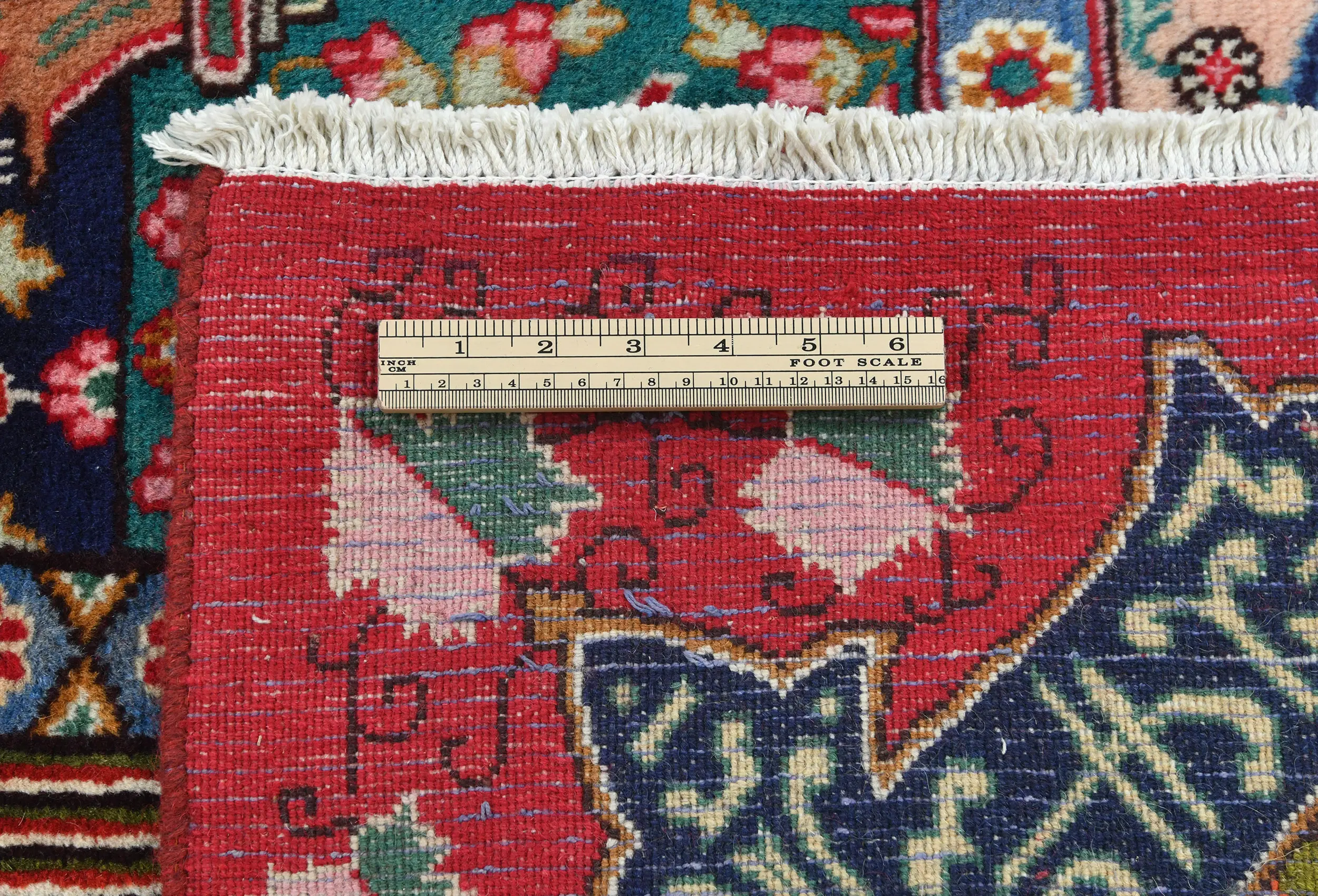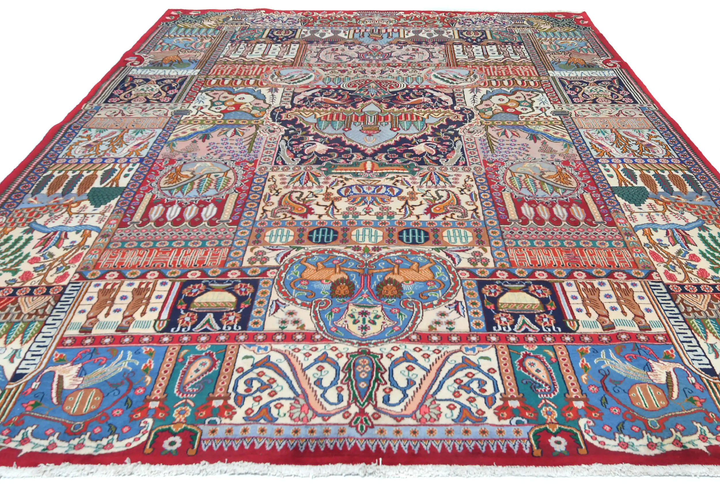 This authentic 9'5X12'6 multicolored vintage Persian rug was finely knotted by the hands of weavers influenced by a variety of amazing artistic designs, to recreate the aged look of the exceptional piece with a richness of color and embellished floral background field. What set this traditional Oriental area rug from the others are the material and dye used (wool pile and cotton foundation), knot count, antique designs, fantastic grades, and its regional historical connection: it has deep roots, from the story of the people who produced it to the meaning of the symbols and colors displayed across its canvas that have been praised for centuries. This classic home décor carpet will be completely cozy and inviting that never will go out of style! Also, this Oriental rug would be among your most valuable treasures, it is a great investment that increase in value over time, and it will last a lifetime because was woven with high-quality, all-natural wool; it won’t rip, tear, or shed. Eco-friendly, opulent yet affordable; this Persian rug will give you an extra pop of character to help define your home environment with luxury and warmth that will capture the eyes and attention of your audience (homeowners, designers, decorators, family and friends).
