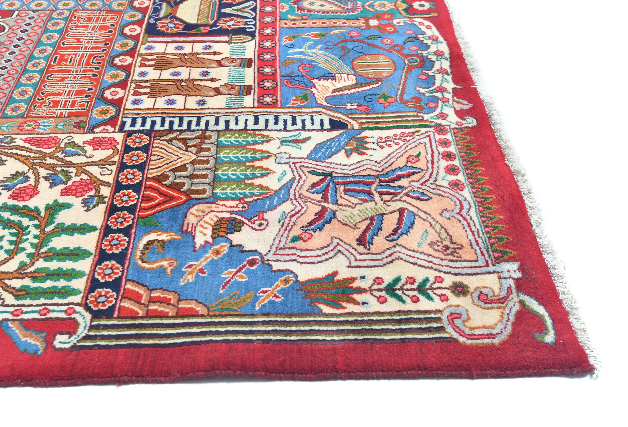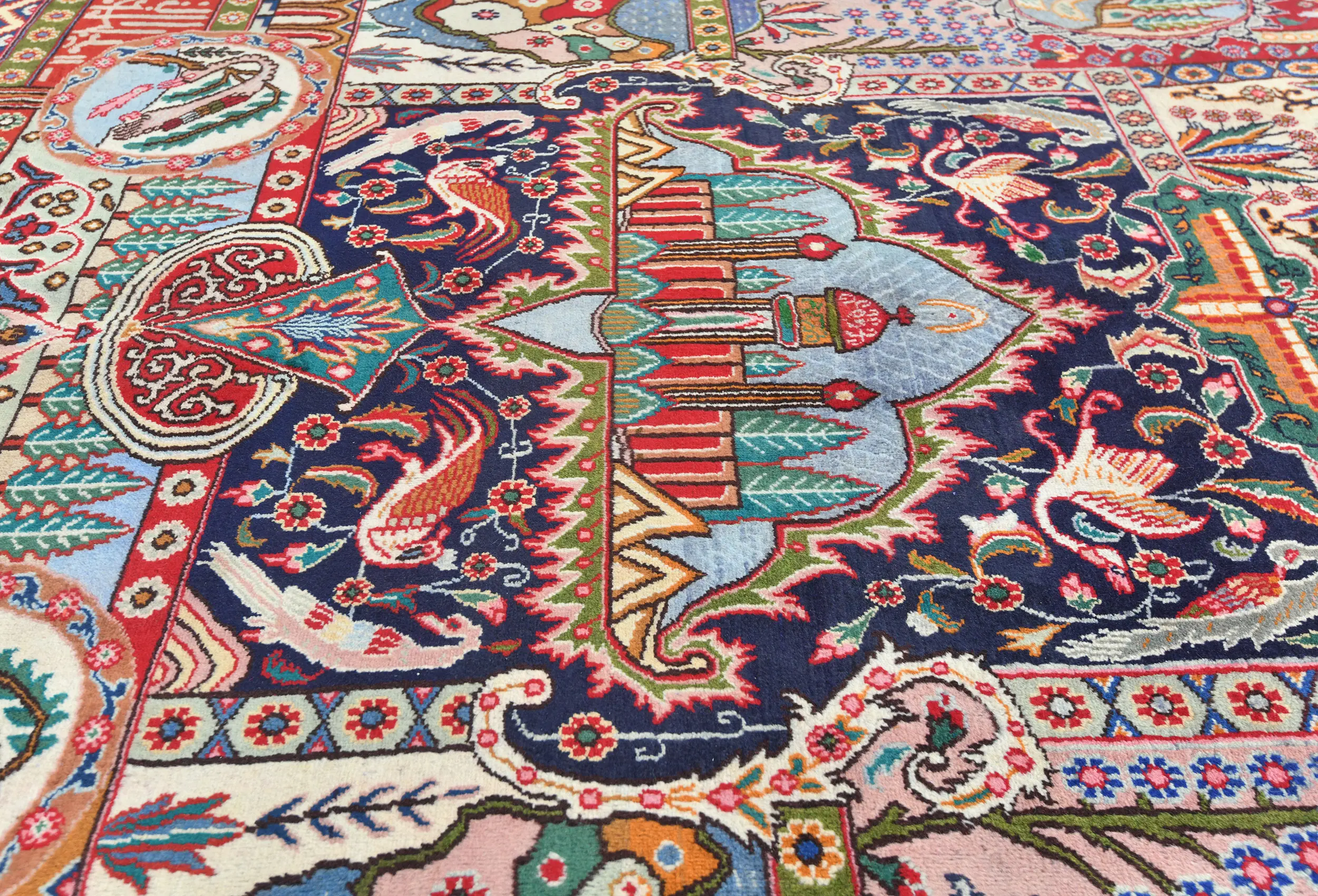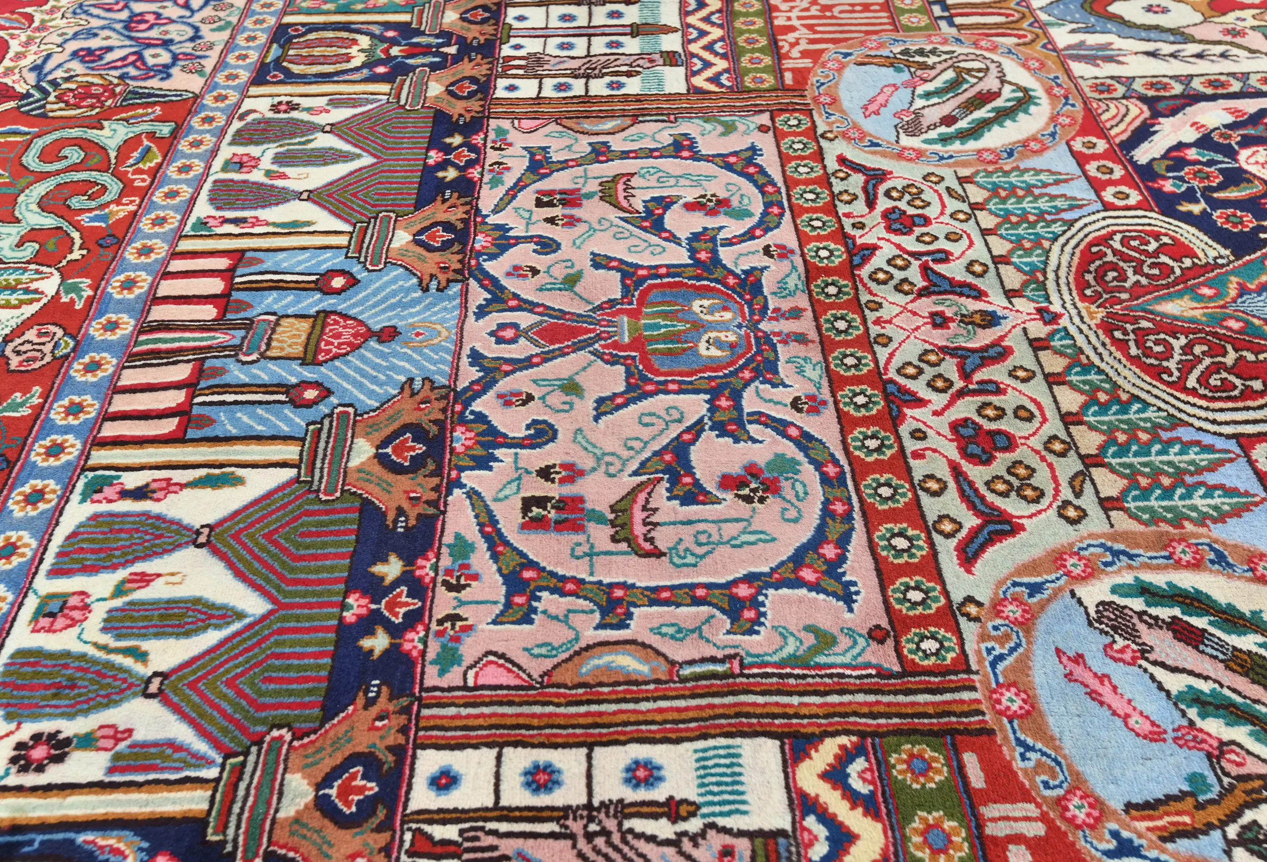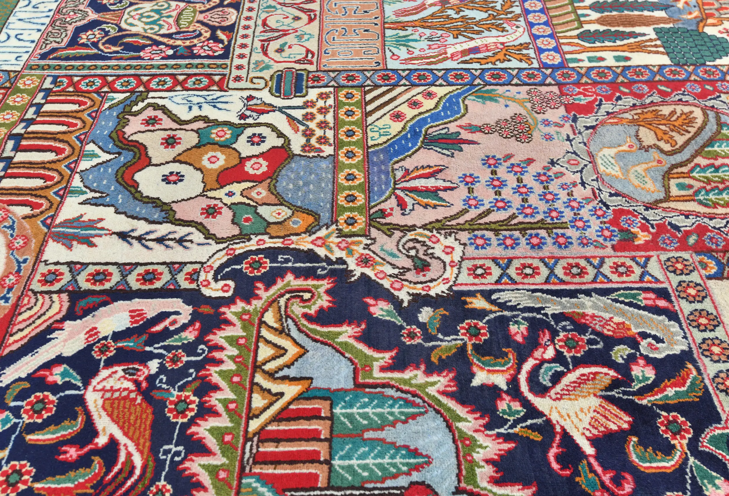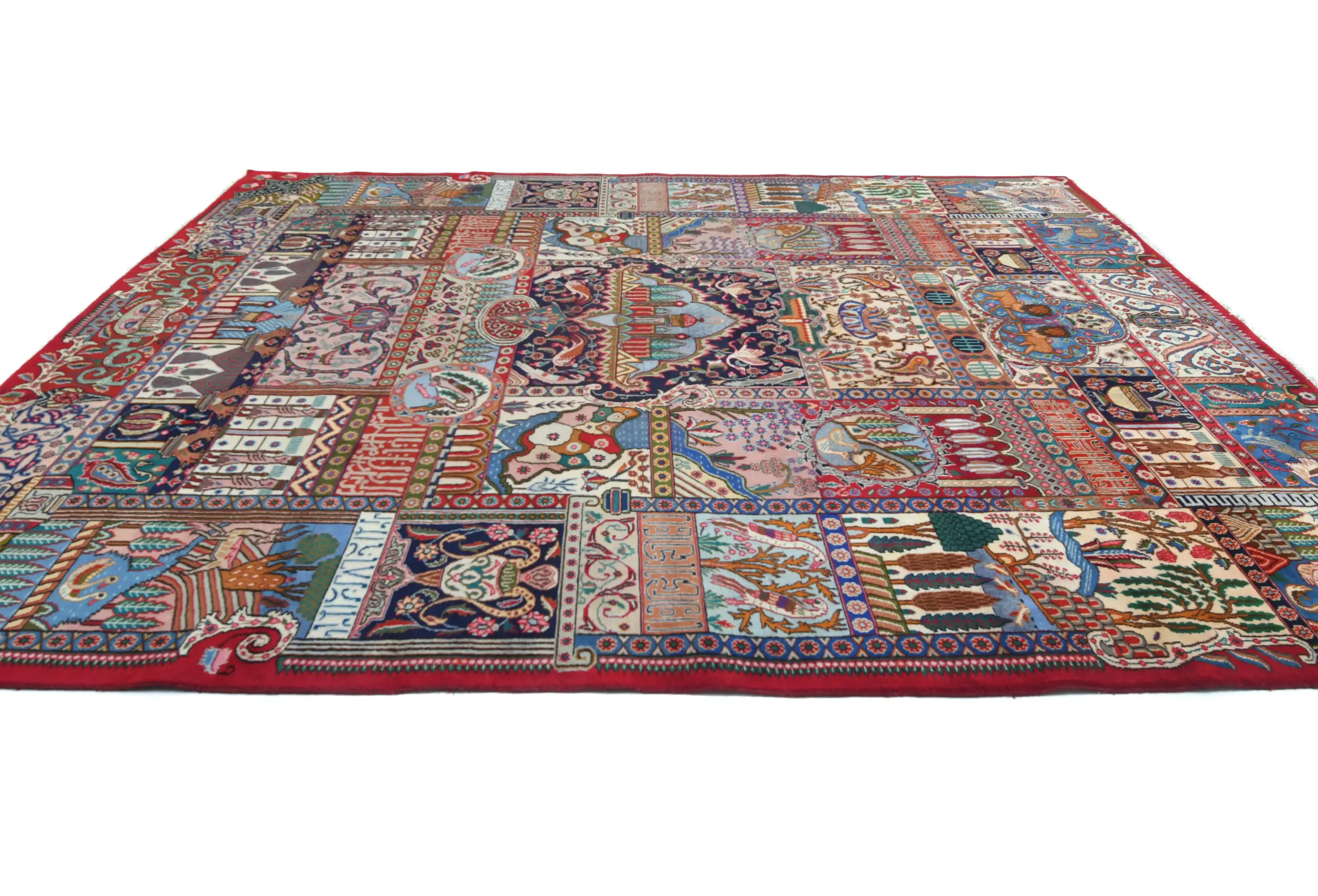 This authentic 9'5X12'6 multicolored vintage Persian rug was finely knotted by the hands of weavers influenced by a variety of amazing artistic designs, to recreate the aged look of the exceptional piece with a richness of color and embellished floral background field. What set this traditional Oriental area rug from the others are the material and dye used (wool pile and cotton foundation), knot count, antique designs, fantastic grades, and its regional historical connection: it has deep roots, from the story of the people who produced it to the meaning of the symbols and colors displayed across its canvas that have been praised for centuries. This classic home décor carpet will be completely cozy and inviting that never will go out of style! Also, this Oriental rug would be among your most valuable treasures, it is a great investment that increase in value over time, and it will last a lifetime because was woven with high-quality, all-natural wool; it won’t rip, tear, or shed. Eco-friendly, opulent yet affordable; this Persian rug will give you an extra pop of character to help define your home environment with luxury and warmth that will capture the eyes and attention of your audience (homeowners, designers, decorators, family and friends).
