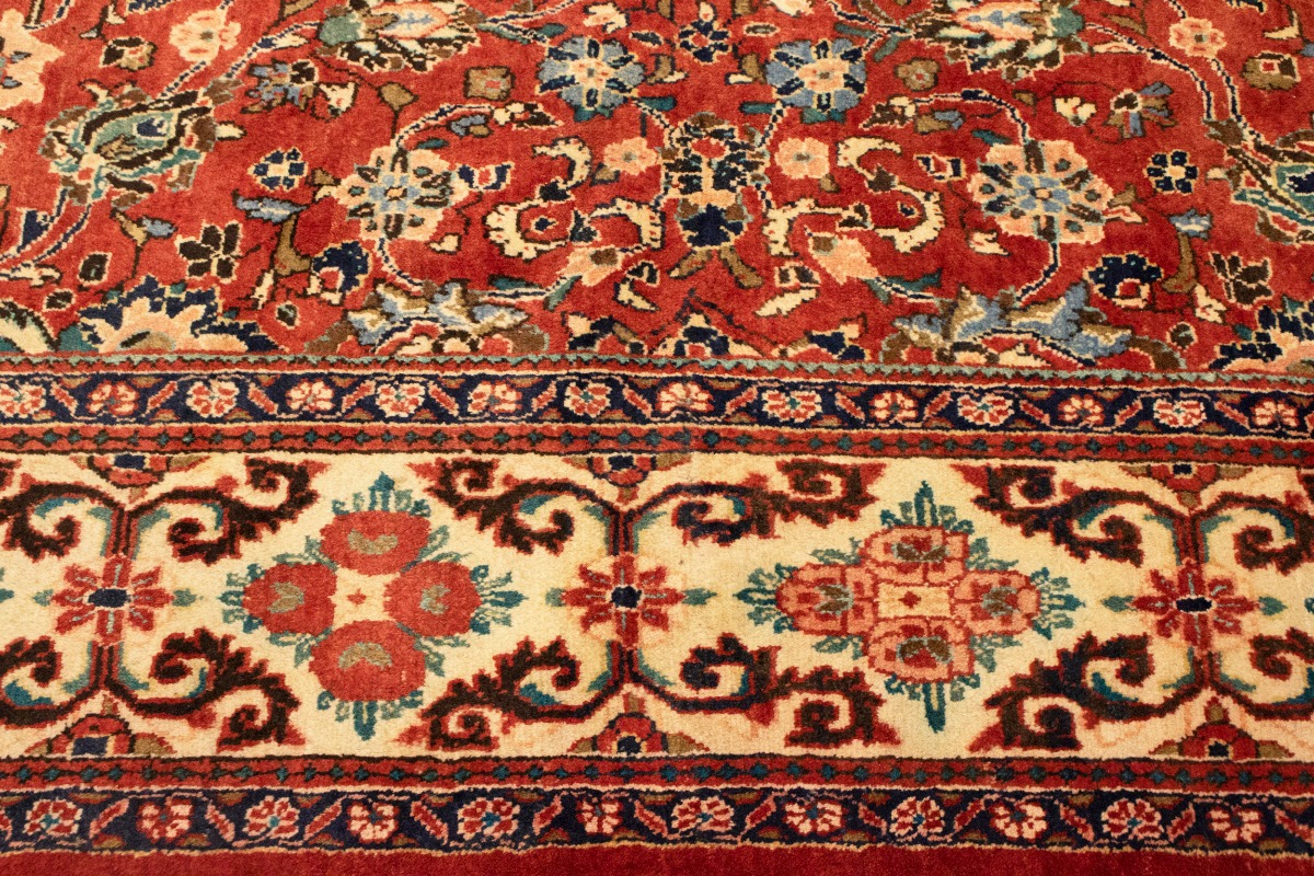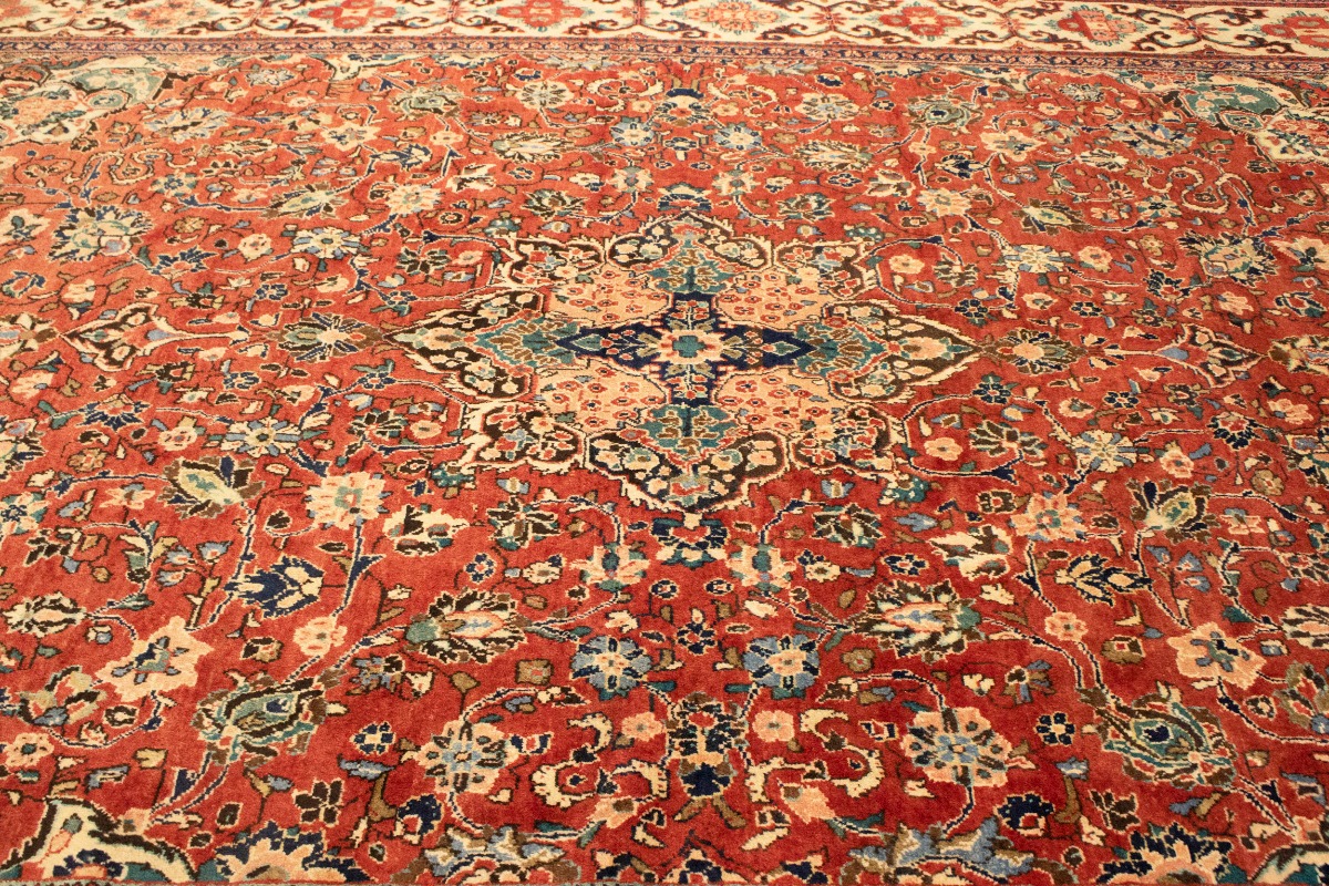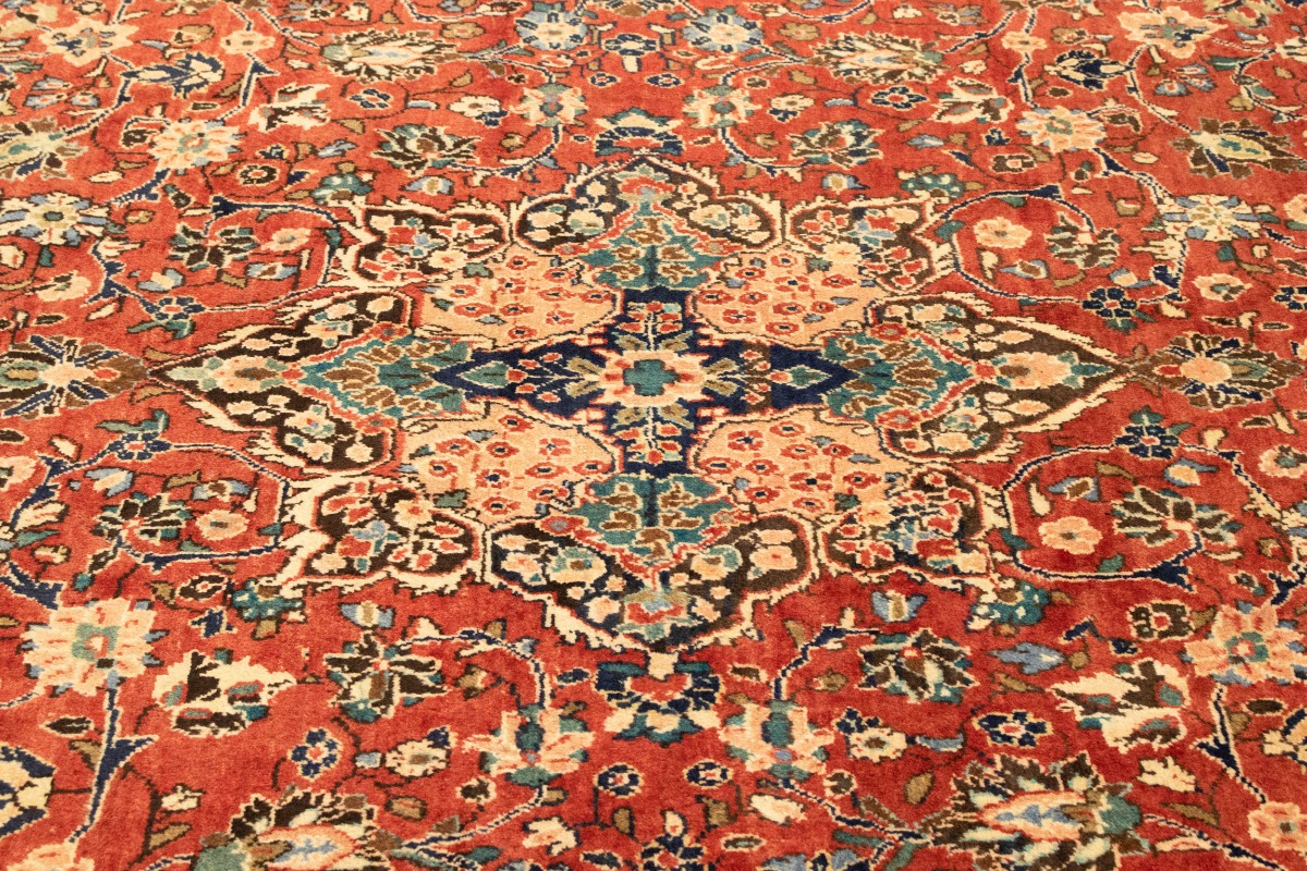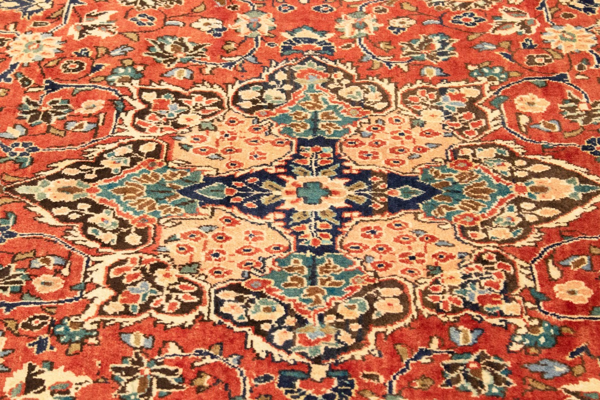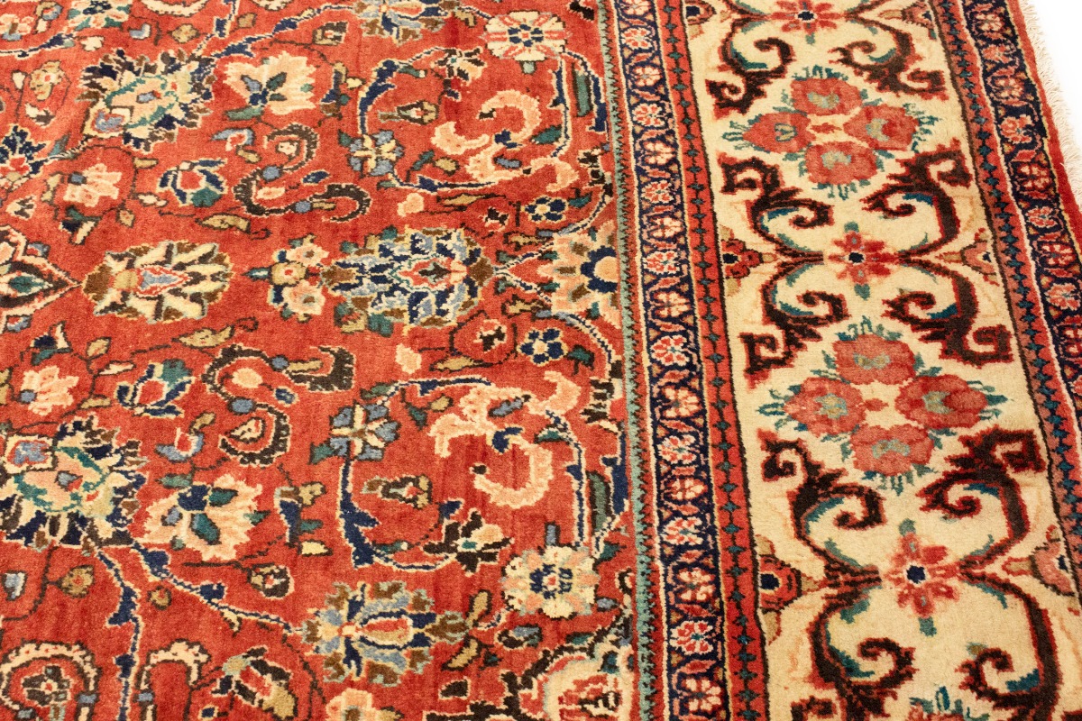 Handmade vintage 10X14 orange-red Persian rug made with natural dyes (fine wool pile and cotton foundation), superior knot count, and appealing ancient designs. This Oriental rug never will go out of style and would be among your most valuable treasures.