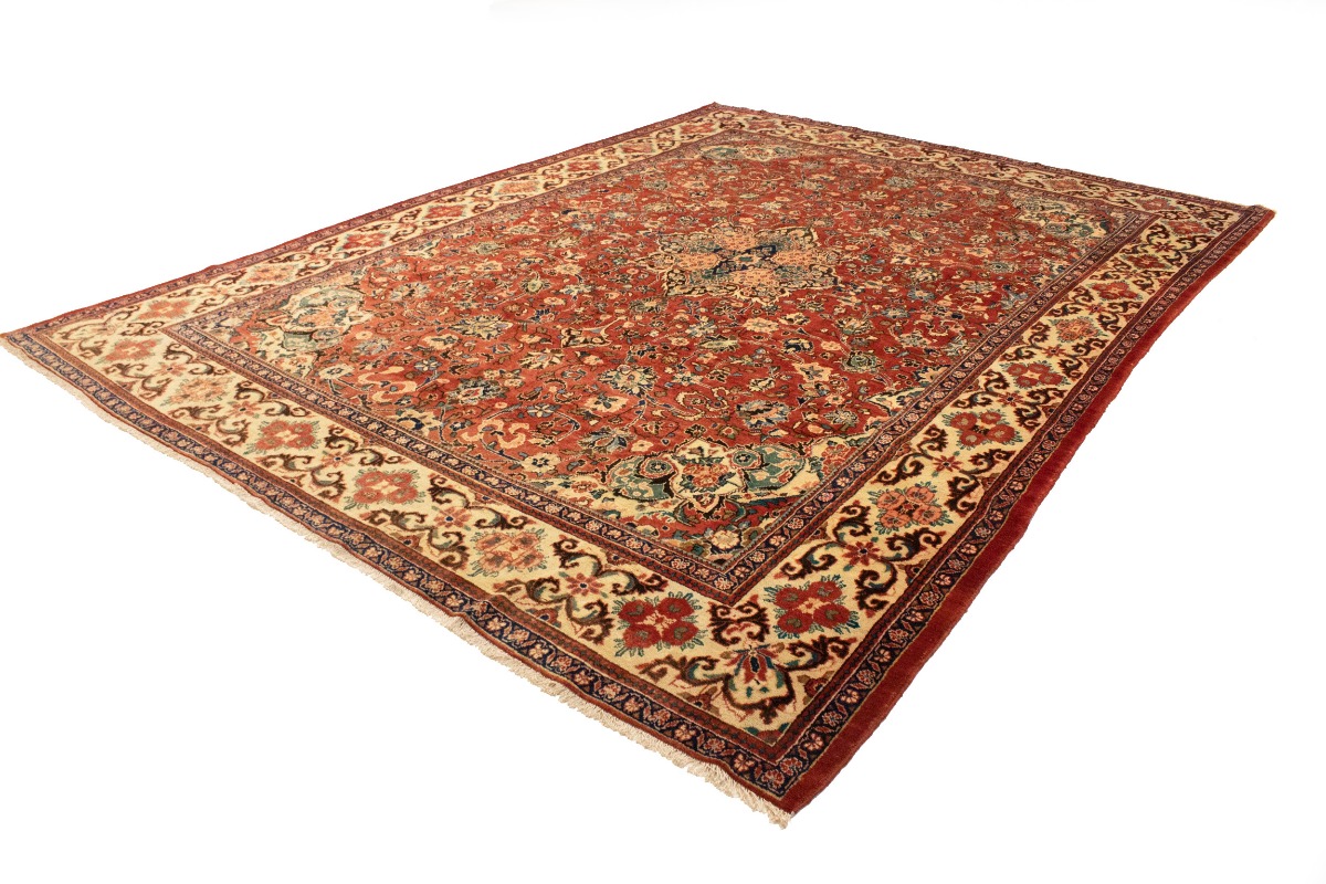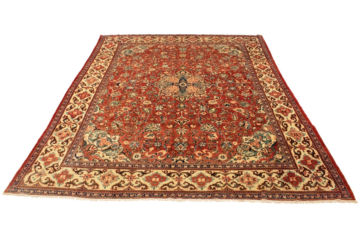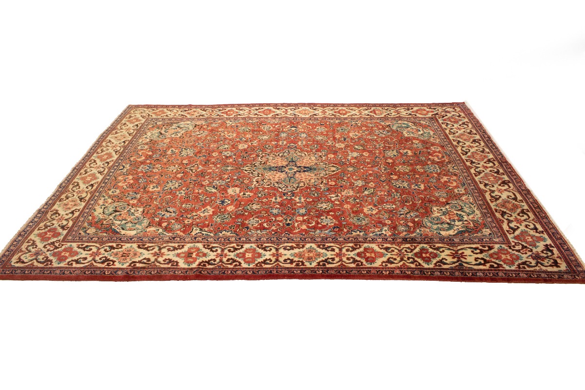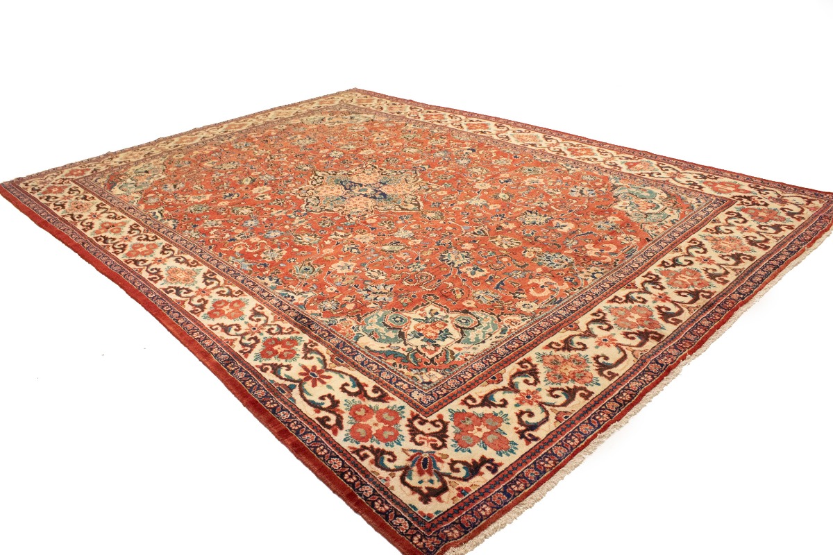 This authentic 10X14 orange-red vintage Persian rug was masterly knotted by the hands of weavers inspired by a variety of wonderful artistic designs, to recreate the aged look of the original piece with a richness of color and intricate patterned floral background field. What set this traditional Oriental area rug from the others are the material and dye used (wool pile and cotton foundation), knot count, antique designs, fantastic grades, and its regional historical connection: it has deep roots, from the story of the people who produced it to the meaning of the symbols and colors displayed across its canvas that have been praised for centuries. This classic home décor carpet will be completely cozy and inviting that never will go out of style! Also, this Oriental rug would be among your most valuable treasures, it is a great investment that accrues value over time, and it will last for generations because was woven with high-quality, all-natural wool; it won’t rip, tear, or shed. Environmentally friendly, opulent yet affordable; this Persian rug will give you a thorough amount of character to help define your living space with luxury and warmth that will capture the eyes and attention of your audience (homeowners, designers, decorators, family and friends). RT-10405