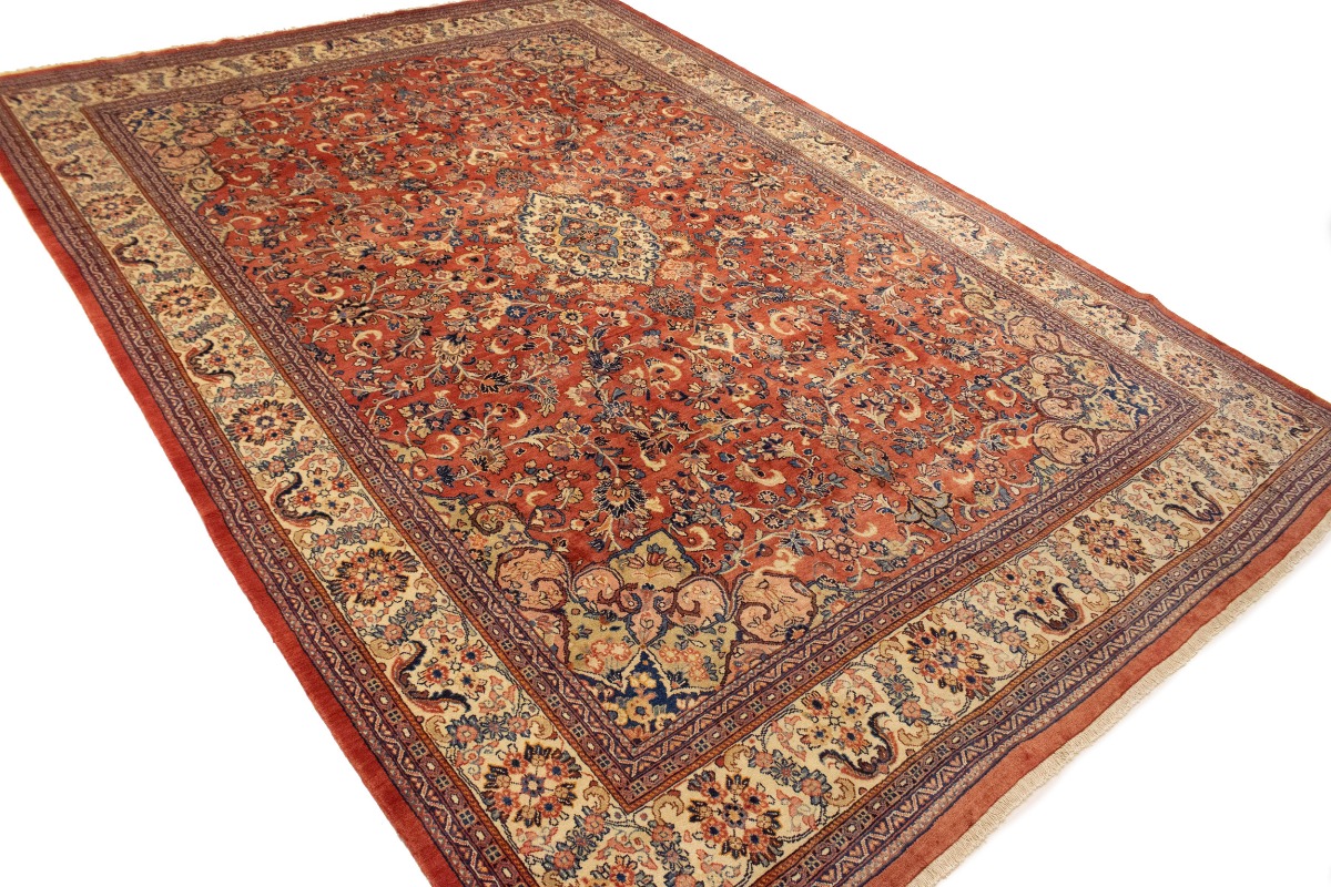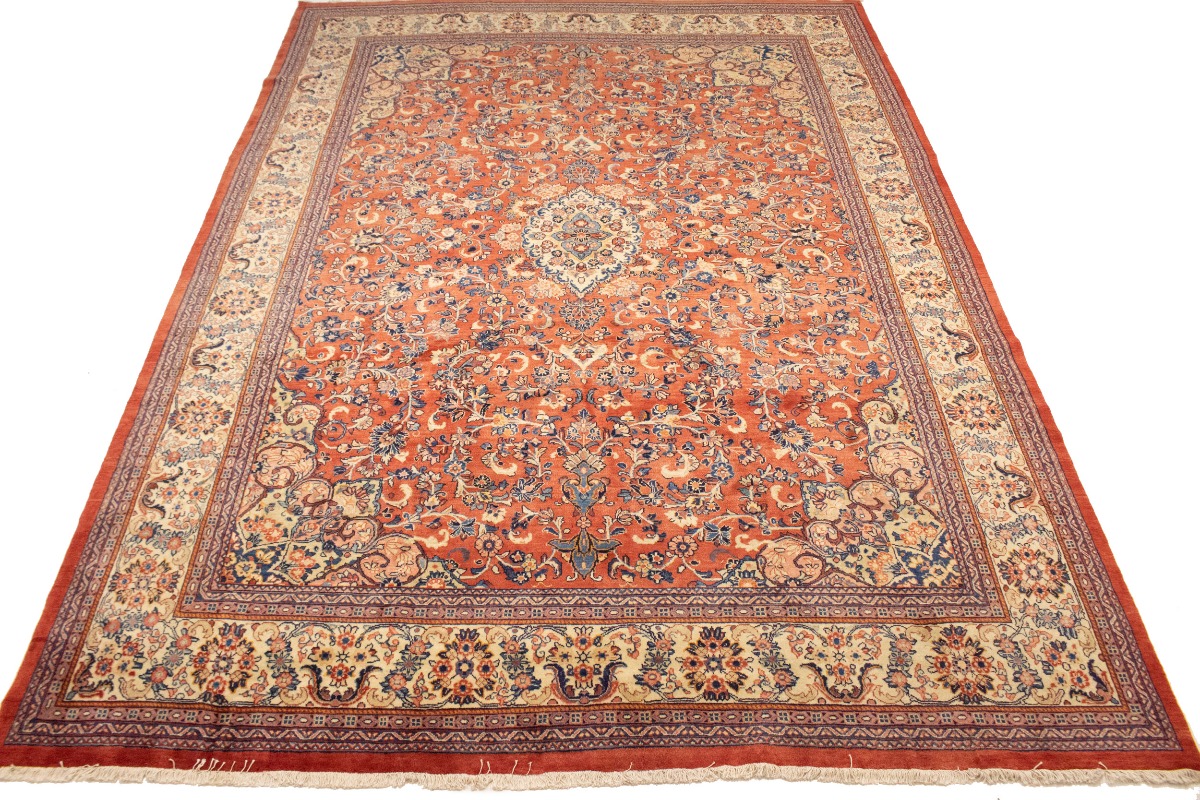 This authentic 11X15 orange-red vintage Persian rug was masterly knotted by the hands of weavers inspired by a variety of wonderful artistic designs, to recreate the aged look of the original piece with a richness of color and intricate patterned floral background field. What set this traditional Oriental area rug from the others are the material and dye used (wool pile and cotton foundation), knot count, antique designs, fantastic grades, and its regional historical connection: it has deep roots, from the story of the people who produced it to the meaning of the symbols and colors displayed across its canvas that have been praised for centuries. This classic home décor carpet will be completely cozy and inviting that never will go out of style!