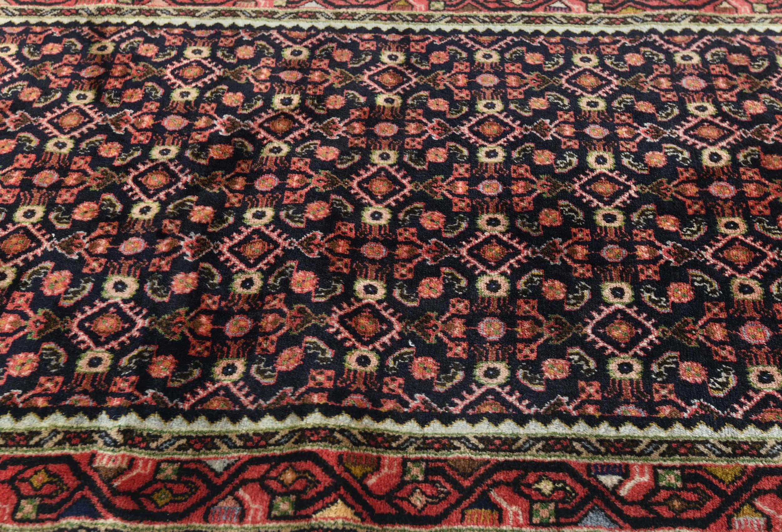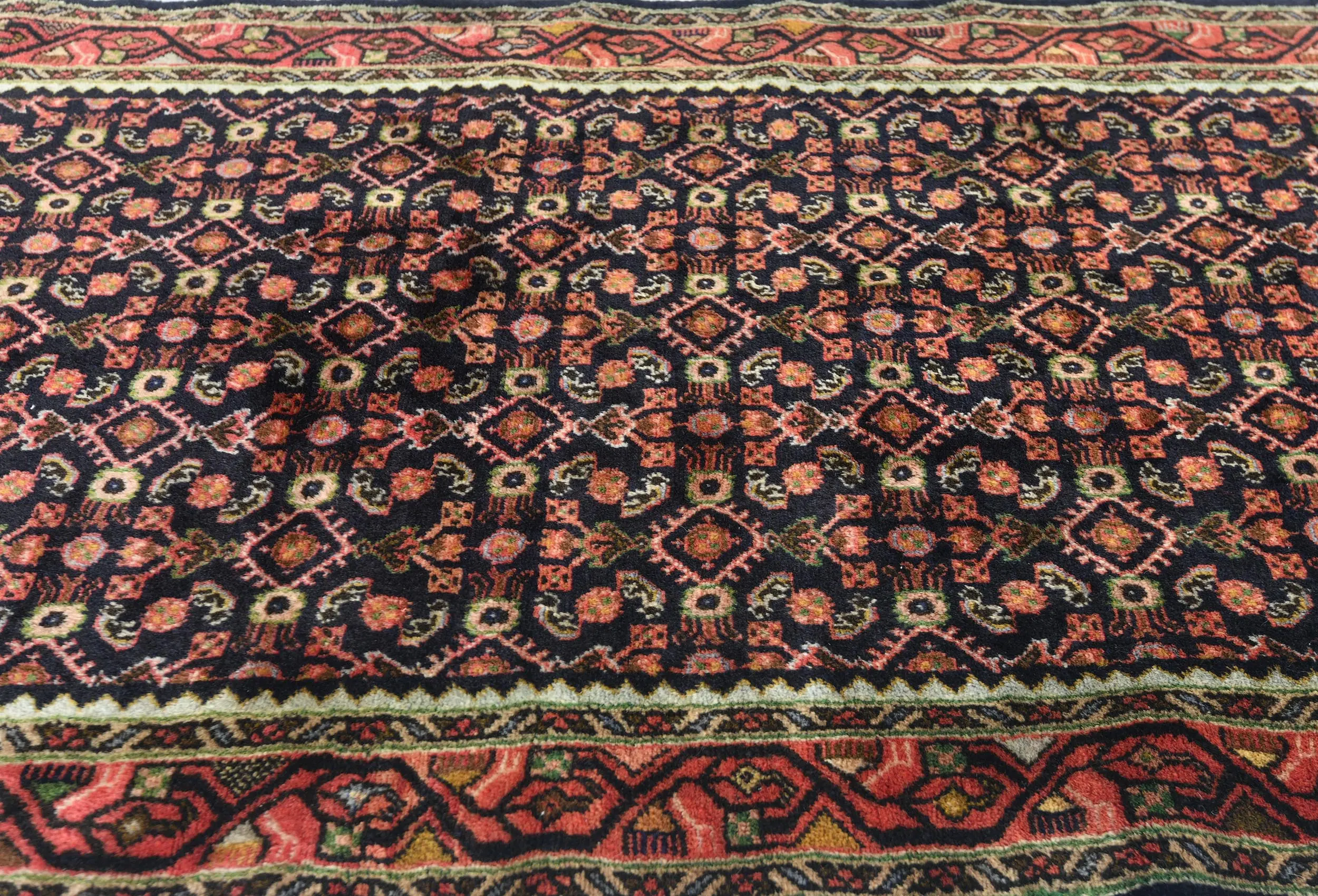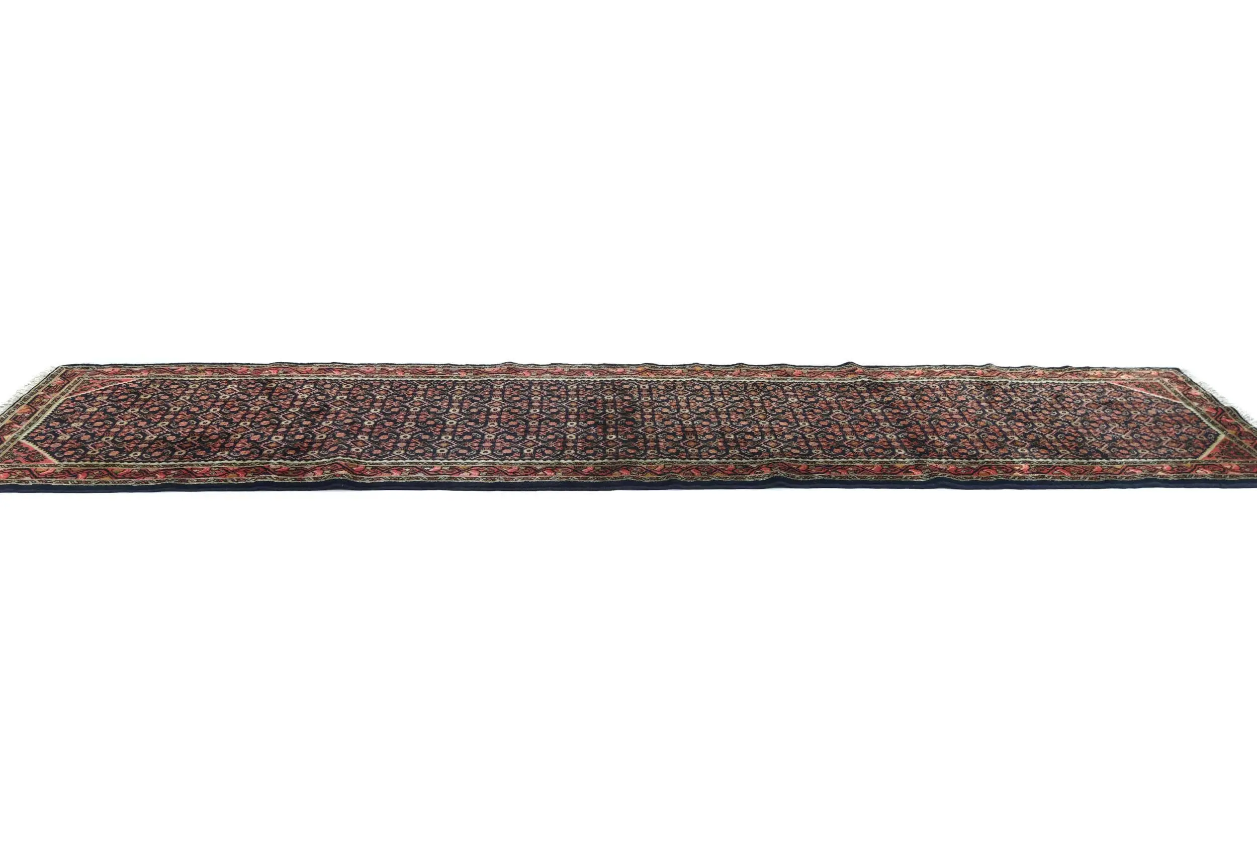 Handmade vintage 3X12 purple-navy Persian runner made with vegetable dyes (fine wool pile and cotton foundation), exceptional knot count, and appealing ancient designs. This Oriental runner never will go out of style and would be among your most valuable treasures.