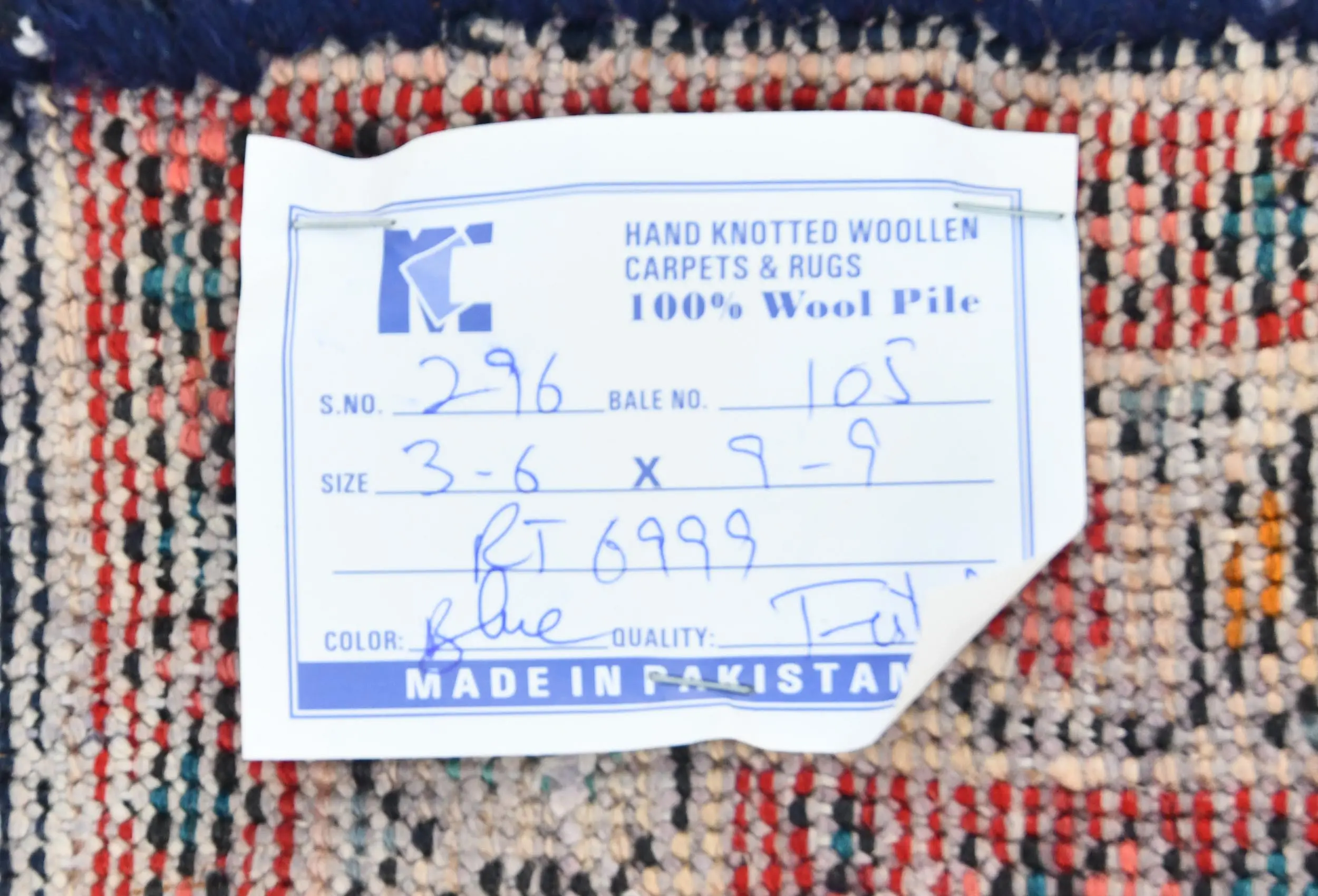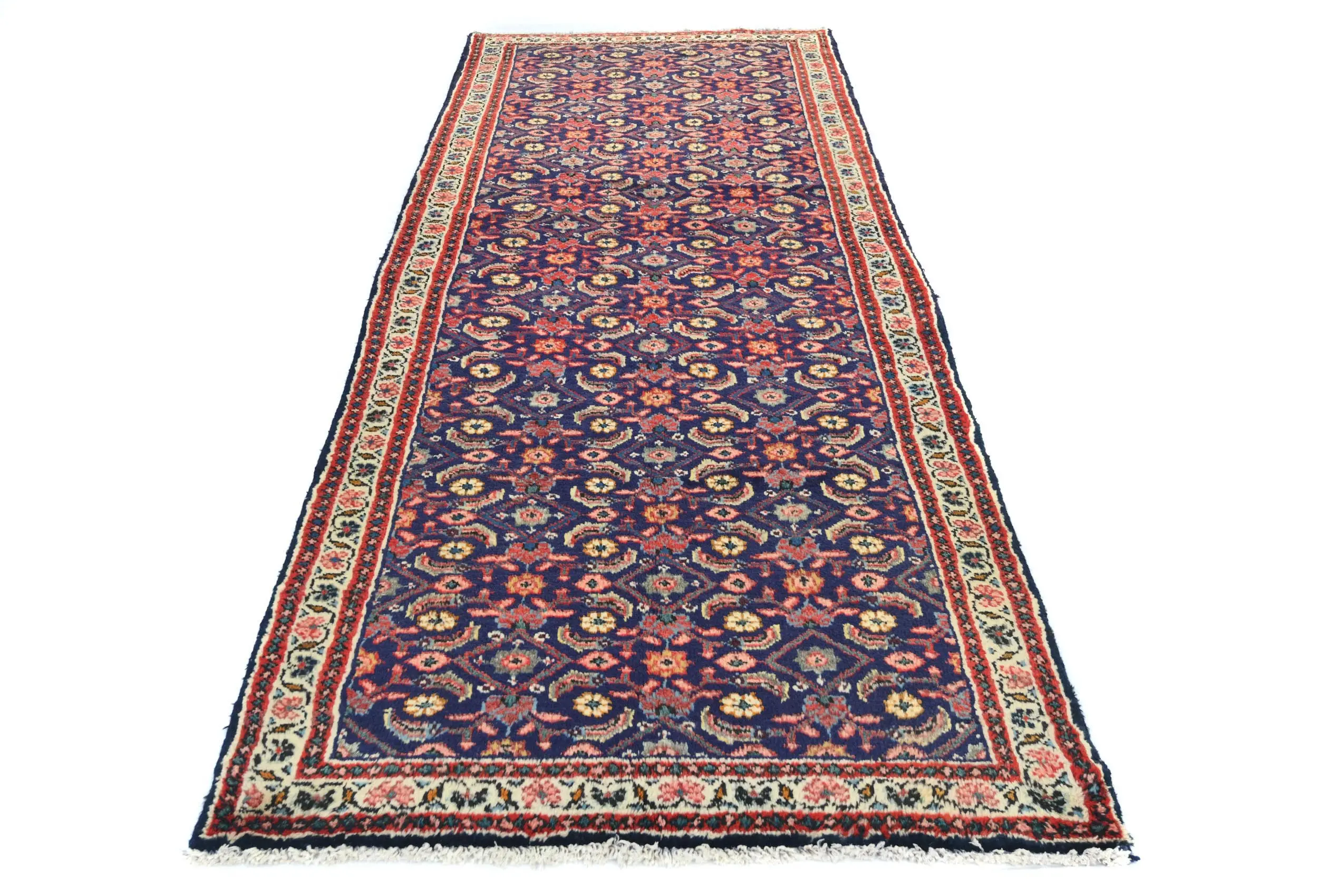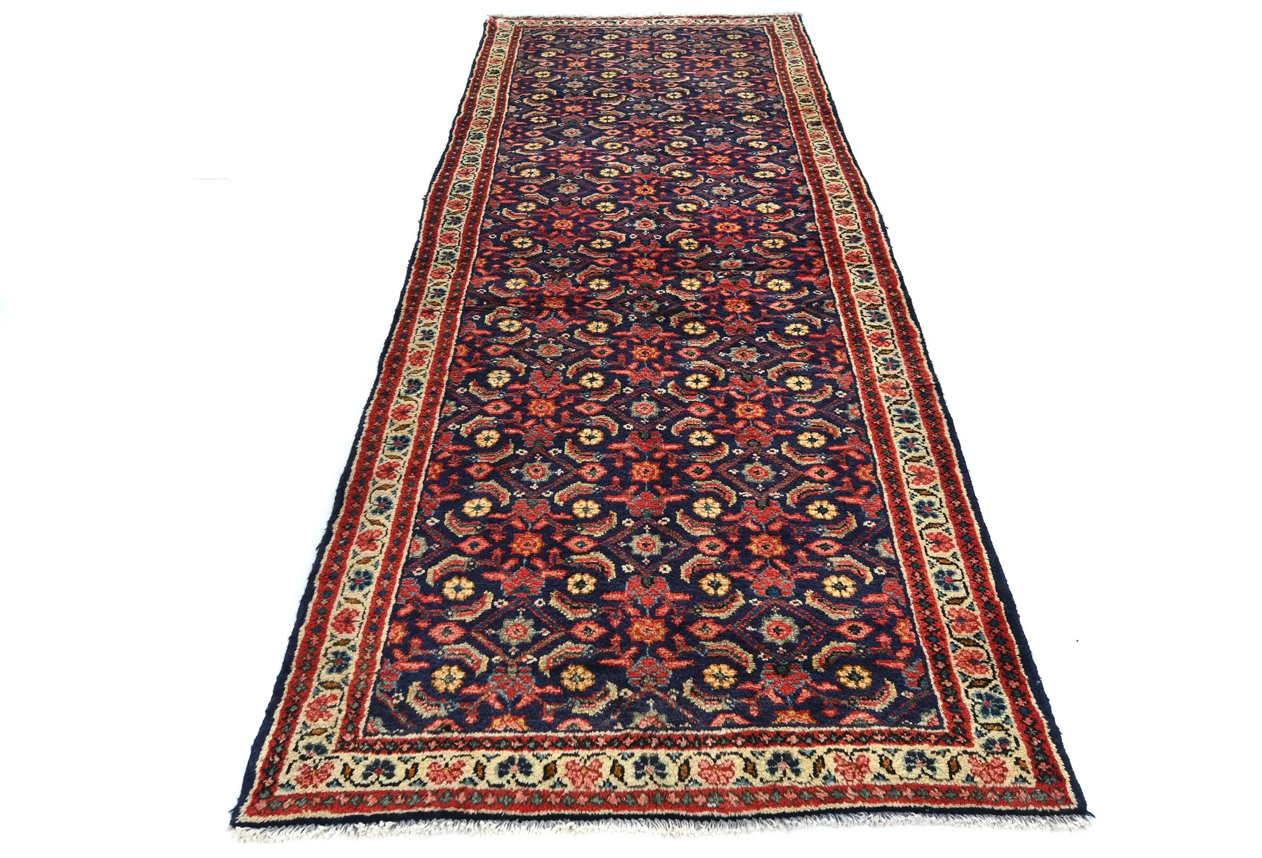 Hand Knotted vintage 3'6X9'9 Purple-navy Persian runner made with natural dyes (fine wool pile and cotton foundation), superior knot count, and appealing ancient designs. This Oriental runner never will go out of style and would be among your most valuable treasures.