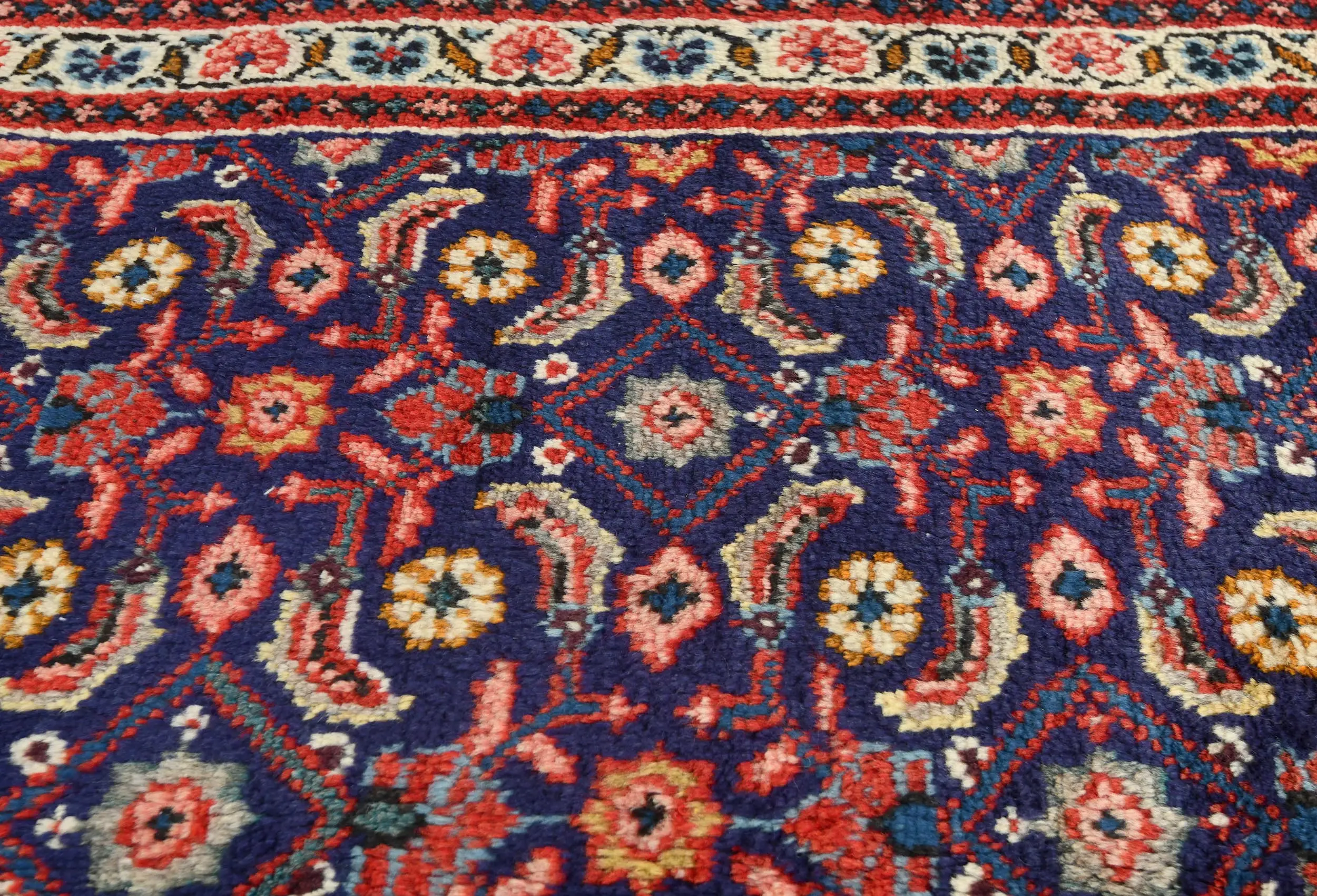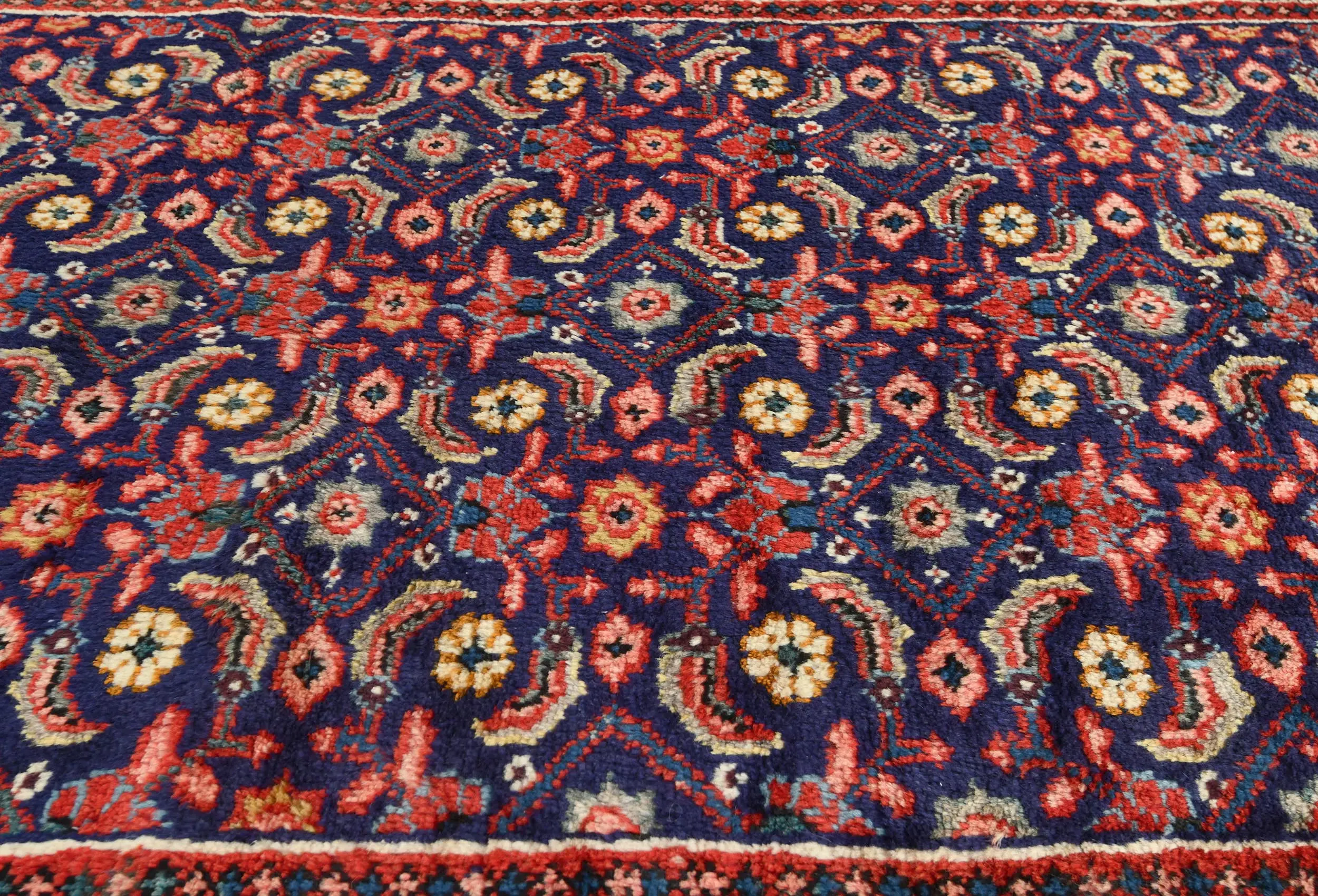 This authentic 3'6X9'9 Purple-navy vintage Persian runner was finely knotted by the hands of weavers influenced by a variety of amazing artistic designs, to recreate the aged look of the exceptional piece with a richness of color and embellished floral background field. What set this traditional Oriental area runner from the others are the material and dye used (wool pile and cotton foundation), knot count, antique designs, fantastic grades, and its regional historical connection: it has deep roots, from the story of the people who produced it to the meaning of the symbols and colors displayed across its canvas that have been praised for centuries. This classic home décor carpet will be completely cozy and inviting that never will go out of style! Also, this Oriental rug would be among your most valuable treasures, it is a great investment that increase in value over time, and it will last a lifetime because was woven with high-quality, all-natural wool; it won’t rip, tear, or shed. Eco-friendly, opulent yet affordable; this Persian runner will give you an extra pop of character to help define your home environment with luxury and warmth that will capture the eyes and attention of your audience (homeowners, designers, decorators, family and friends).