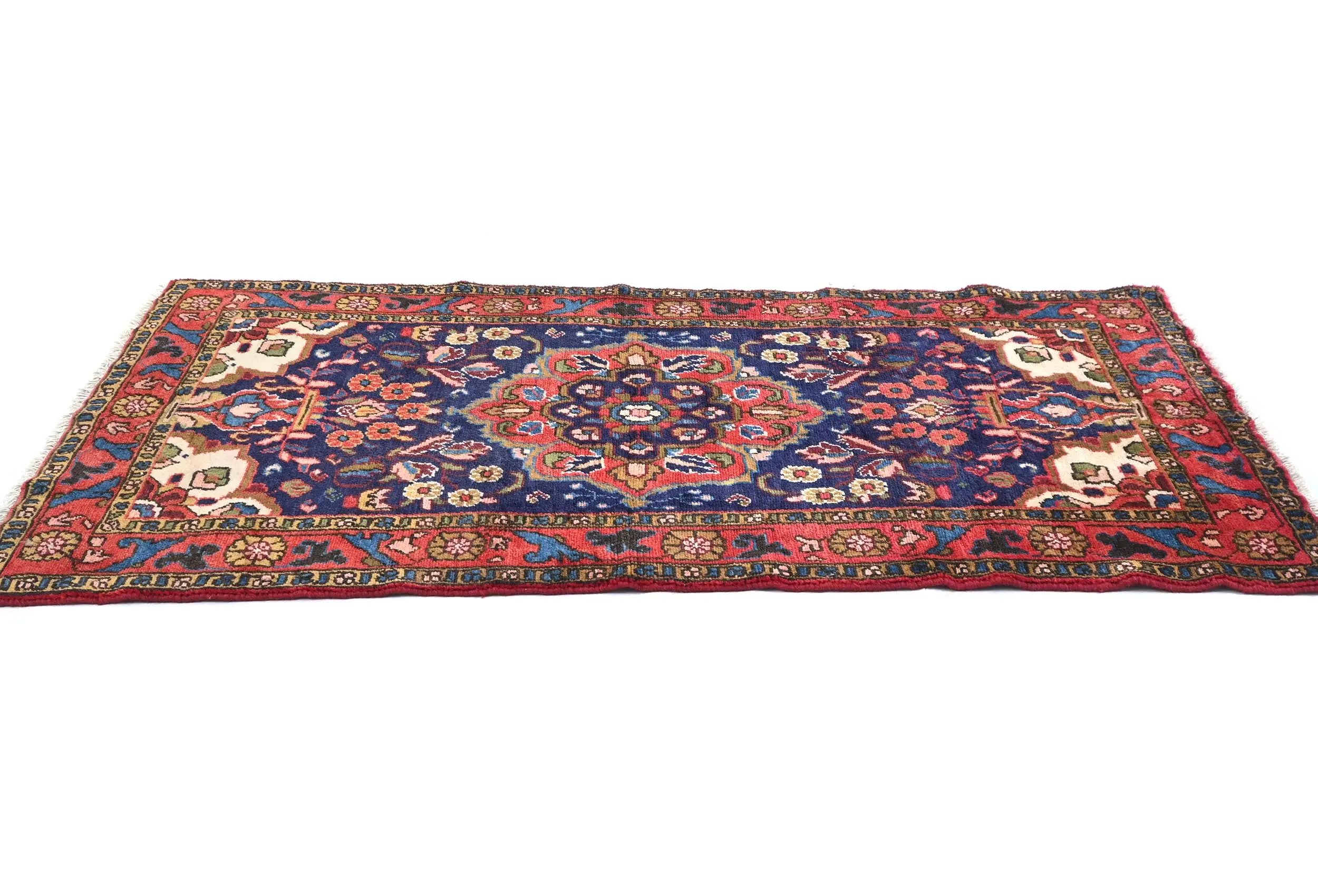 This original 3X6 purple-navy vintage Persian rug was crafted by the hands of skilled weavers enthused by a variety of lovely artistic designs, to recreate the aged look of the unique piece with a richness of color and beautifully elaborated background field. What set this tribal Oriental area rug from the others are the material and dye used (wool pile and cotton foundation), knot count, ancient designs, fantastic grades, and its regional historical connection: it has deep roots, from the story of the people who produced it to the meaning of the symbols and colors displayed across its canvas that have been praised for centuries. This home décor carpet will be completely cozy and inviting that never will go out of style! Also, this Oriental rug would be among your most valuable treasures, it is a great investment that increase in value over time, and it will last for generations because was woven with high-quality, all-natural wool; it won’t rip, tear, or shed. Environmentally friendly, opulent yet affordable; this Persian rug will give you a thorough amount of character to help define your living space with sophistication and warmth that will capture the eyes and attention of your audience (homeowners, designers, decorators, family and friends). RT-7332