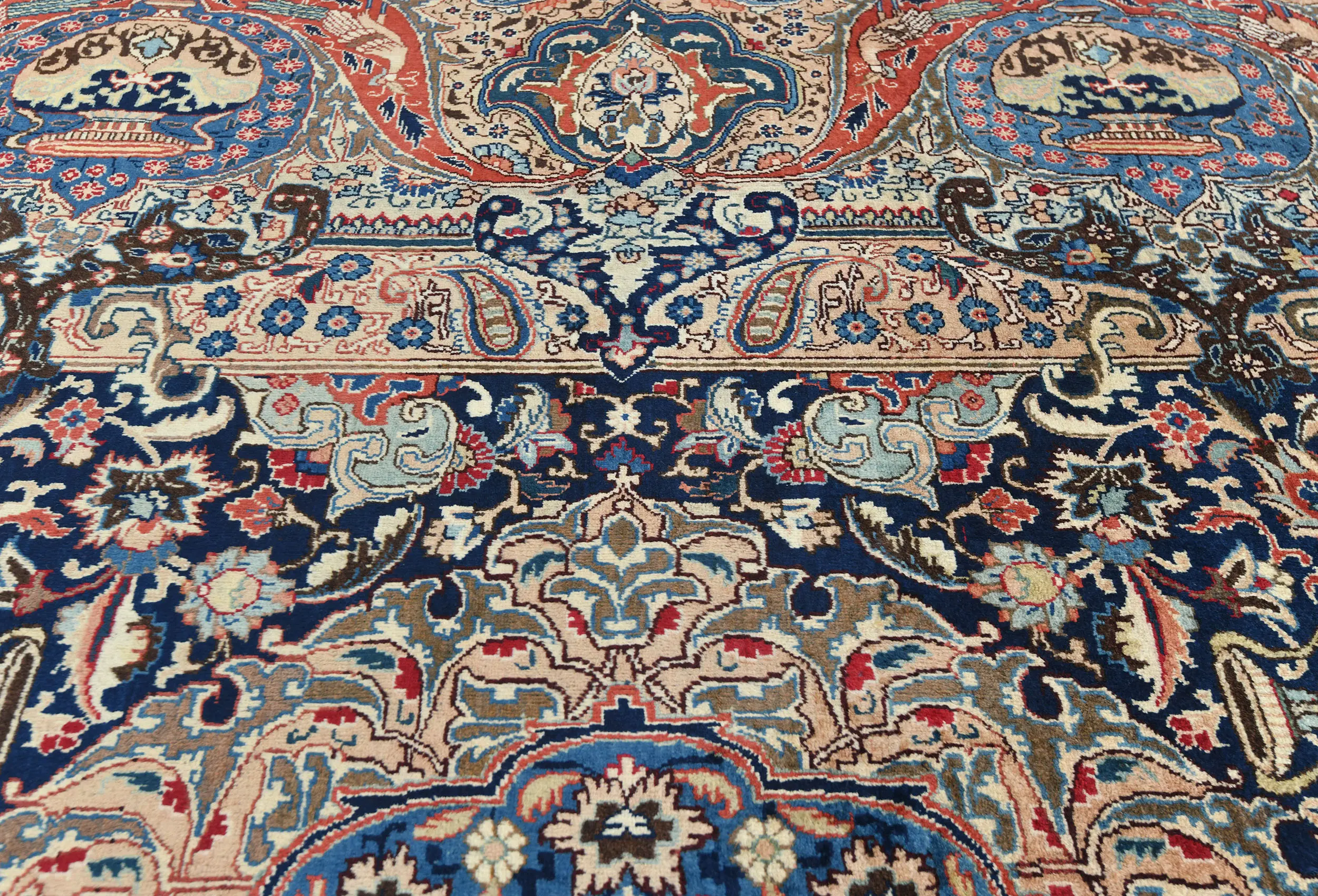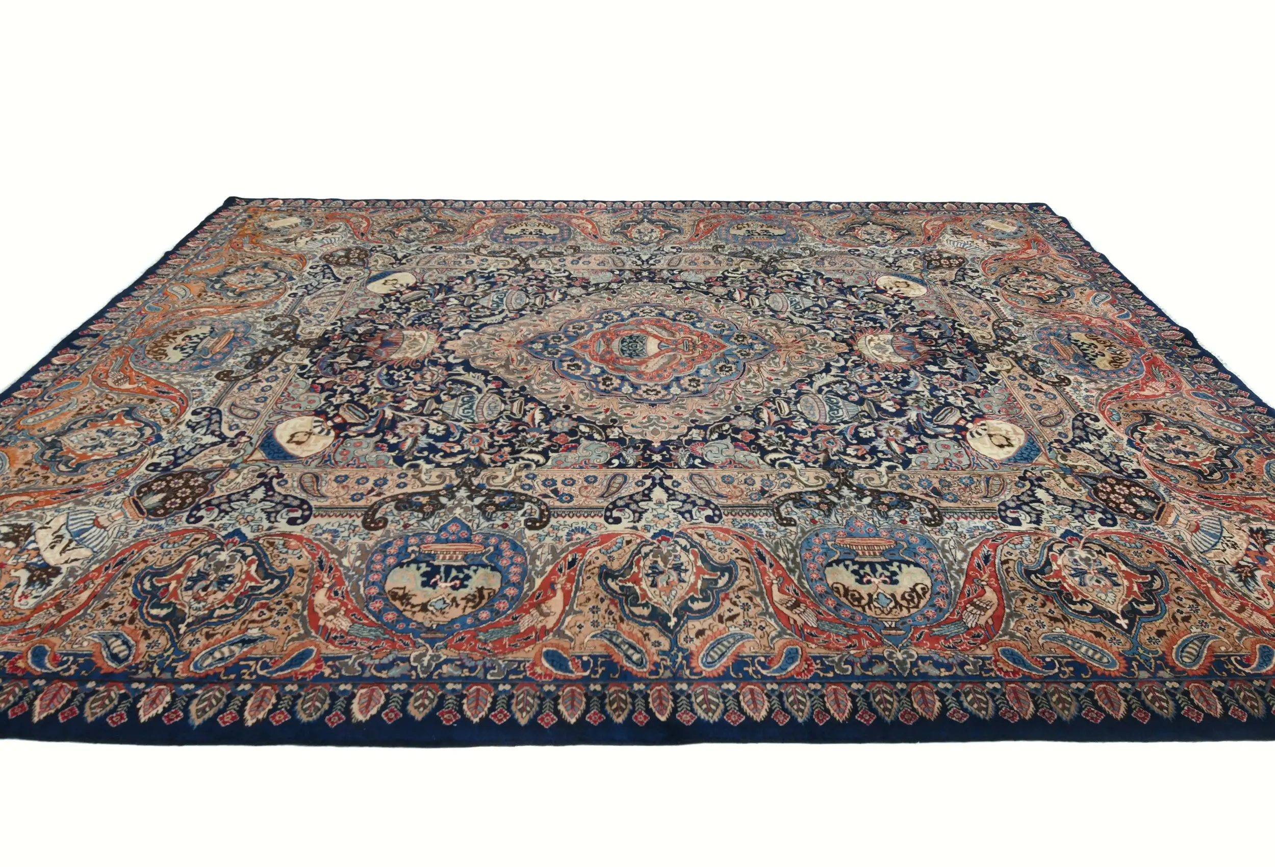 This authentic 9'8X12'4 purple-navy vintage Persian rug was finely knotted by the hands of weavers influenced by a variety of amazing artistic designs, to recreate the aged look of the exceptional piece with a richness of color and embellished floral background field. What set this traditional Oriental area rug from the others are the material and dye used (wool pile and cotton foundation), knot count, antique designs, fantastic grades, and its regional historical connection: it has deep roots, from the story of the people who produced it to the meaning of the symbols and colors displayed across its canvas that have been praised for centuries. This classic home décor carpet will be completely cozy and inviting that never will go out of style! Also, this Oriental rug would be among your most valuable treasures, it is a great investment that increase in value over time, and it will last a lifetime because was woven with high-quality, all-natural wool; it won’t rip, tear, or shed. Eco-friendly, opulent yet affordable; this Persian rug will give you an extra pop of character to help define your home environment with luxury and warmth that will capture the eyes and attention of your audience (homeowners, designers, decorators, family and friends). RT- 7426