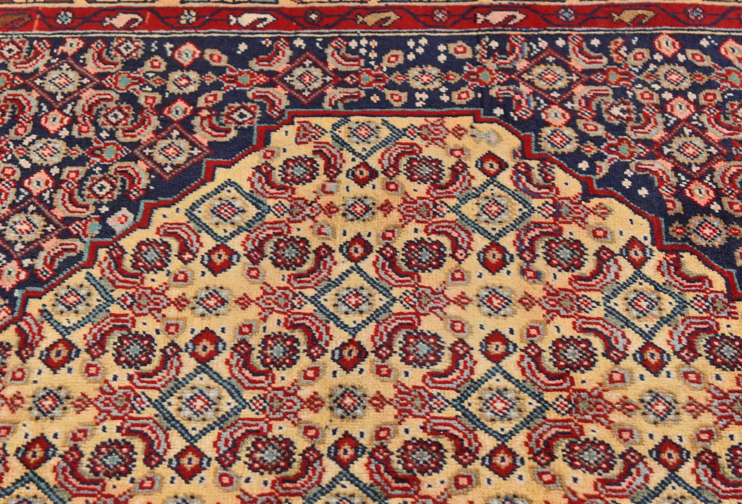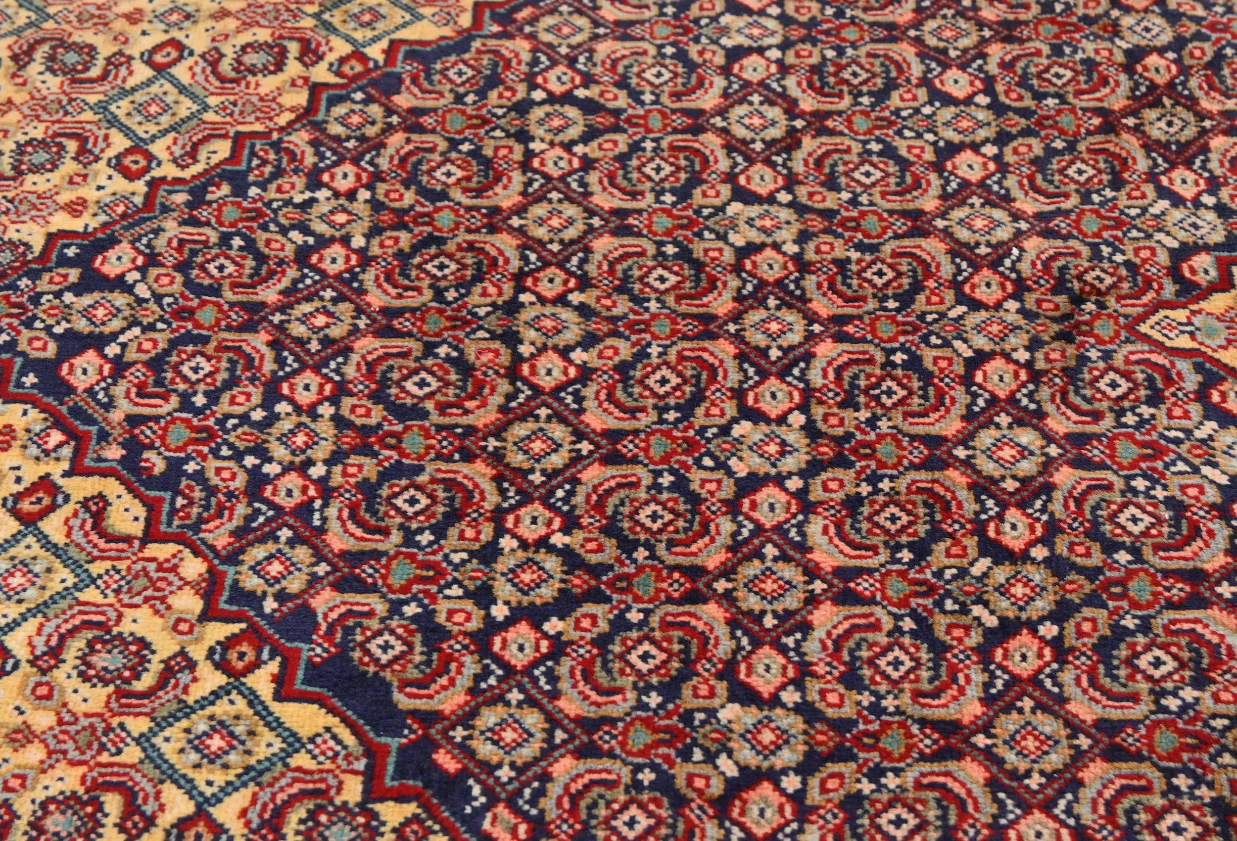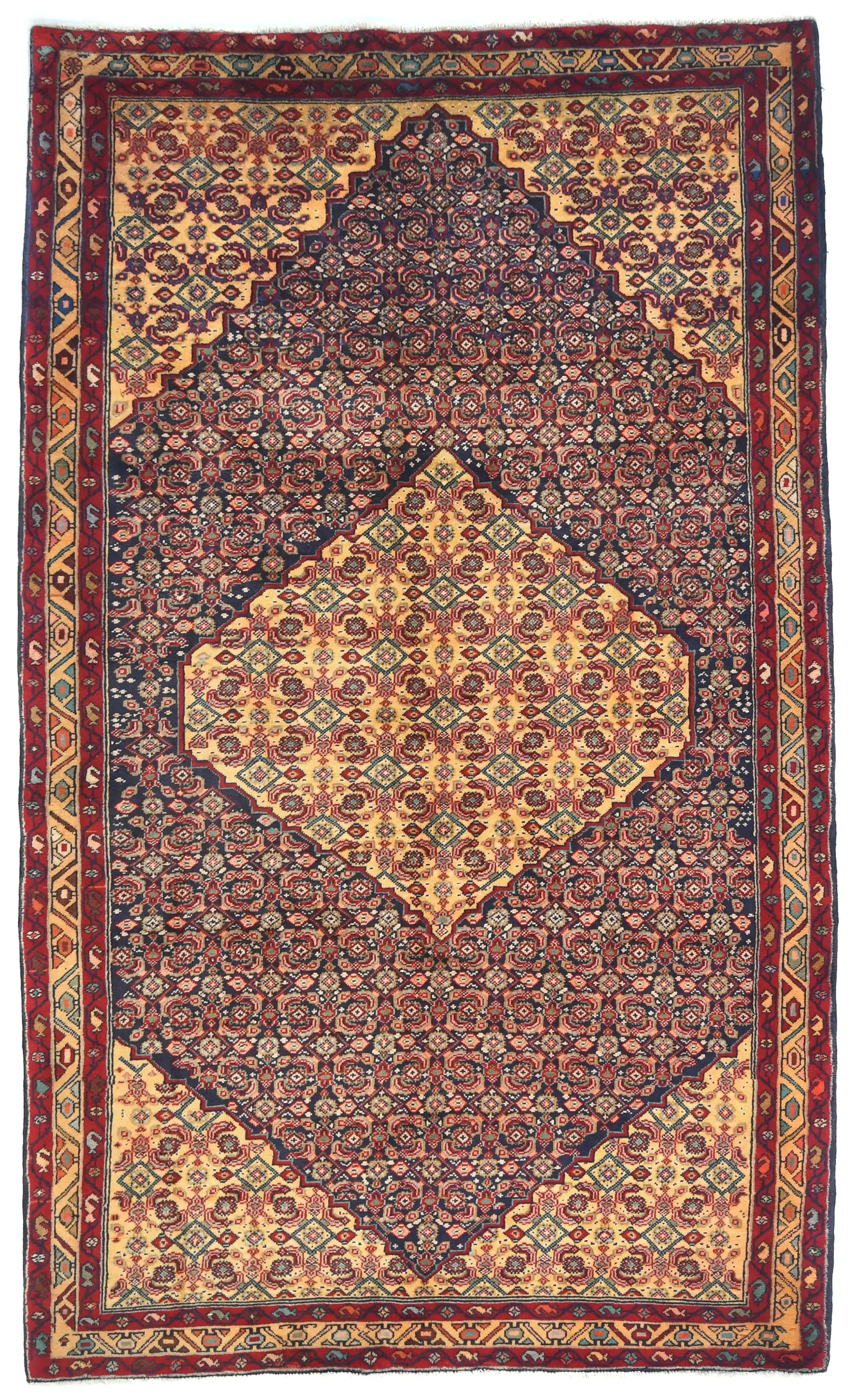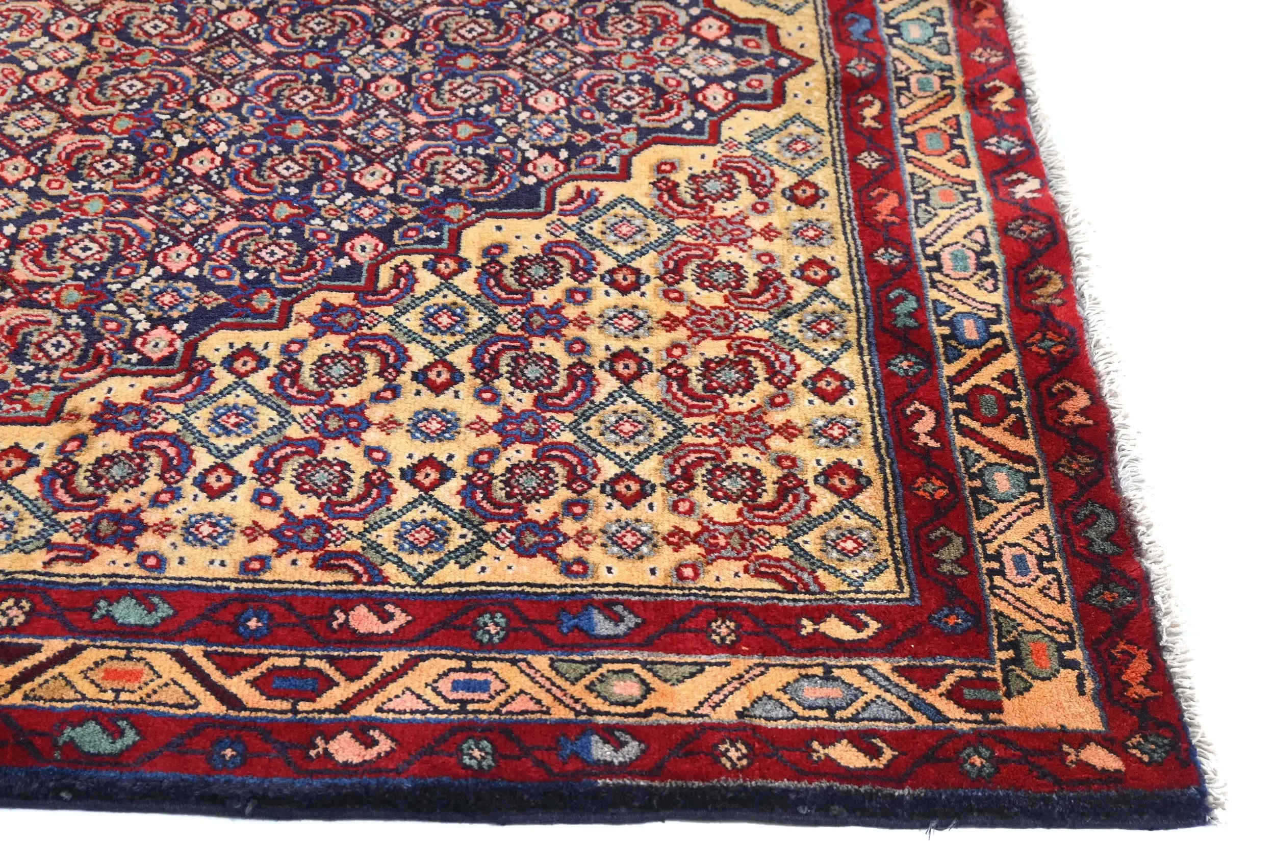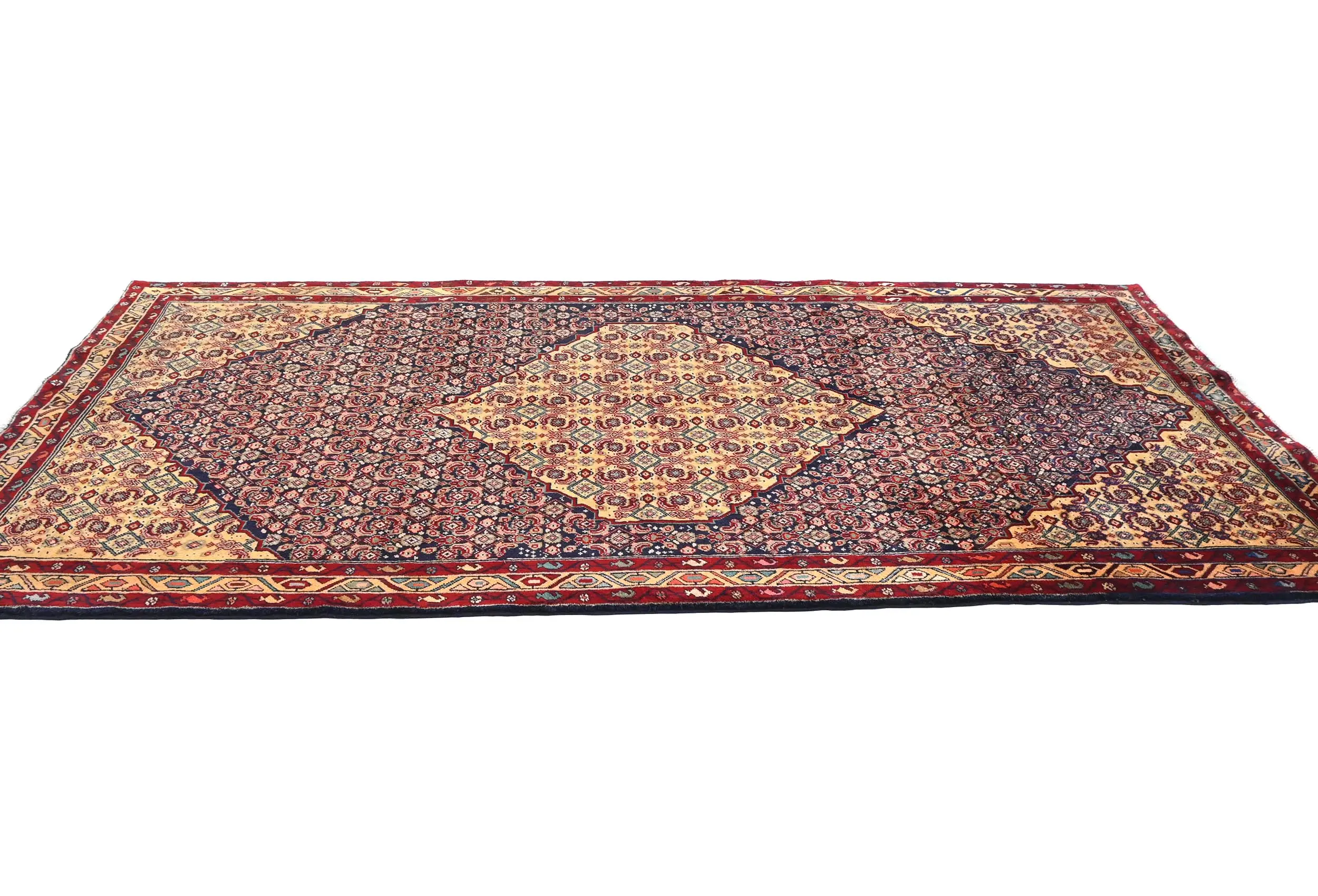 This genuine 5X9 purple-navy vintage Persian rug was made by the hands of gifted weavers inspired by a variety of spectacular artistic designs, to recreate the aged look of the original piece with a richness of color and ornately patterned background field. What set this geometric Oriental area rug from the others are the material and dye used (wool pile and cotton foundation), knot count, ancient designs, fantastic grades, and its regional historical connection: it has deep roots, from the story of the people who produced it to the meaning of the symbols and colors displayed across its canvas that have been praised for centuries. This home decor carpet will be completely cozy and inviting that never will go out of style! Also, this Oriental rug would be among your most valuable treasures, it is a great investment that accrues value over time, and it will last for generations because was woven with high-quality, all-natural wool; it won’t rip, tear, or shed. Environmentally friendly, opulent yet affordable; this Persian rug will give you a thorough amount of character to help define your living space with elegance and warmth that will capture the eyes and attention of your audience (homeowners, designers, decorators, family and friends). RT-9971