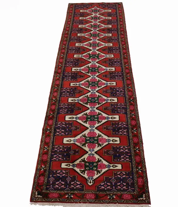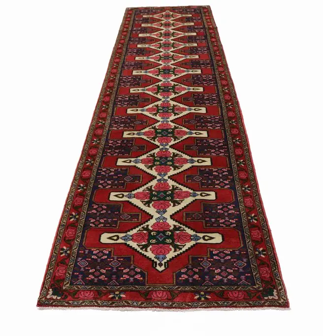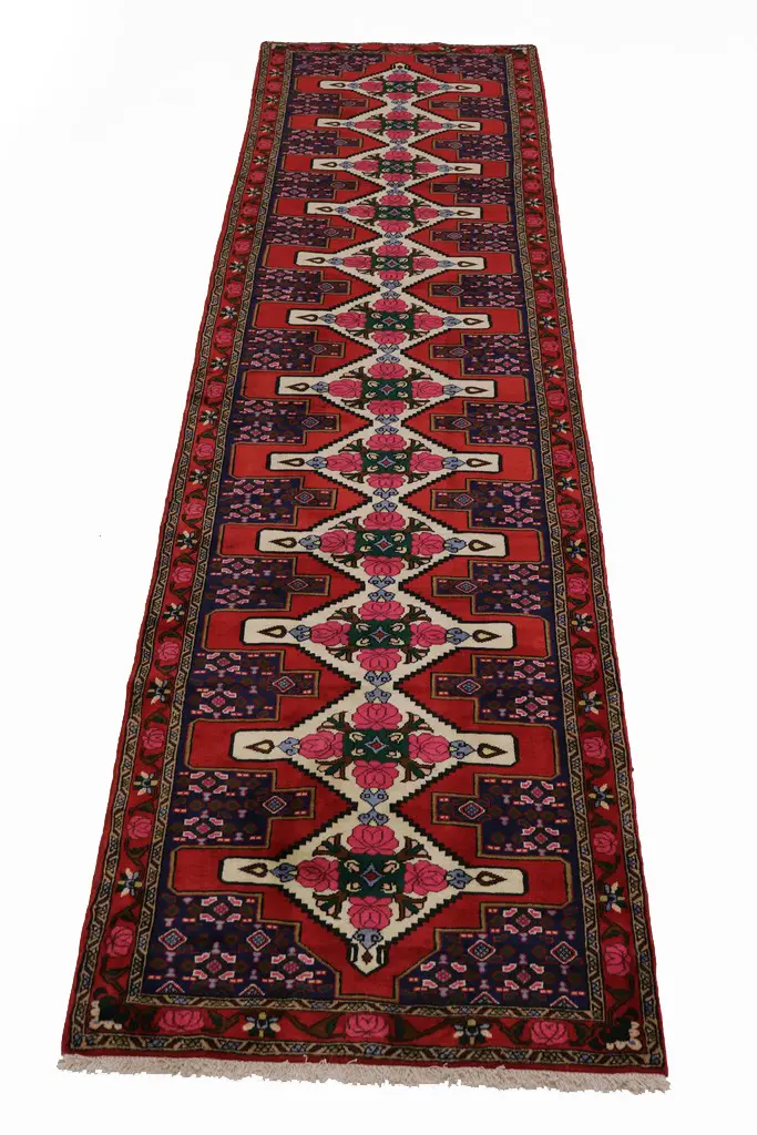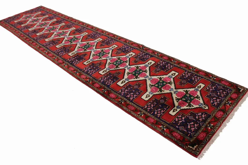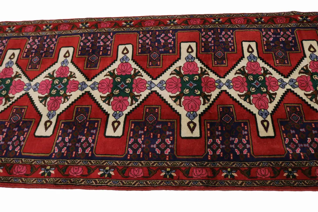 This genuine 3X13 red vintage Persian runner was made by the hands of gifted weavers inspired by a variety of spectacular artistic designs, to recreate the aged look of the original piece with a richness of color and ornately patterned background field. What set this geometric Oriental area runner from the others are the material and dye used (wool pile and cotton foundation), knot count, ancient designs, fantastic grades, and its regional historical connection: it has deep roots, from the story of the people who produced it to the meaning of the symbols and colors displayed across its canvas that have been praised for centuries. This home decor carpet will be completely cozy and inviting that never will go out of style! Also, this Oriental runner would be among your most valuable treasures, it is a great investment that accrues value over time, and it will last for generations because was woven with high-quality, all-natural wool; it won't rip, tear, or shed. Environmentally friendly, opulent yet affordable; this Persian rug will give you a thorough amount of character to help define your living space with elegance and warmth that will capture the eyes and attention of your audience (homeowners, designers, decorators, family and friends). RT-1266