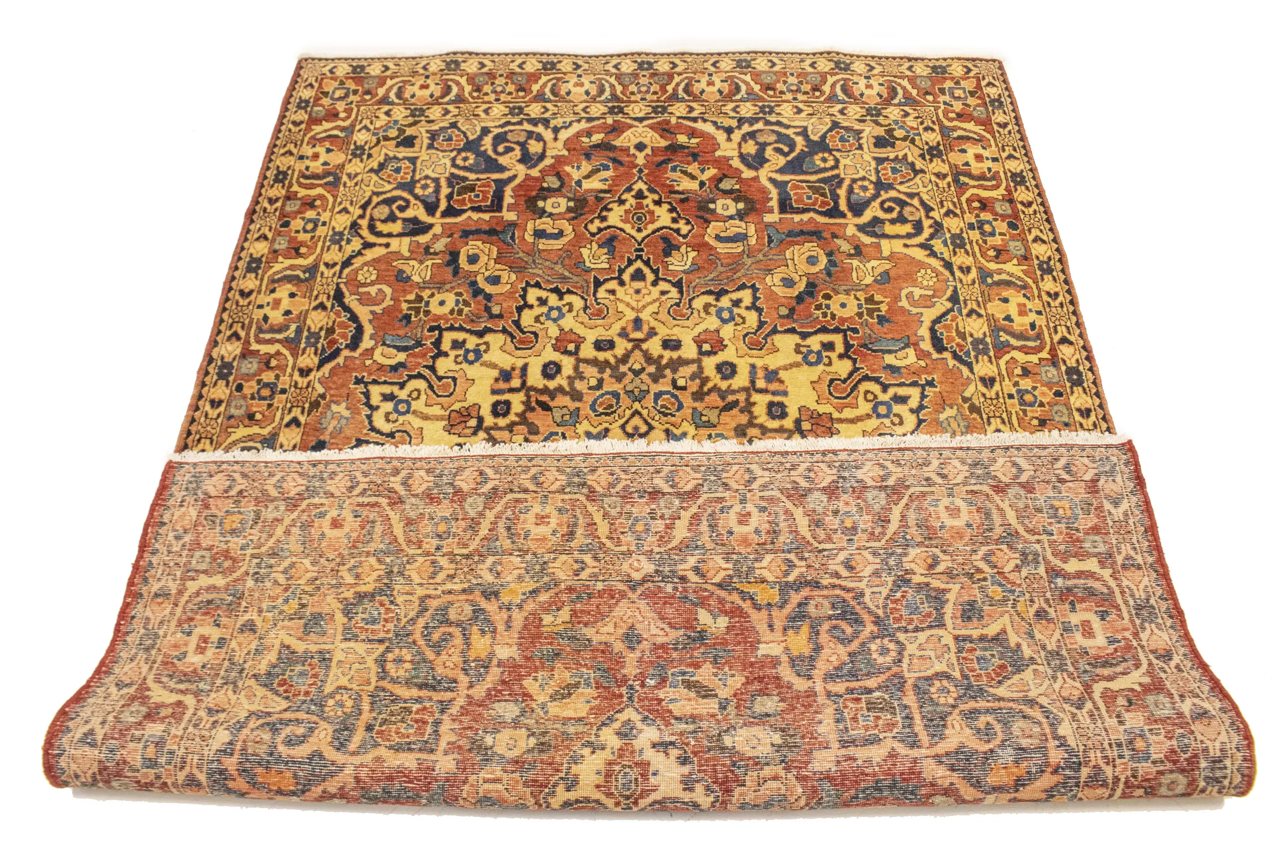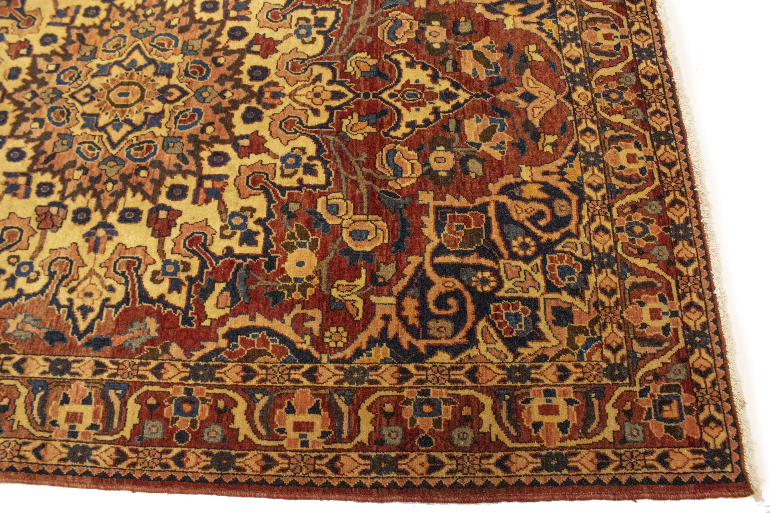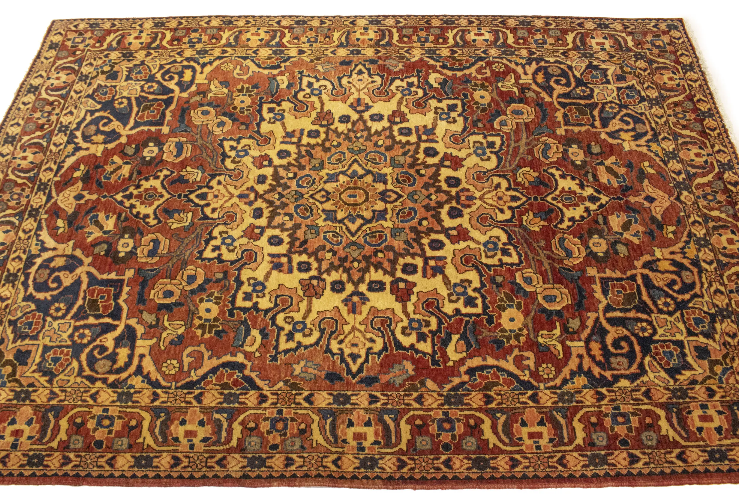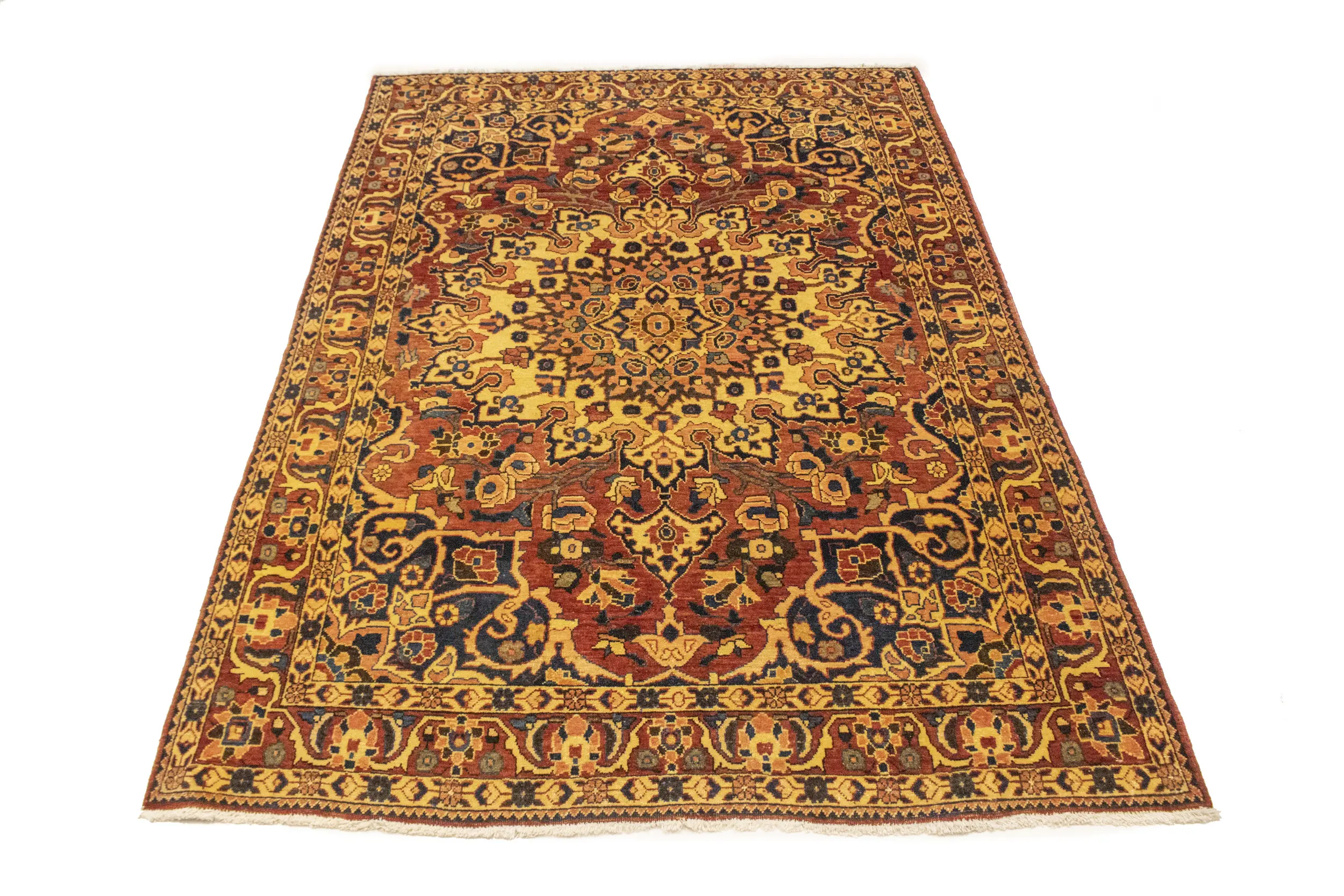 This authentic 5X7 red vintage Persian rug was masterly knotted by the hands of weavers inspired by a variety of wonderful artistic designs, to recreate the aged look of the original piece with a richness of color and intricate patterned floral background field. What set this traditional Oriental area rug from the others are the material and dye used (wool pile and cotton foundation), knot count, antique designs, fantastic grades, and its regional historical connection: it has deep roots, from the story of the people who produced it to the meaning of the symbols and colors displayed across its canvas that have been praised for centuries. This classic home décor carpet will be completely cozy and inviting that never will go out of style!