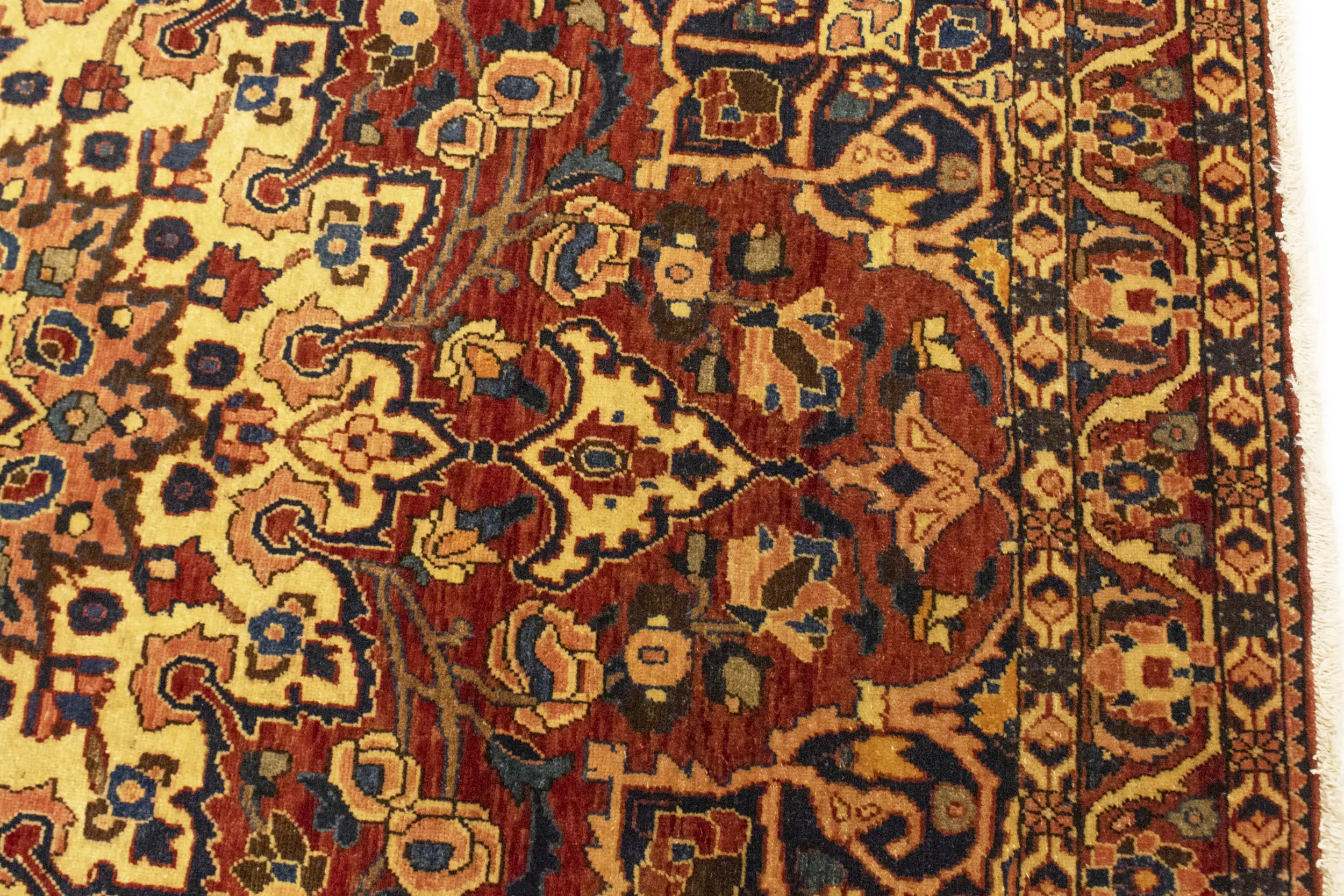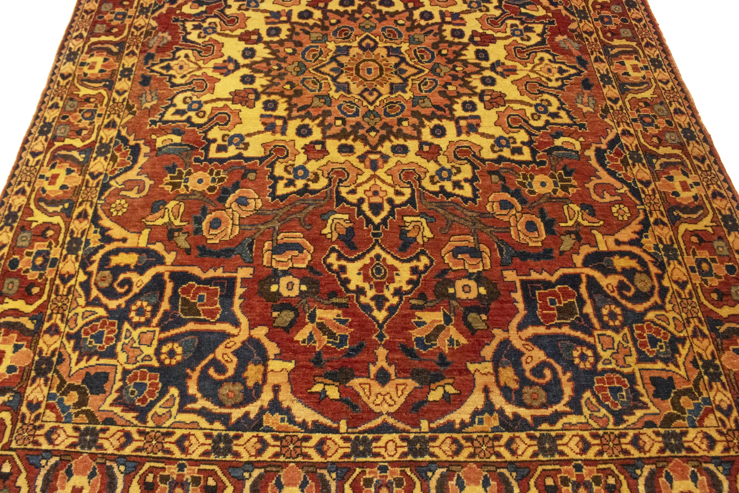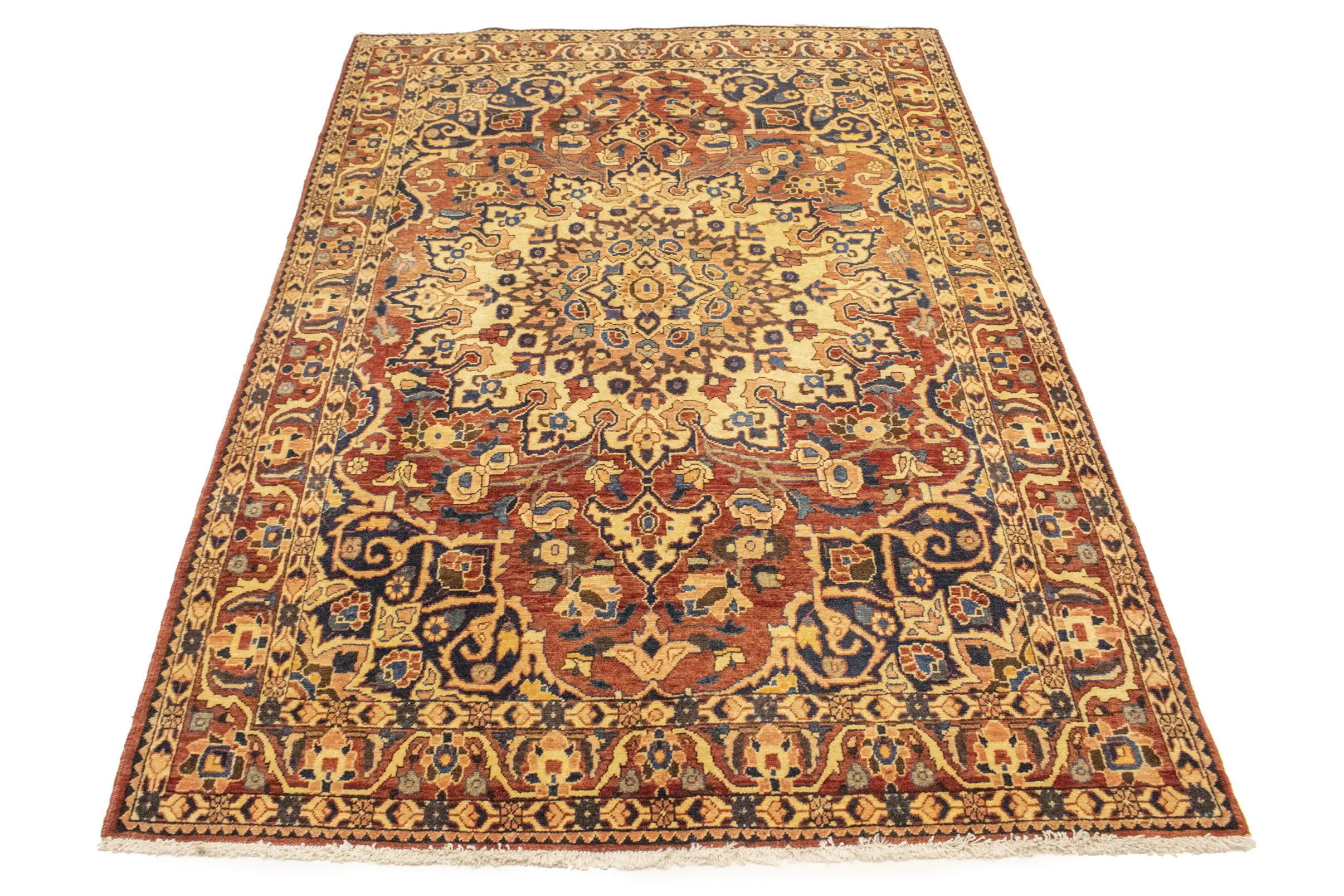 This authentic 5X7 red vintage Persian rug was masterly knotted by the hands of weavers inspired by a variety of wonderful artistic designs, to recreate the aged look of the original piece with a richness of color and intricate patterned floral background field. What set this traditional Oriental area rug from the others are the material and dye used (wool pile and cotton foundation), knot count, antique designs, fantastic grades, and its regional historical connection: it has deep roots, from the story of the people who produced it to the meaning of the symbols and colors displayed across its canvas that have been praised for centuries. This classic home décor carpet will be completely cozy and inviting that never will go out of style!