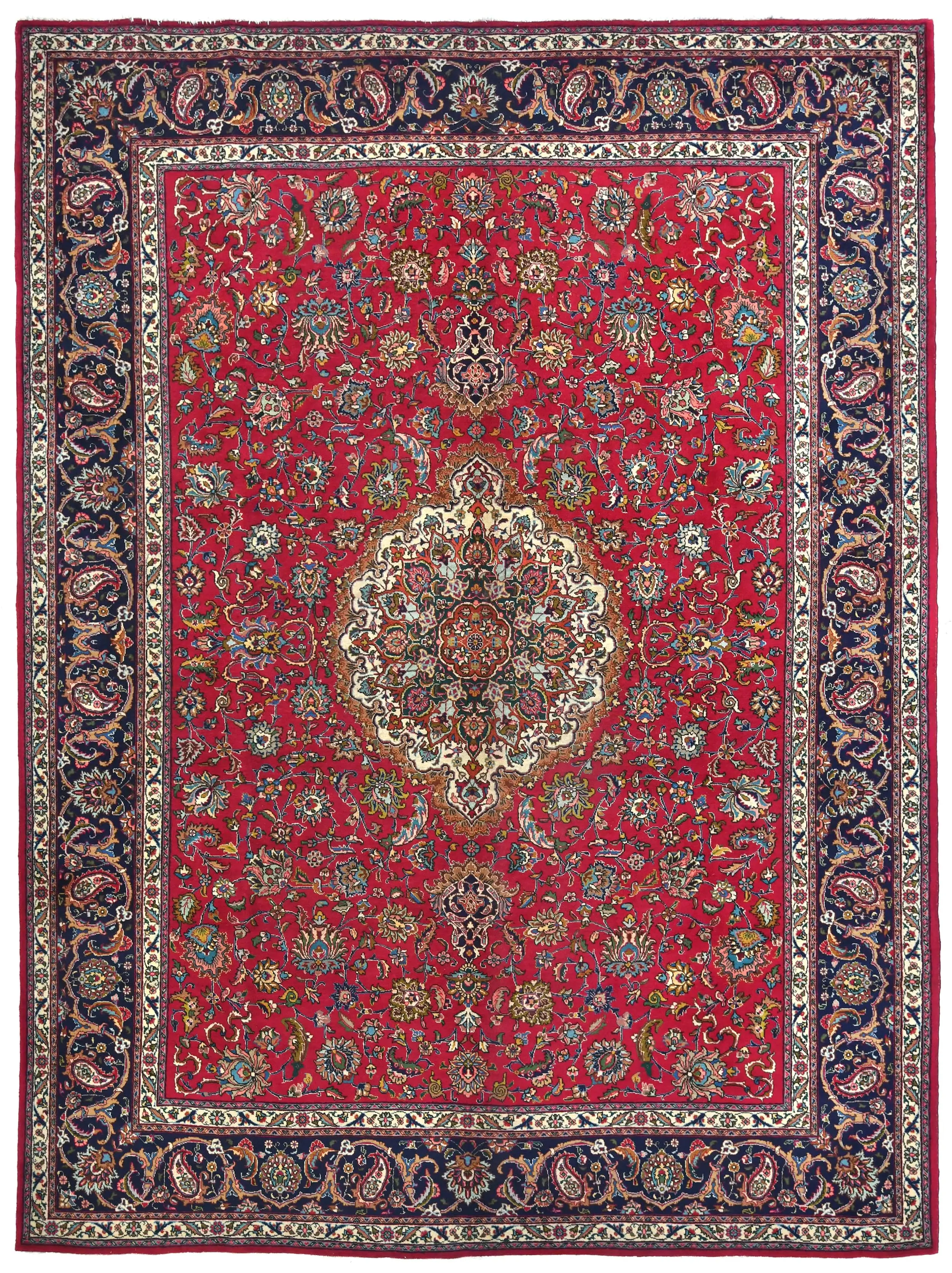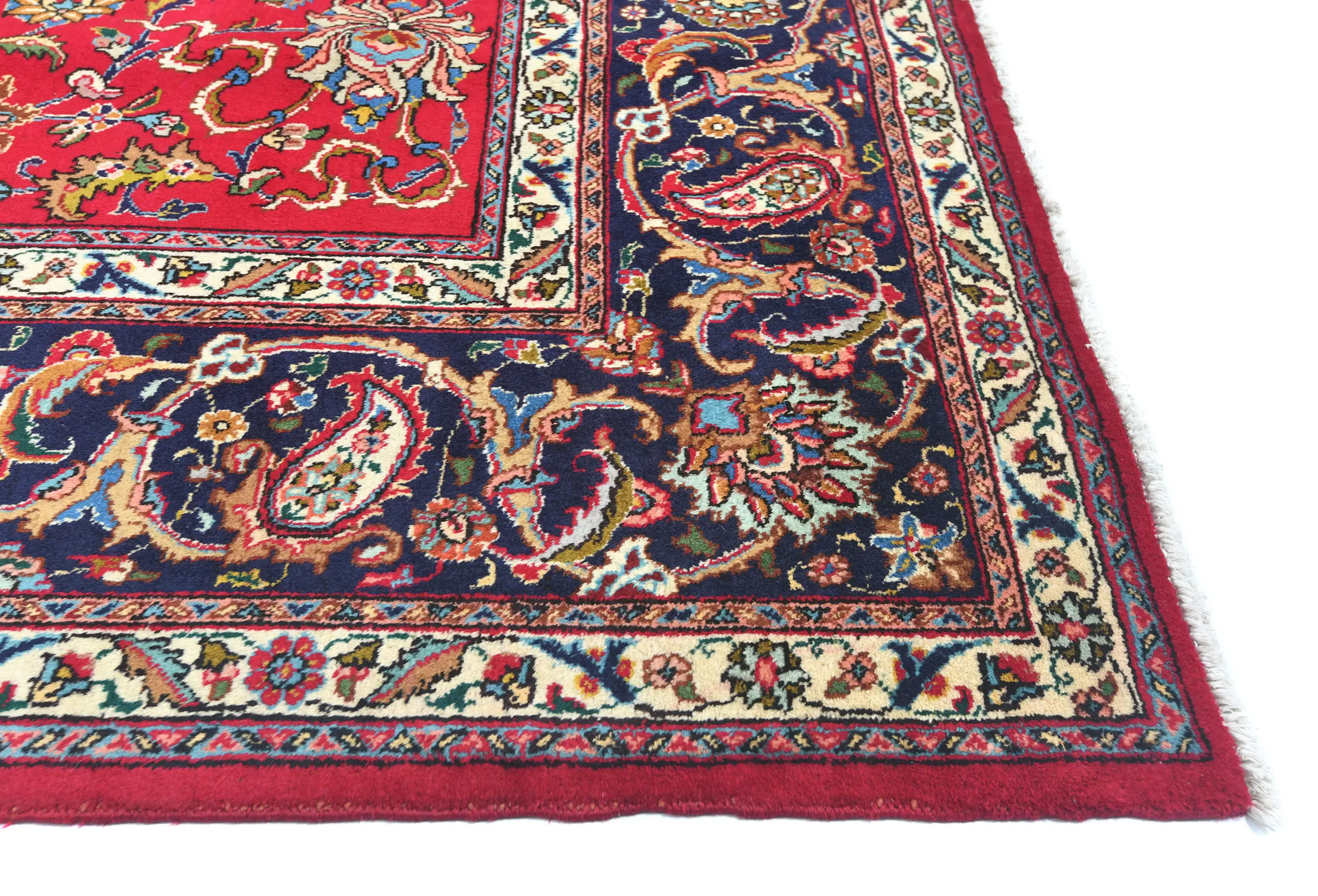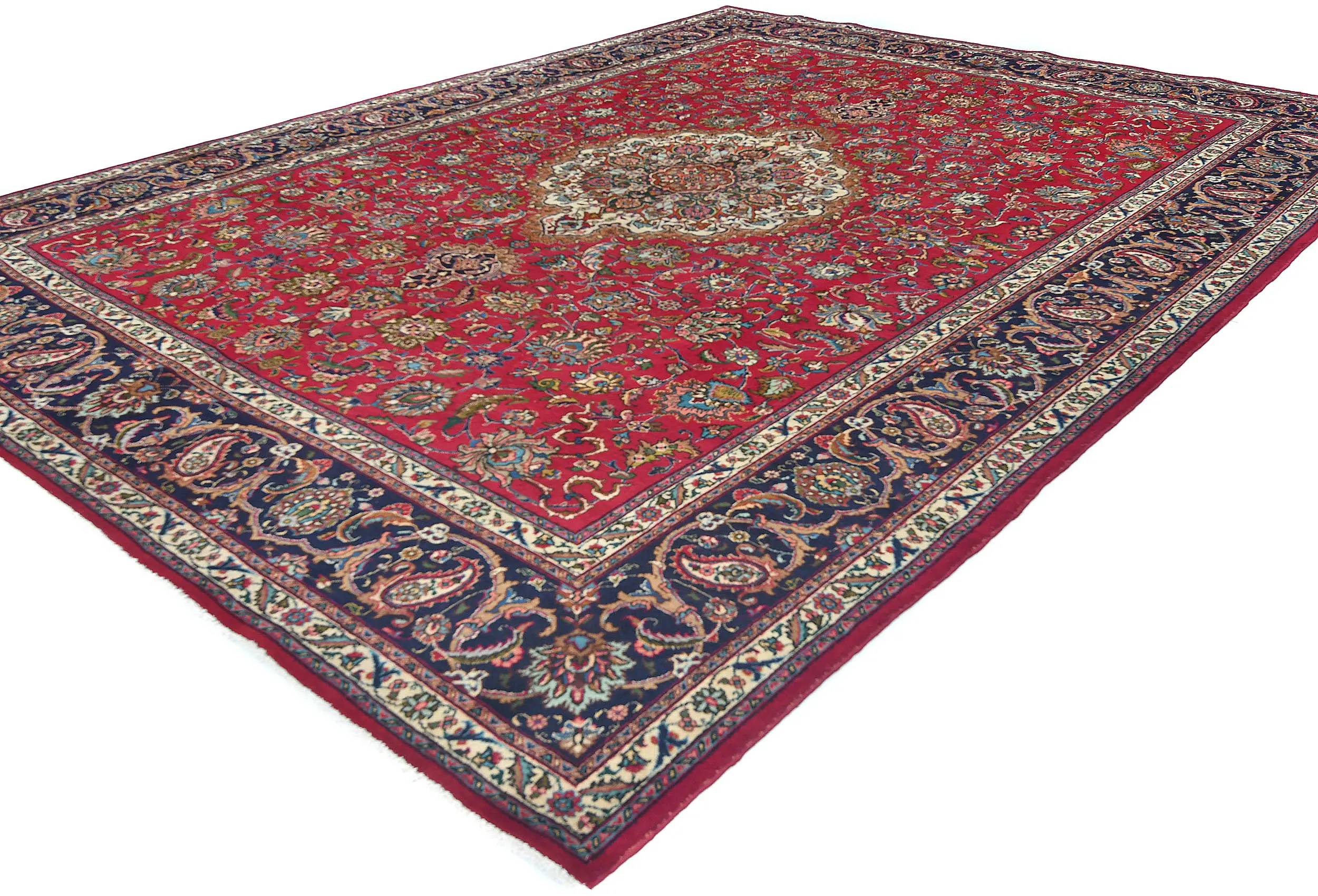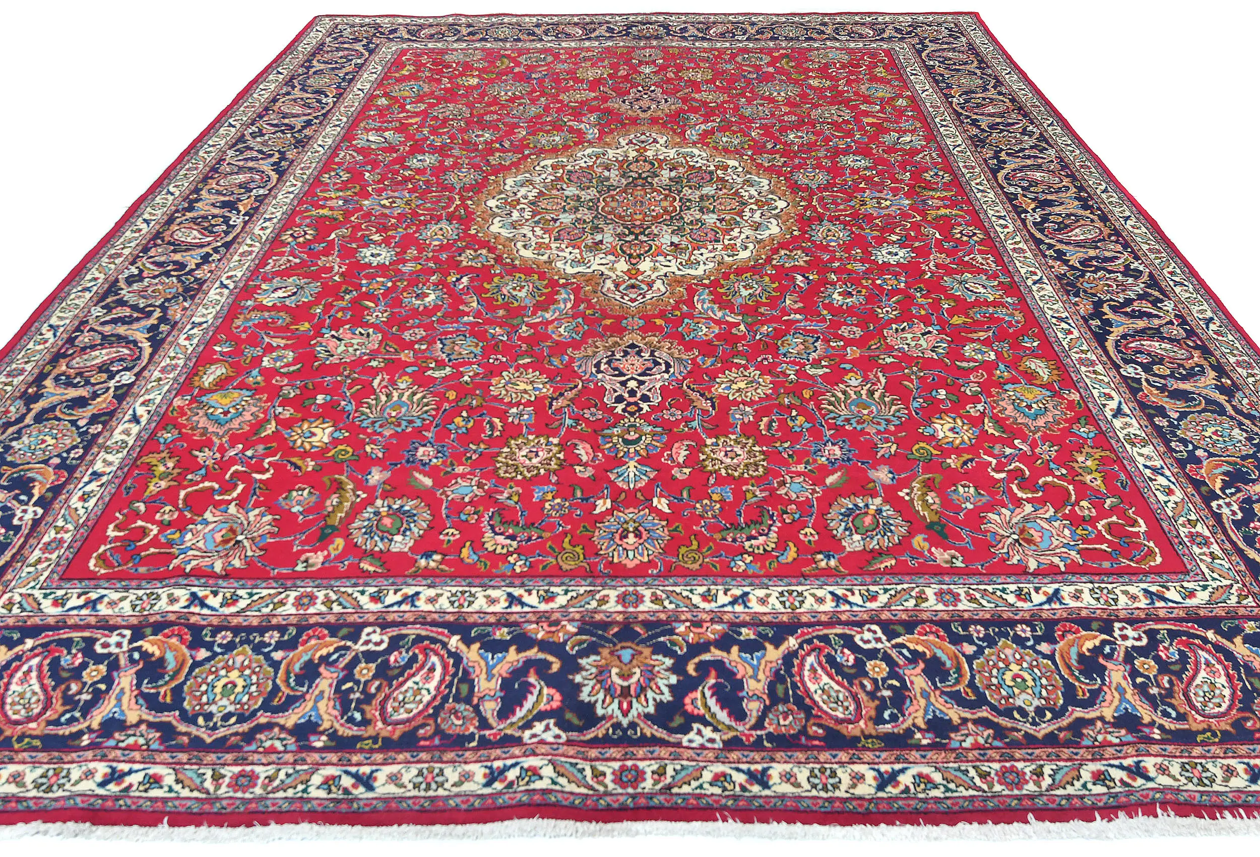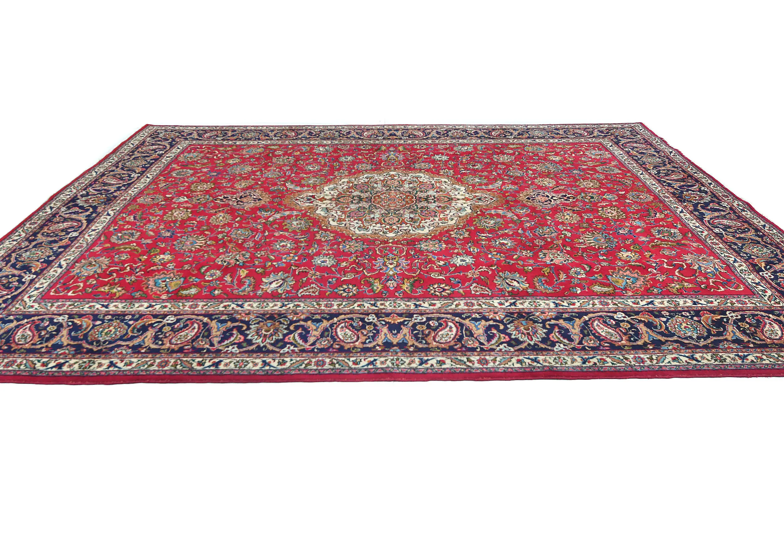 This original 10X13 red vintage Persian rug was well-constructed by the hands of master weavers motivated by a variety of stunning artistic designs, to recreate the aged look of the exceptional piece with a richness of color and developed decorative floral background field. What set this traditional Oriental area rug from the others are the material and dye used (wool pile and cotton foundation), knot count, ancient designs, fantastic grades, and its regional historical connection: it has deep roots, from the story of the people who produced it to the meaning of the symbols and colors displayed across its canvas that have been praised for centuries. This classic home décor carpet will be completely cozy and inviting that never will go out of style! Also, this Oriental rug would be among your most valuable treasures, it is a great investment that increase in value over time, and it will last a lifetime because was woven with high-quality, all-natural wool; it won’t rip, tear, or shed. Eco-friendly, opulent yet affordable; this Persian rug will give you an extra pop of character to help define your home environment with elegance and warmth that will capture the eyes and attention of your audience (homeowners, designers, decorators, family and friends).