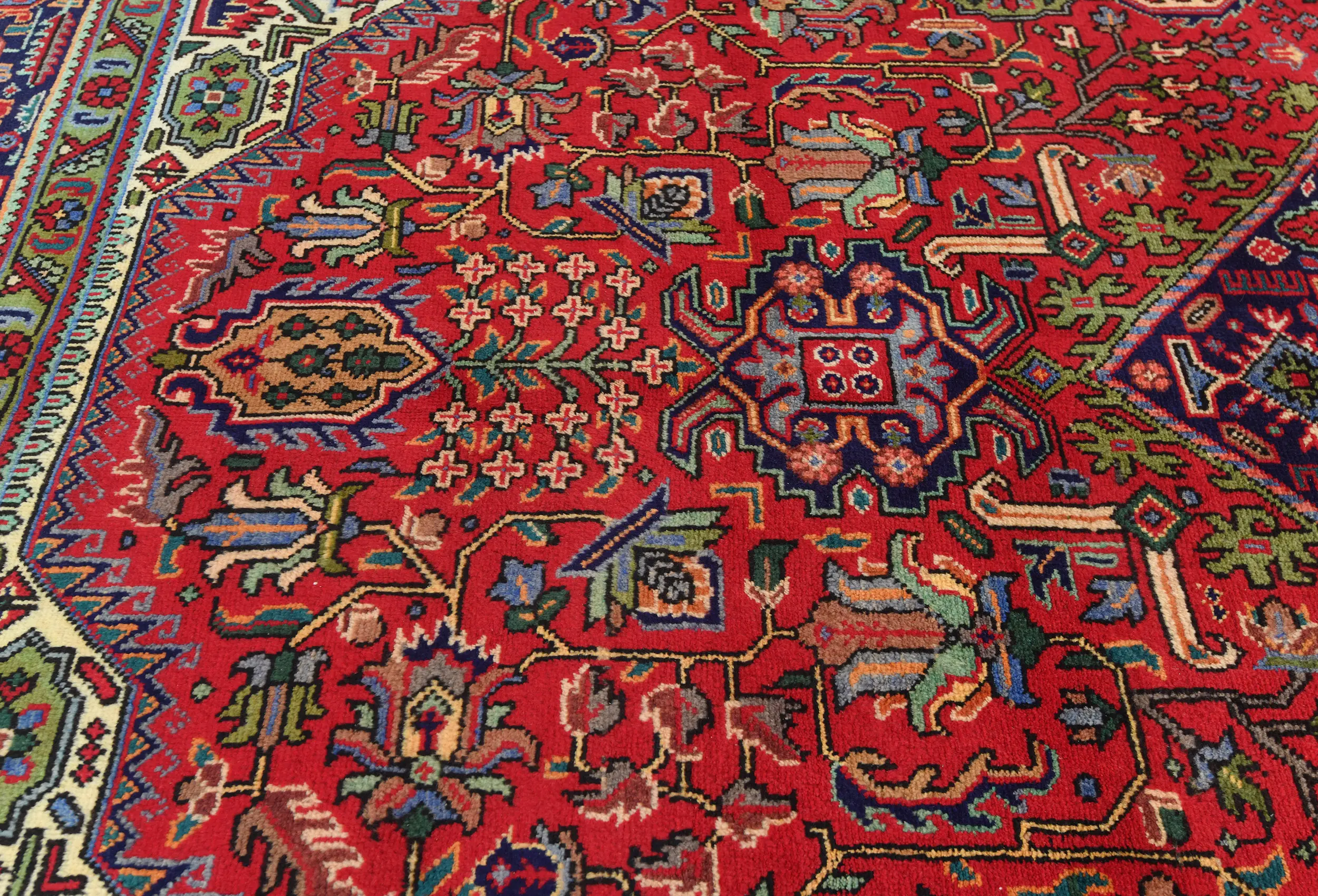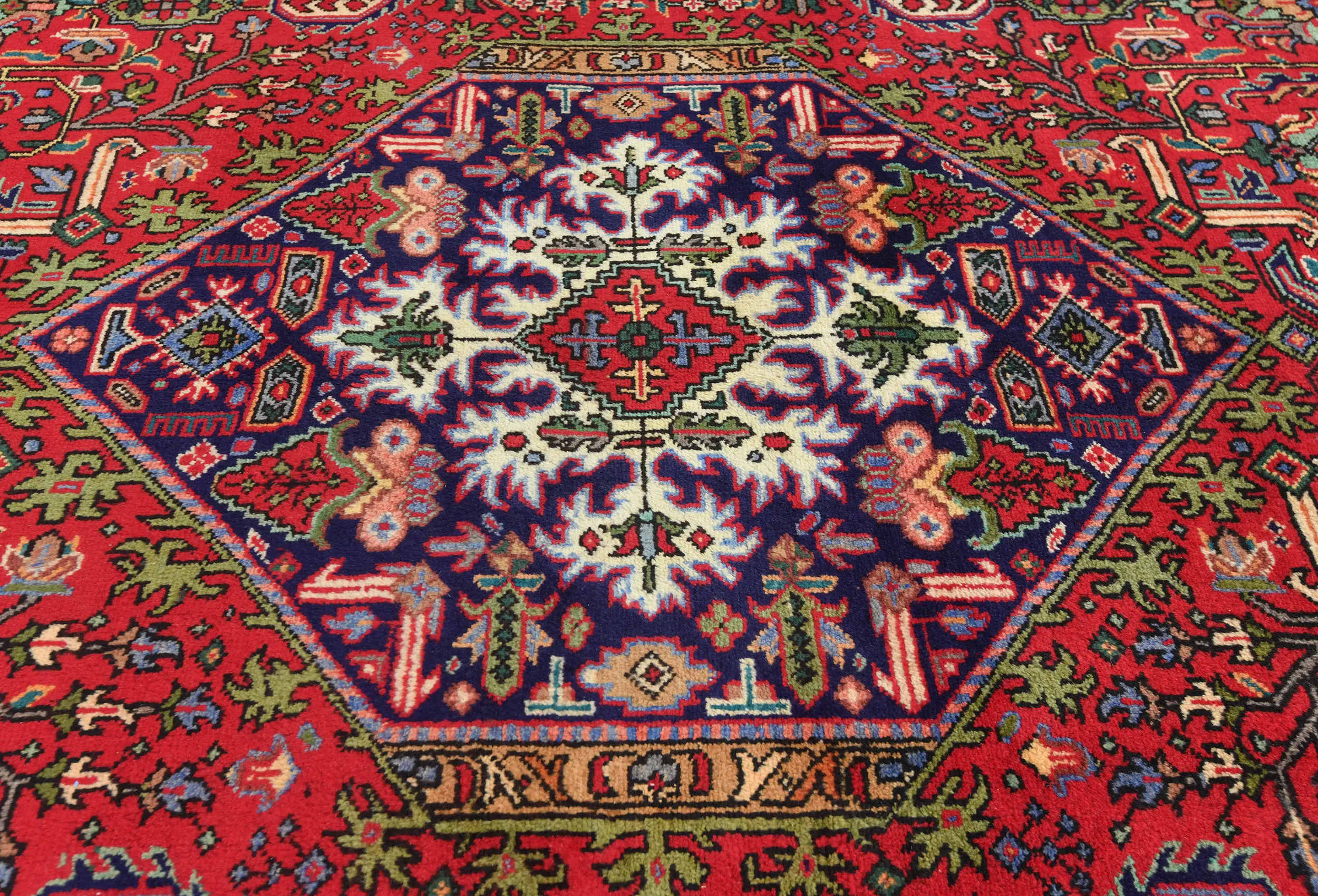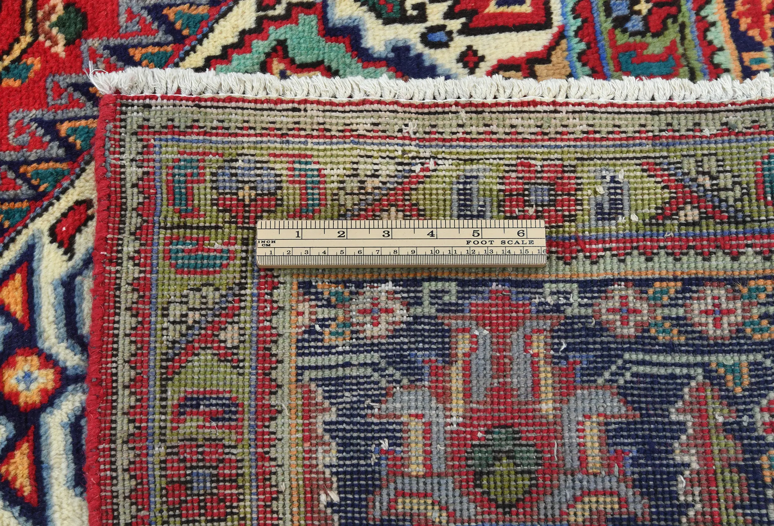 - Rich palette of red, navy blue, ivory, green, burgundy, gold, and sky blue with abrash character