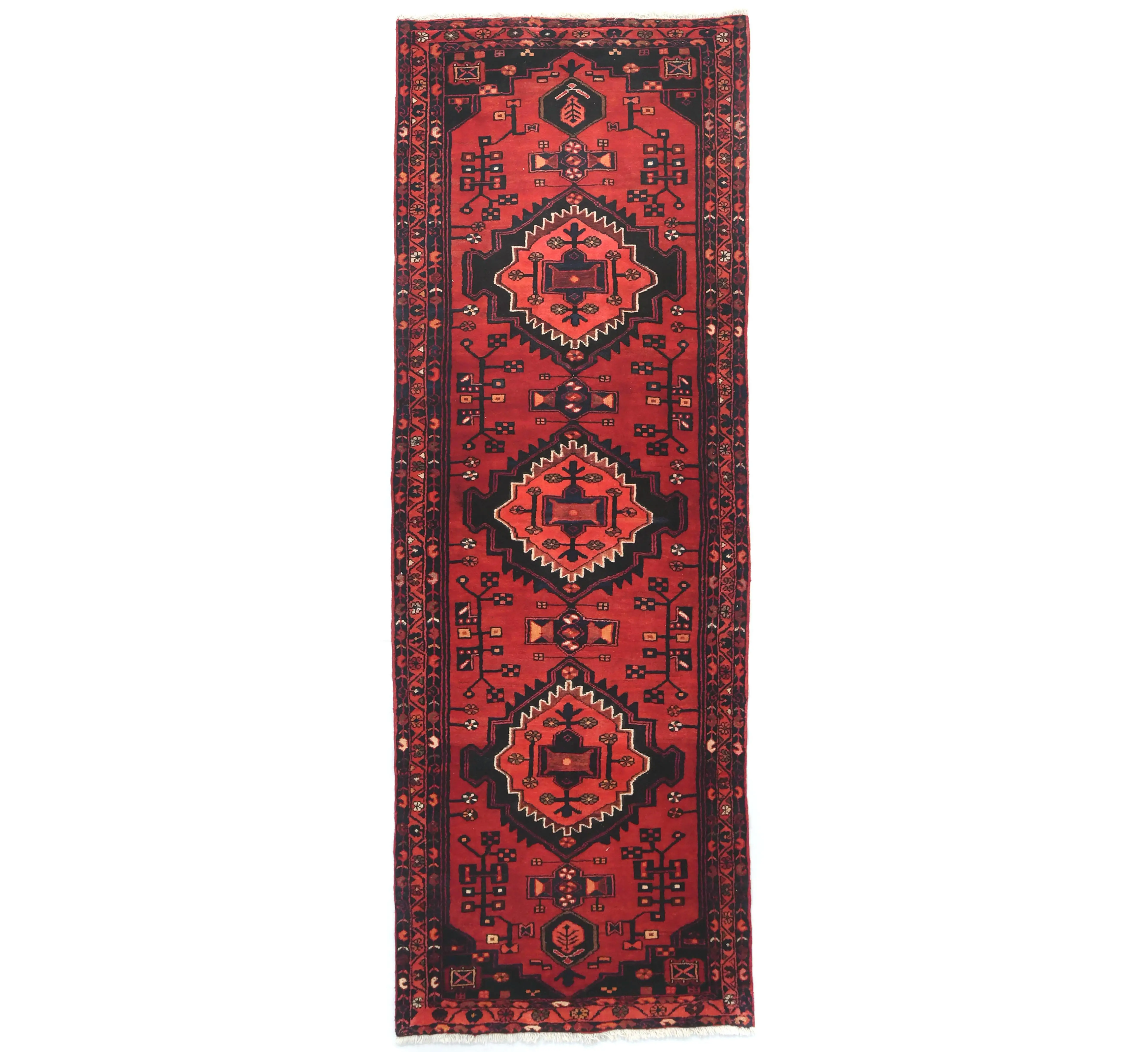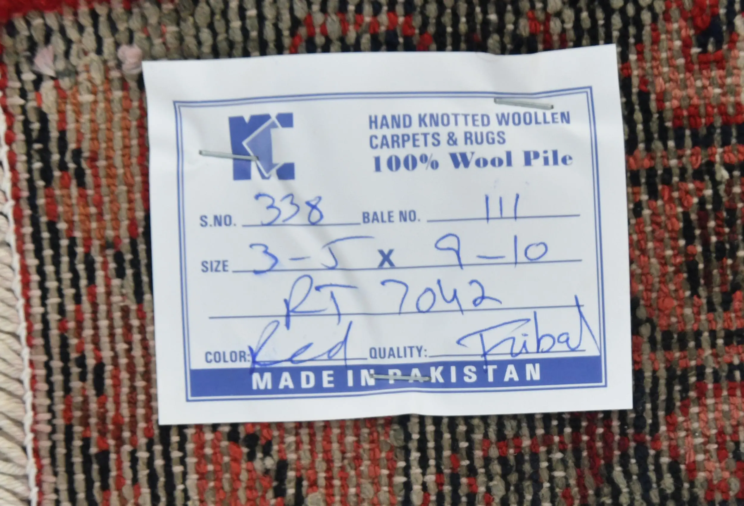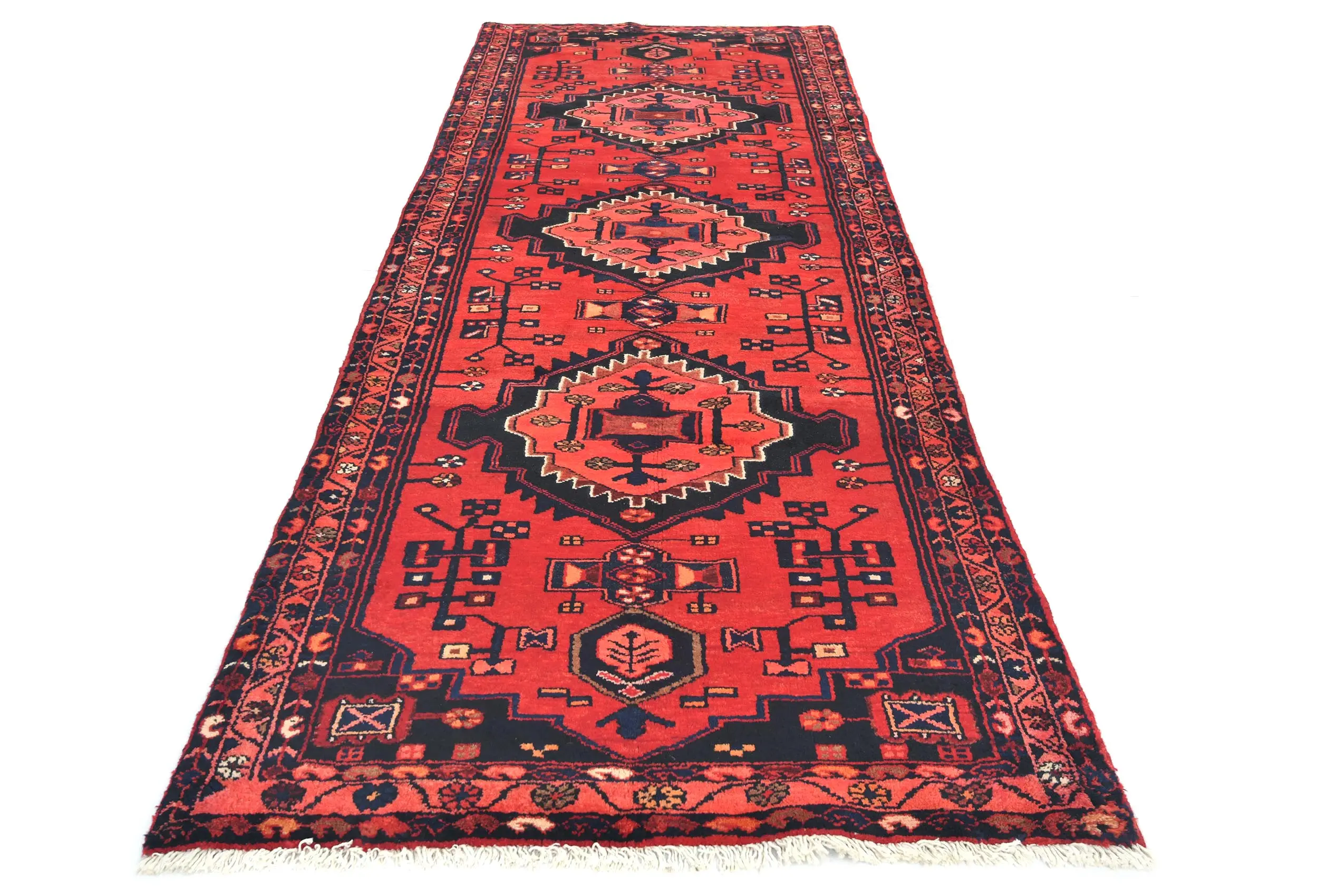 Handmade vintage 3'5X9'10 Red Persian rug made with vegetable dyes (fine wool pile and cotton foundation), exceptional knot count, and appealing ancient designs. This Oriental rug never will go out of style and would be among your most valuable treasures.