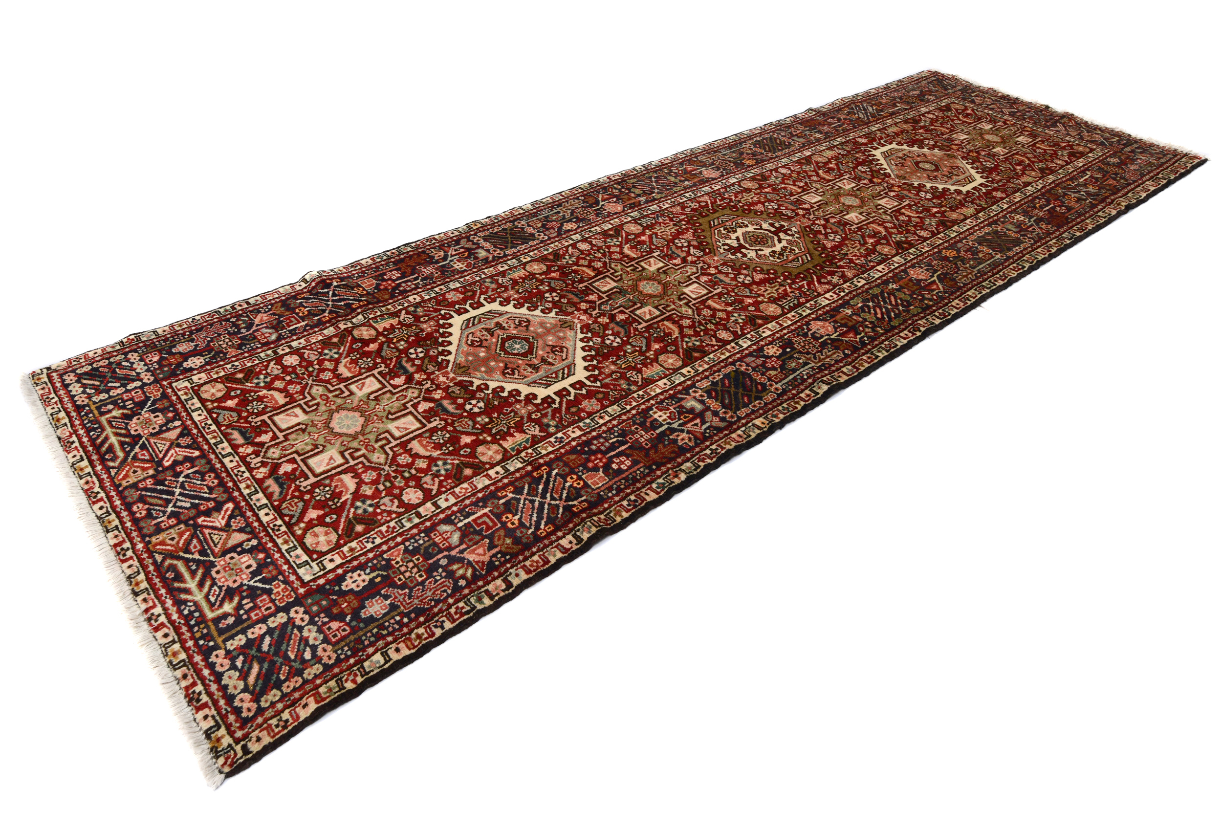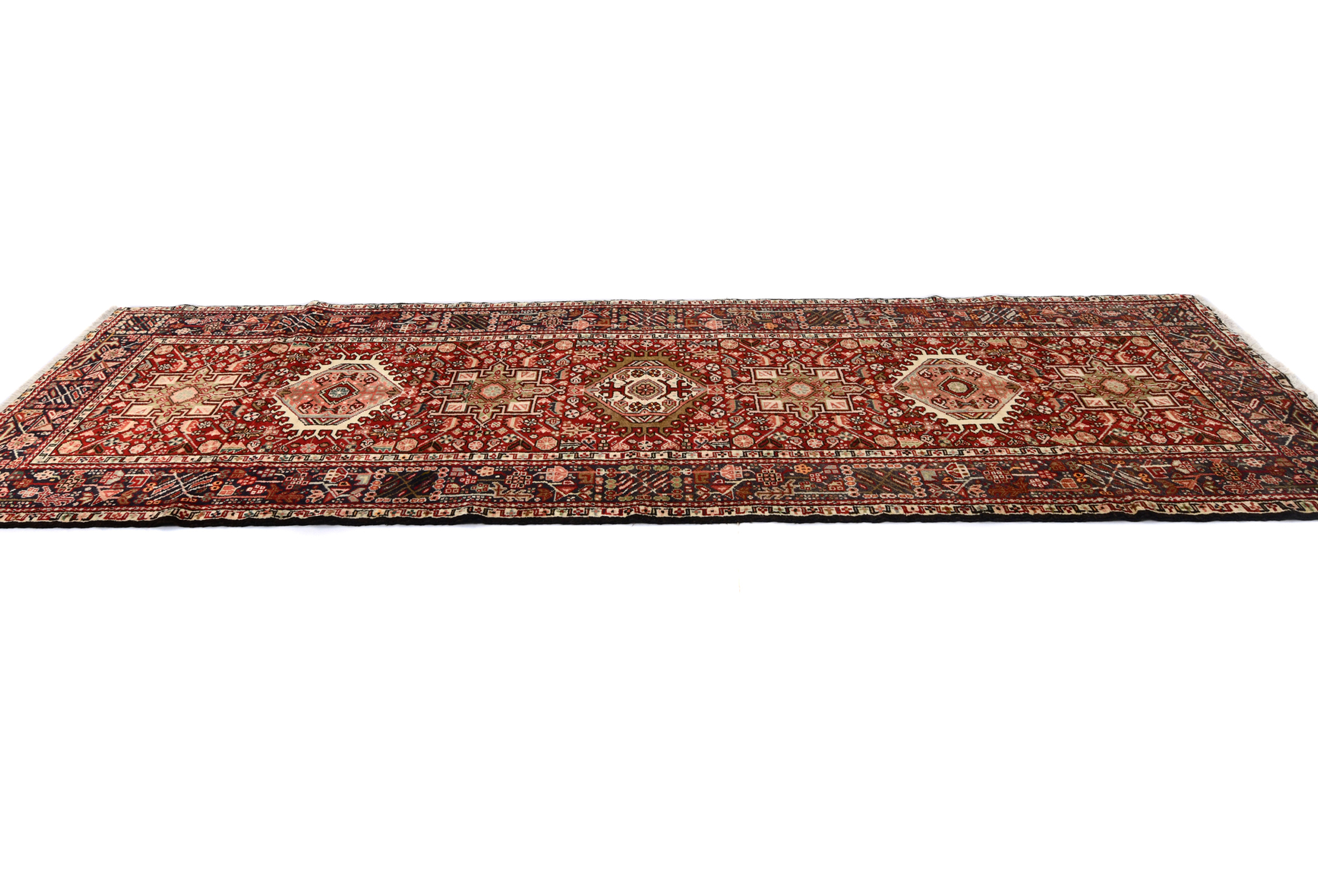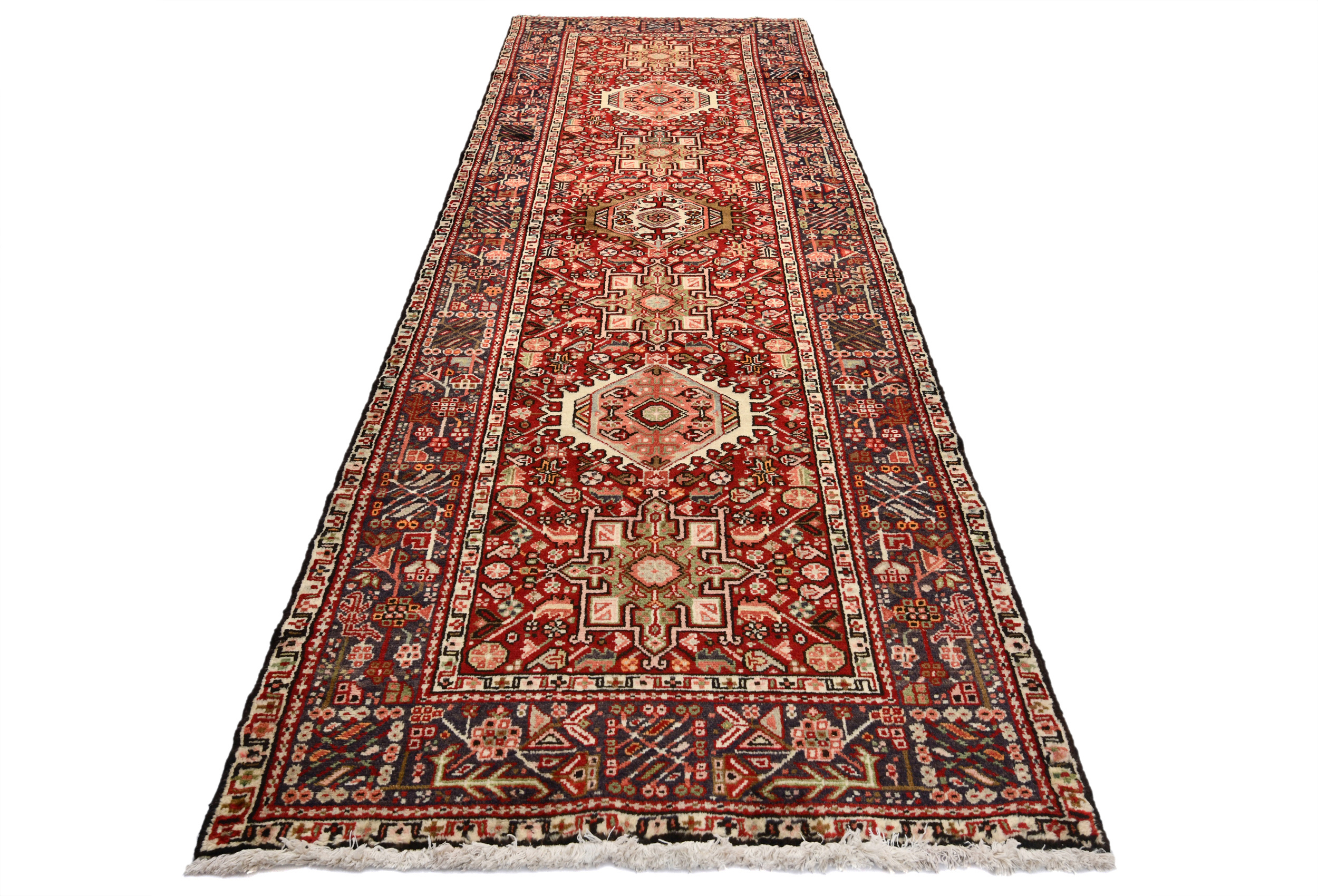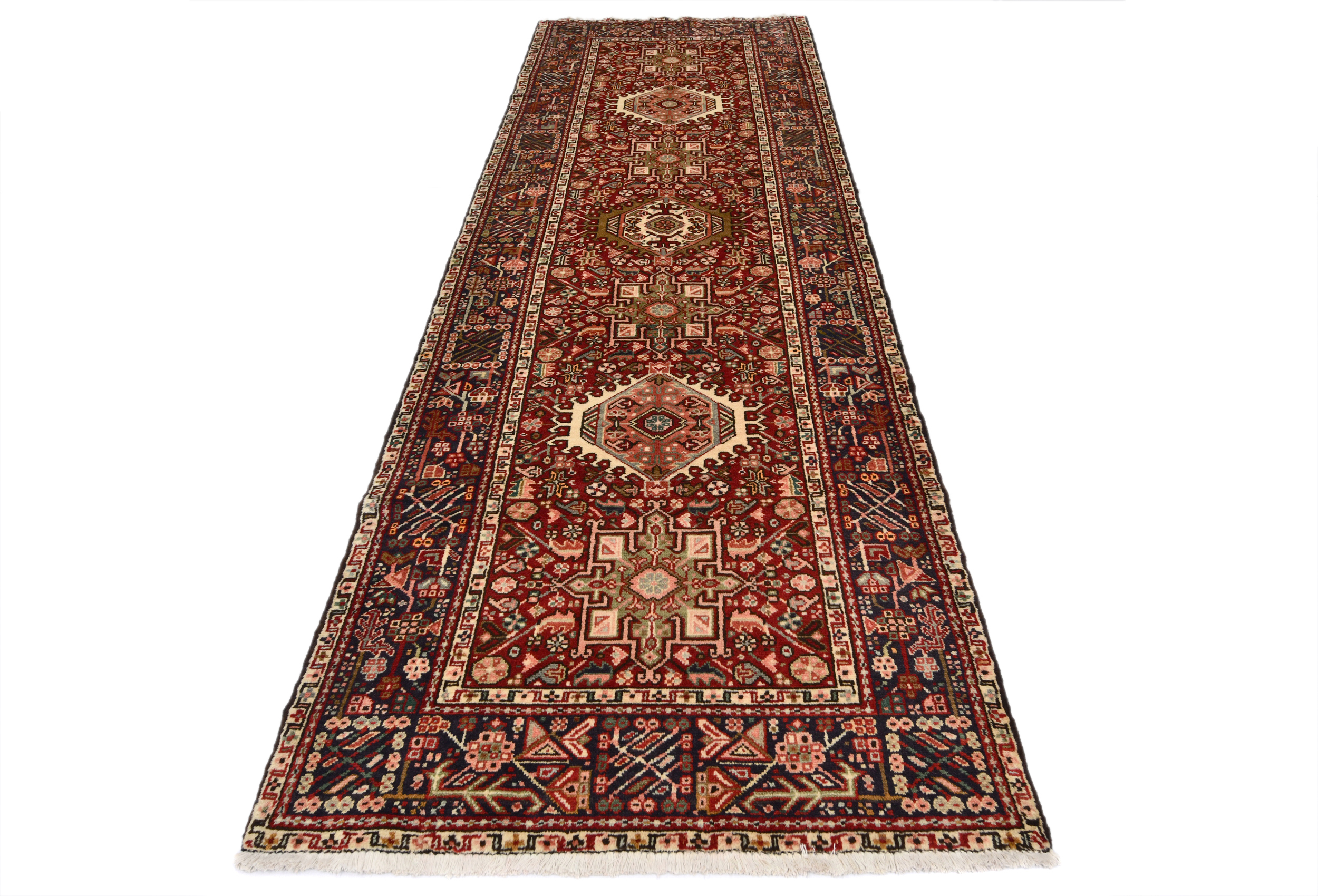 Handmade vintage 3'6X10'4 red Persian runner made with vegetable dyes (fine wool pile and cotton foundation), superior knot count, and alluring ancient designs. This Oriental runner never will go out of style and would be among your most valuable treasures.