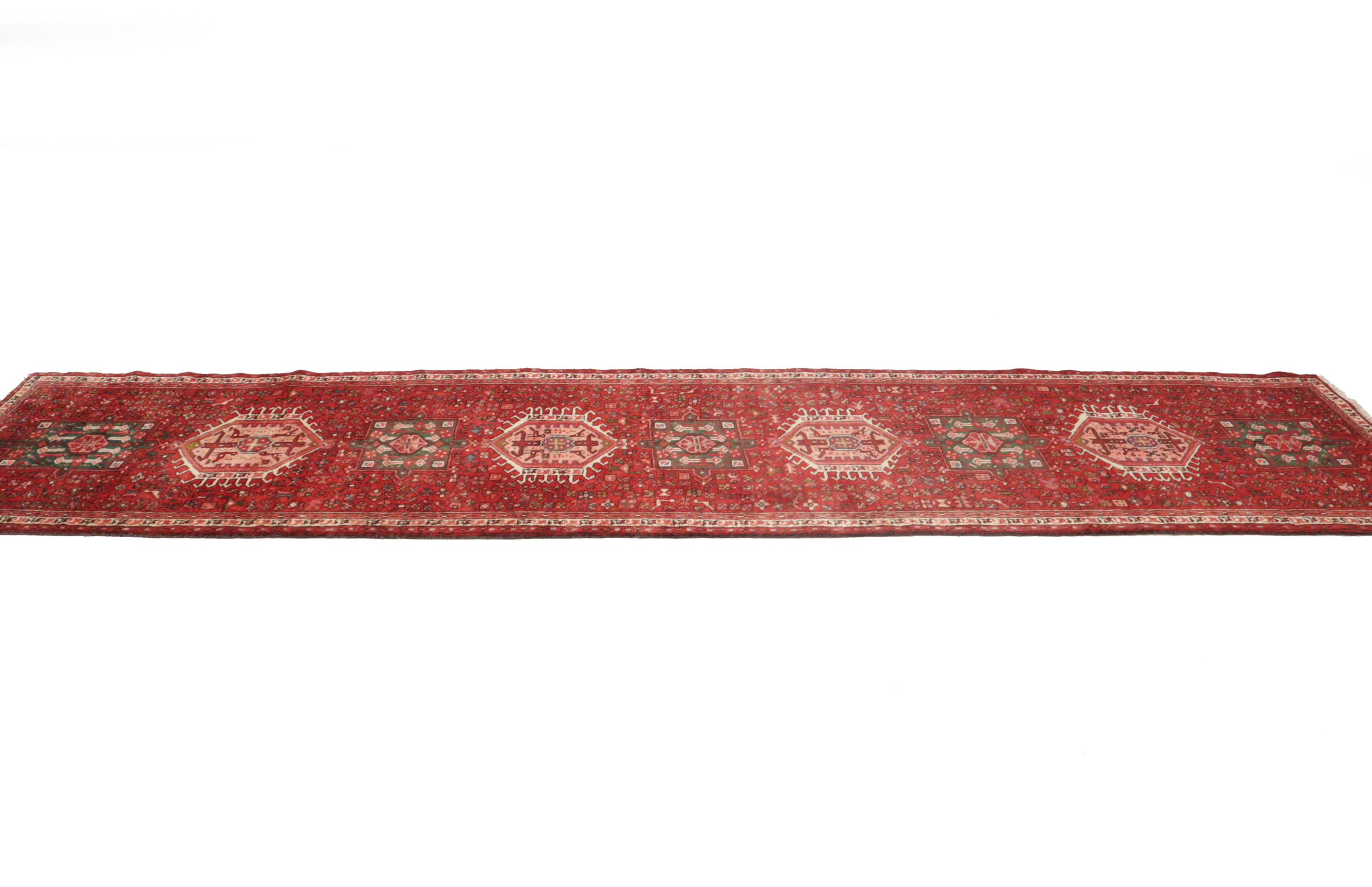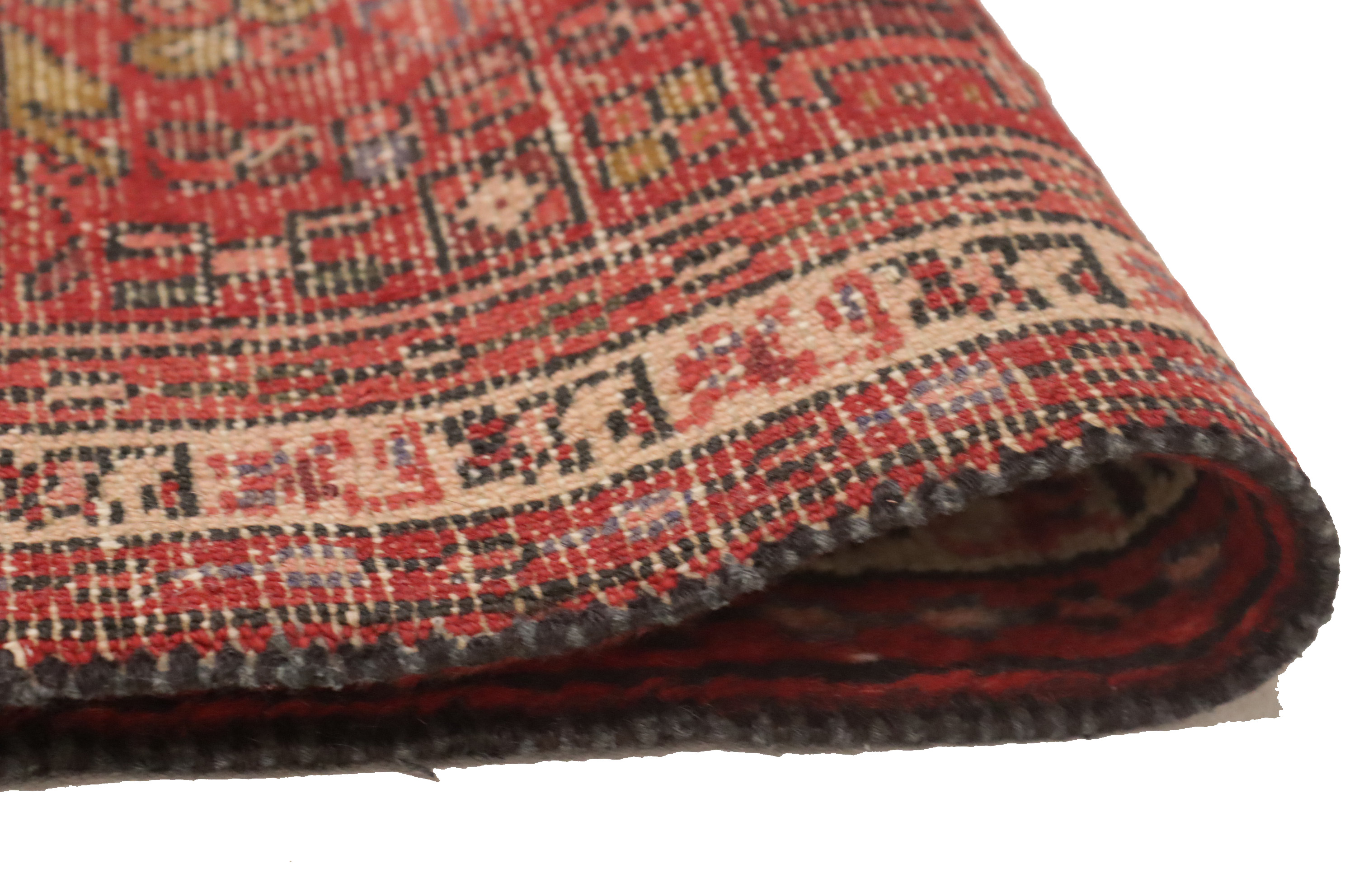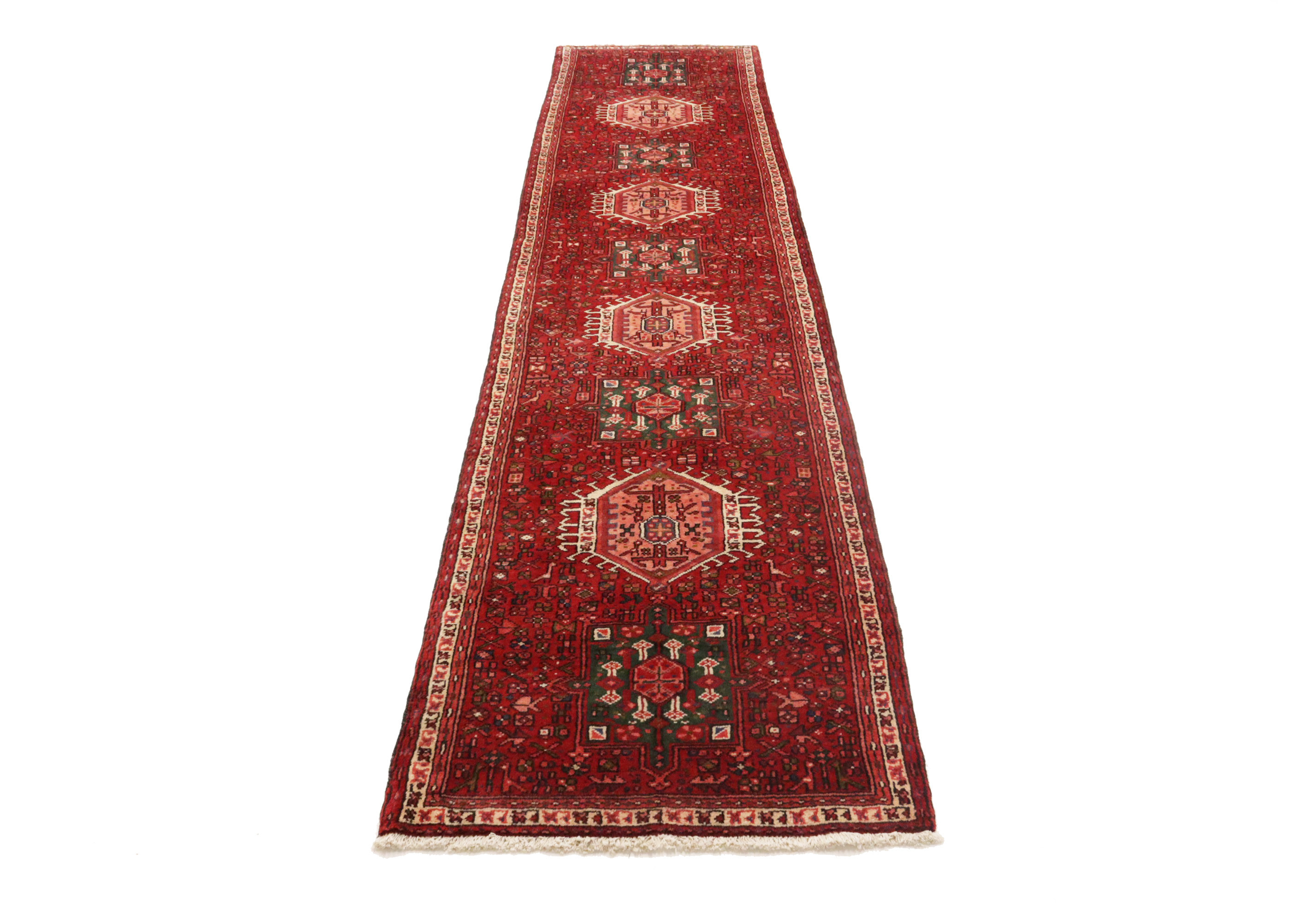 Hand Knotted vintage 3X13 red Persian runner made with vegetable dyes (fine wool pile and cotton foundation), superior knot count, and appealing ancient designs. This Oriental runner never will go out of style and would be among your most valuable treasures.
