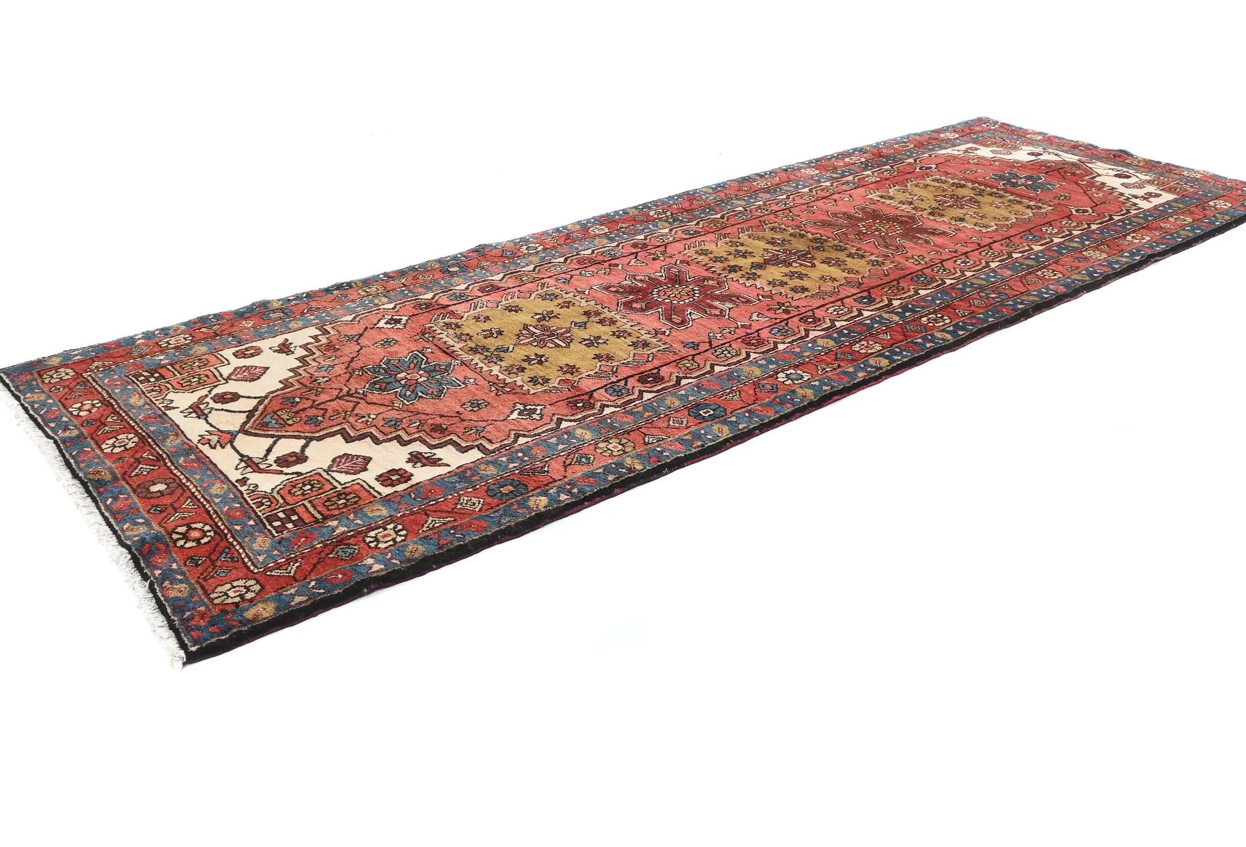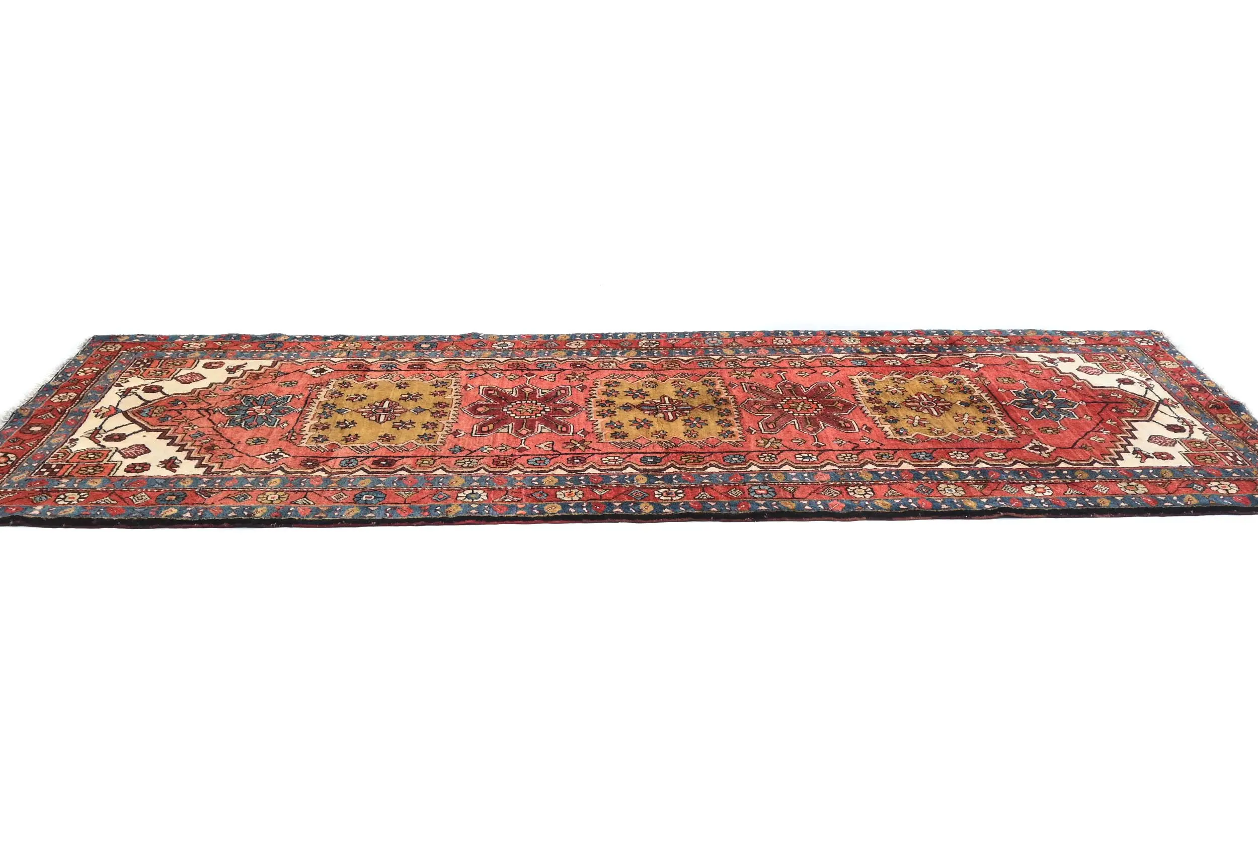 Hand Knotted vintage 4X11 Red runner made with natural dyes (fine wool pile and cotton foundation), superior knot count, and alluring ancient designs. This Oriental runner never will go out of style and would be among your most valuable treasures.