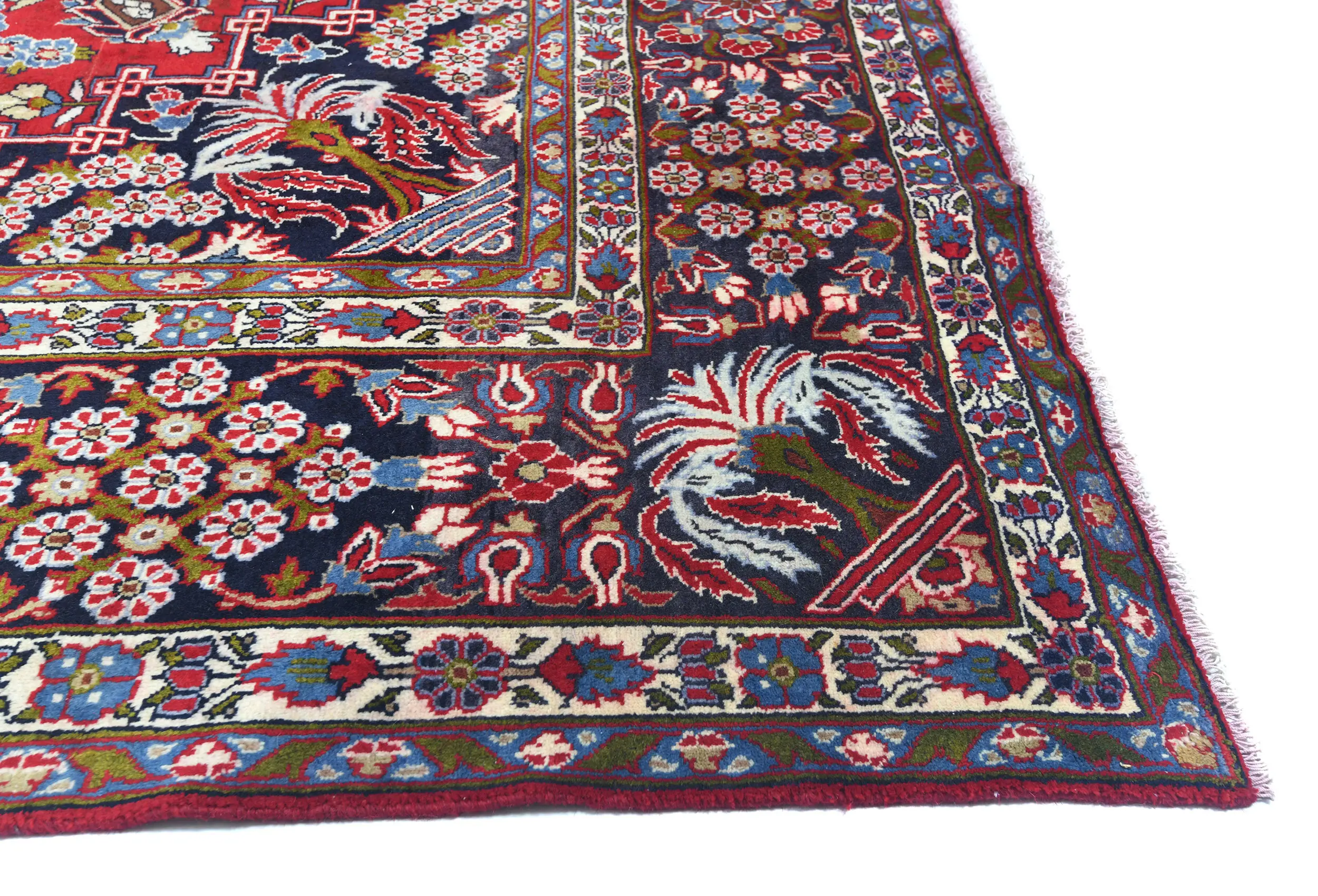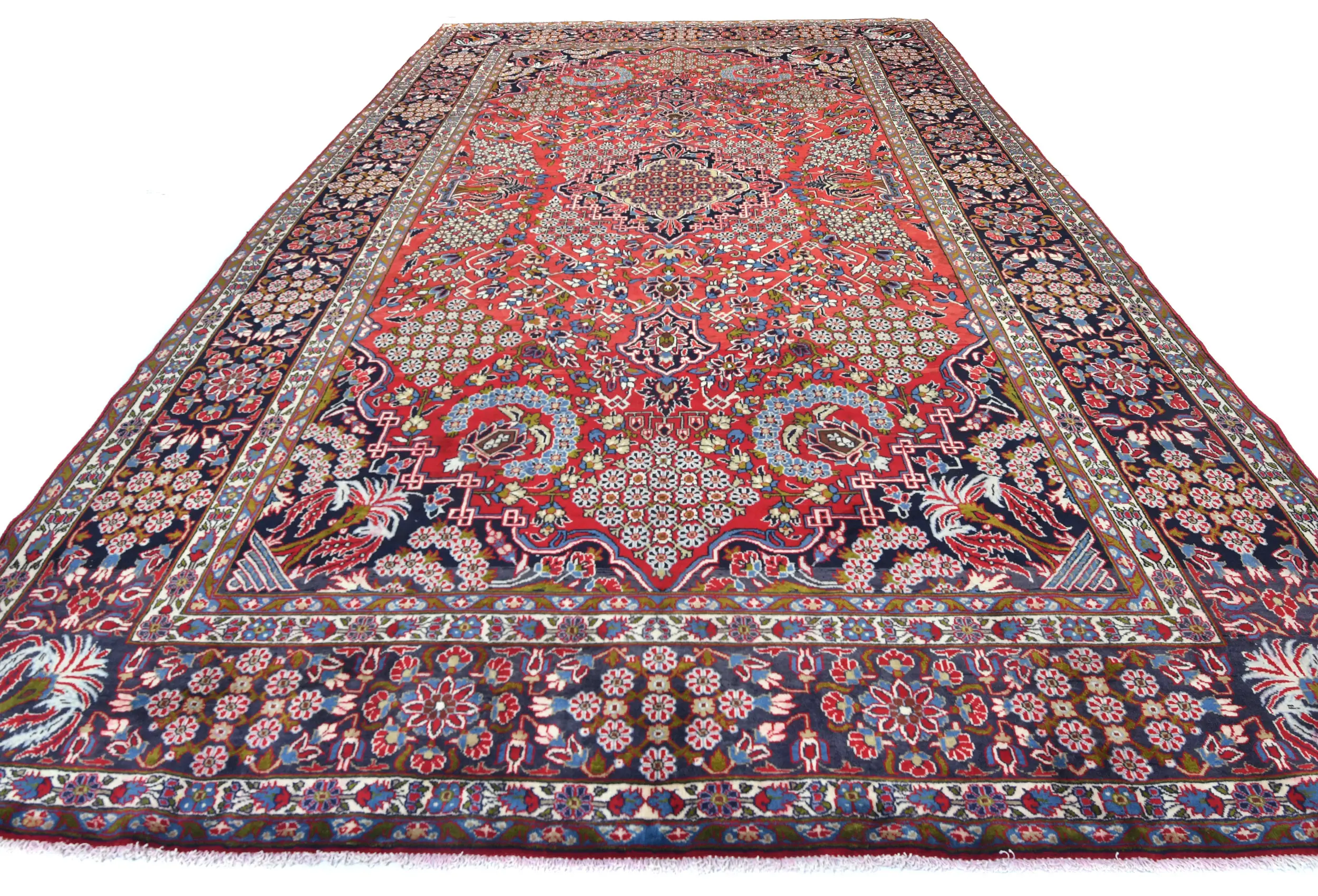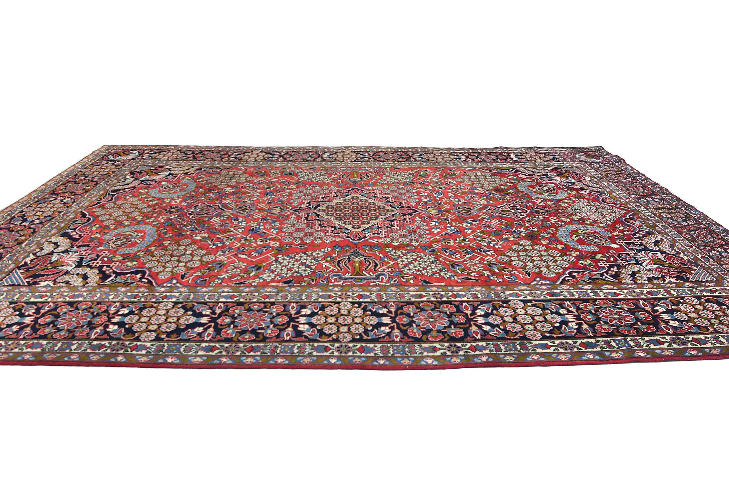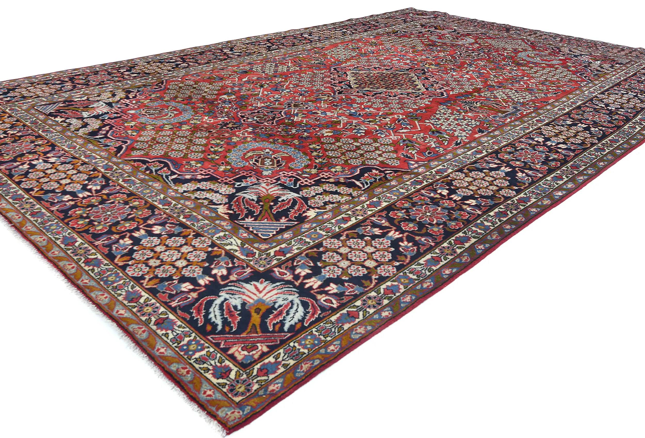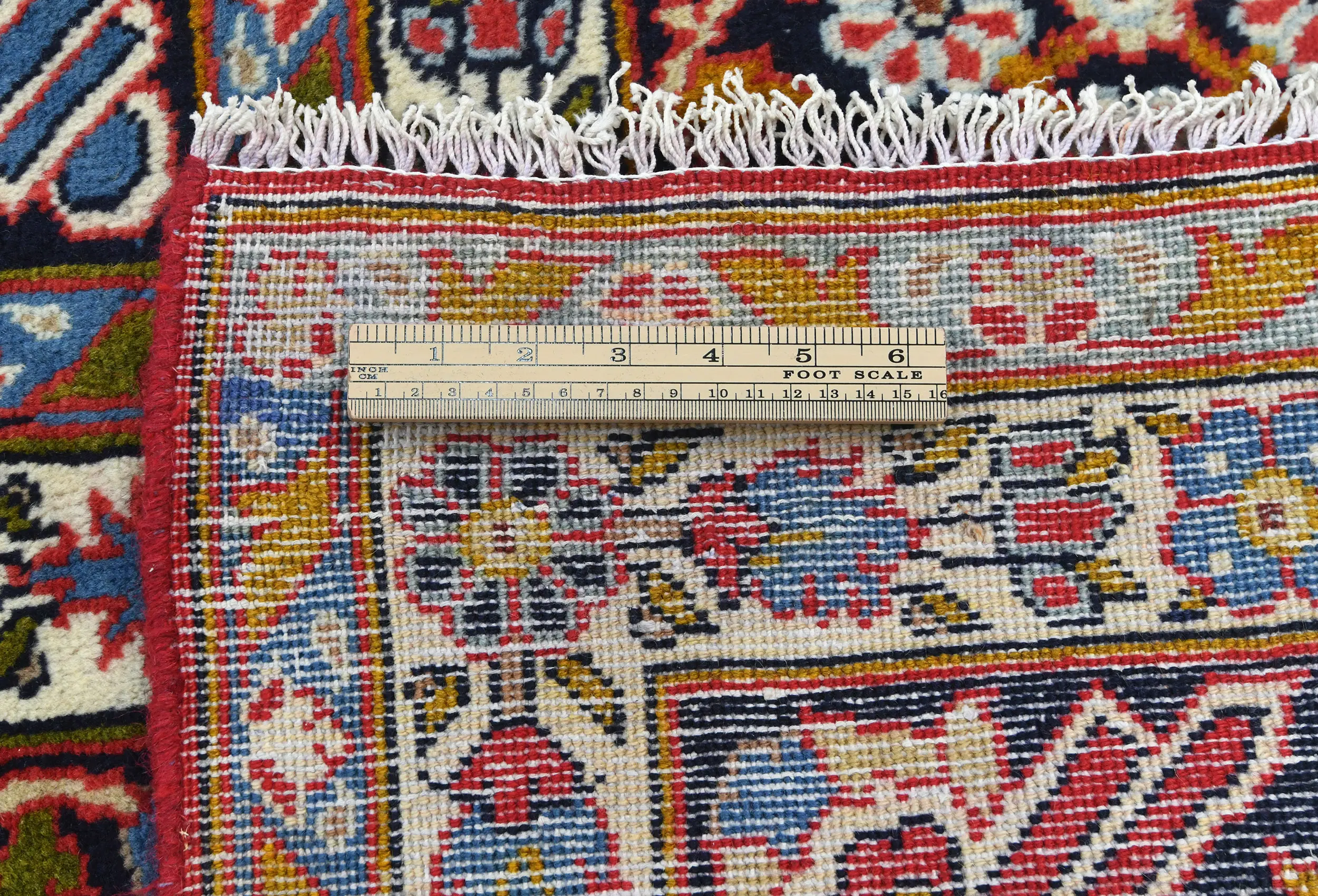 This genuine 10X16 red vintage Persian rug was made by the hands of gifted weavers inspired by a variety of spectacular artistic designs, to recreate the aged look of the original piece with a richness of color and ornately patterned floral background field. What set this traditional Oriental area rug from the others are the material and dye used (wool pile and cotton foundation), knot count, ancient designs, fantastic grades, and its regional historical connection: it has deep roots, from the story of the people who produced it to the meaning of the symbols and colors displayed across its canvas that have been praised for centuries. This classic home décor carpet will be completely cozy and inviting that never will go out of style! Also, this Oriental rug would be among your most valuable treasures, it is a great investment that accrues value over time, and it will last for generations because was woven with high-quality, all-natural wool; it won’t rip, tear, or shed. Environmentally friendly, opulent yet affordable; this Persian rug will give you a thorough amount of character to help define your living space with elegance and warmth that will capture the eyes and attention of your audience (homeowners, designers, decorators, family and friends). RT-7423