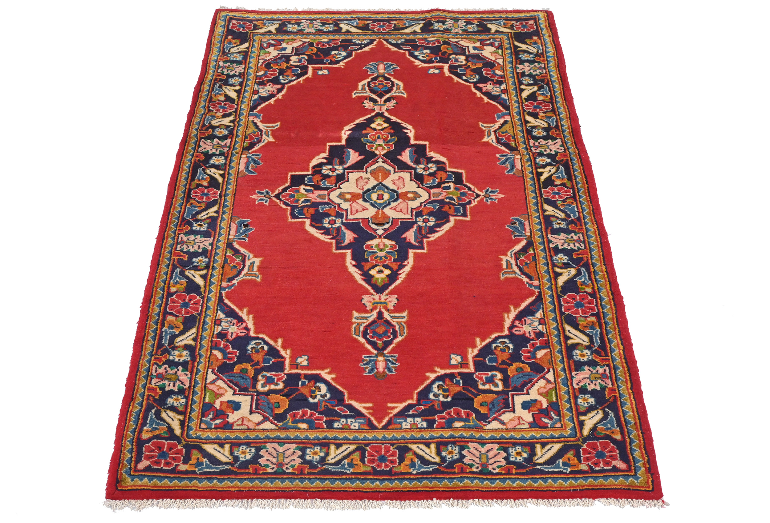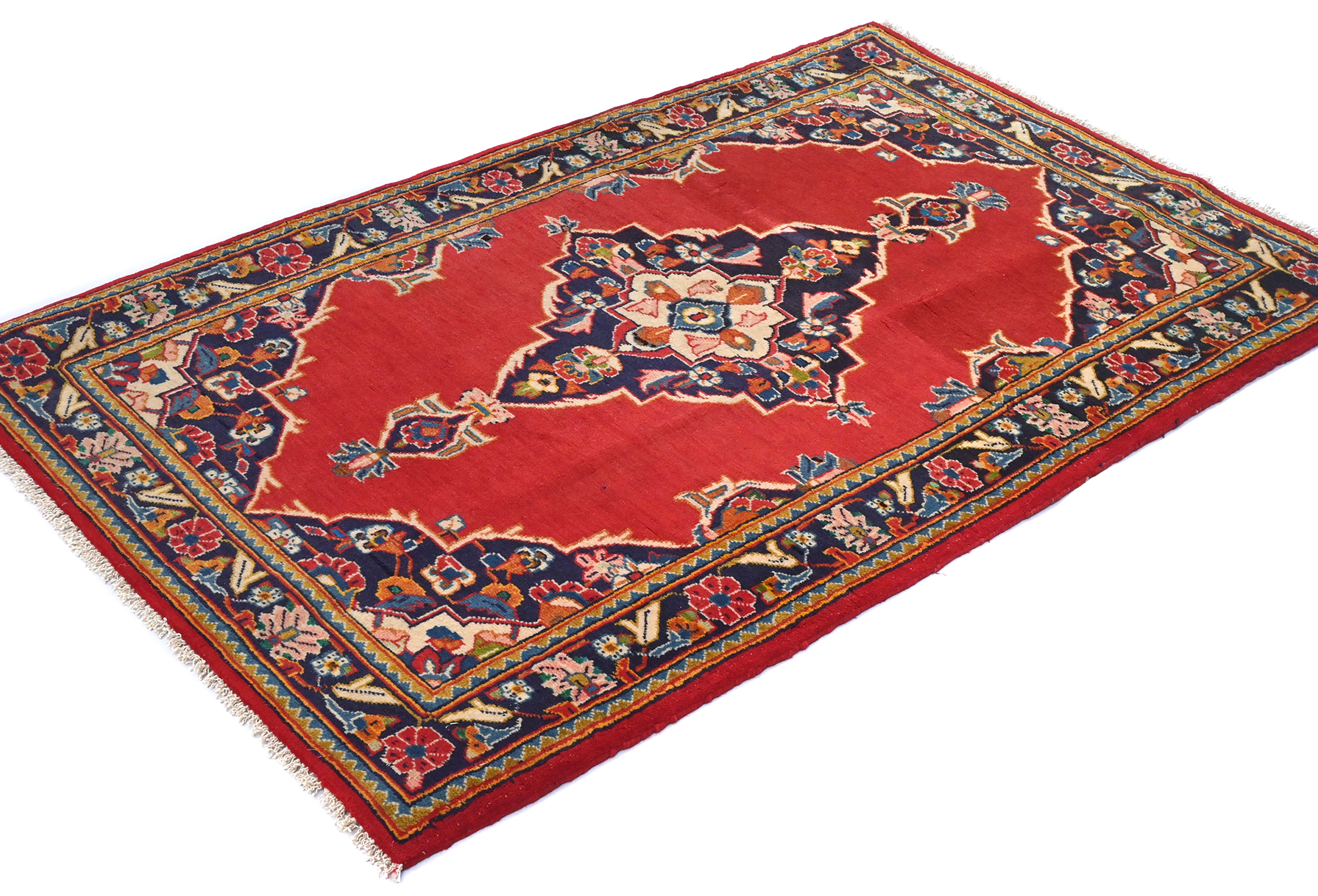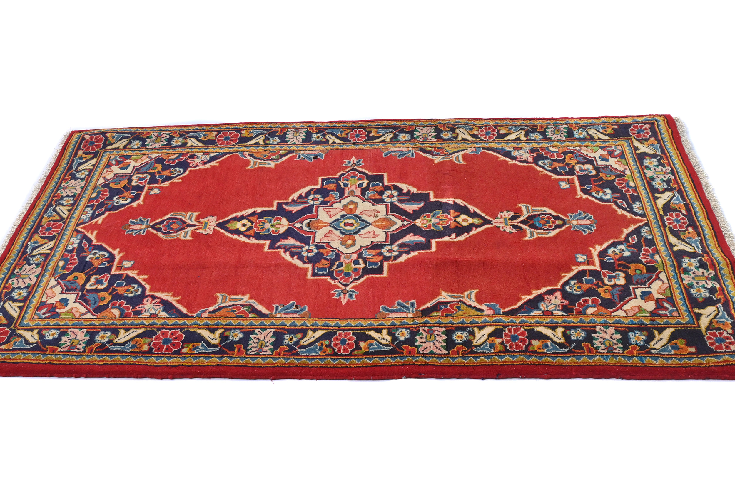 Handmade vintage 2'8X4'3 red Persian rug made with vegetable dyes (fine wool pile and cotton foundation), superior knot count, and alluring ancient designs. This Oriental rug never will go out of style and would be among your most valuable treasures.