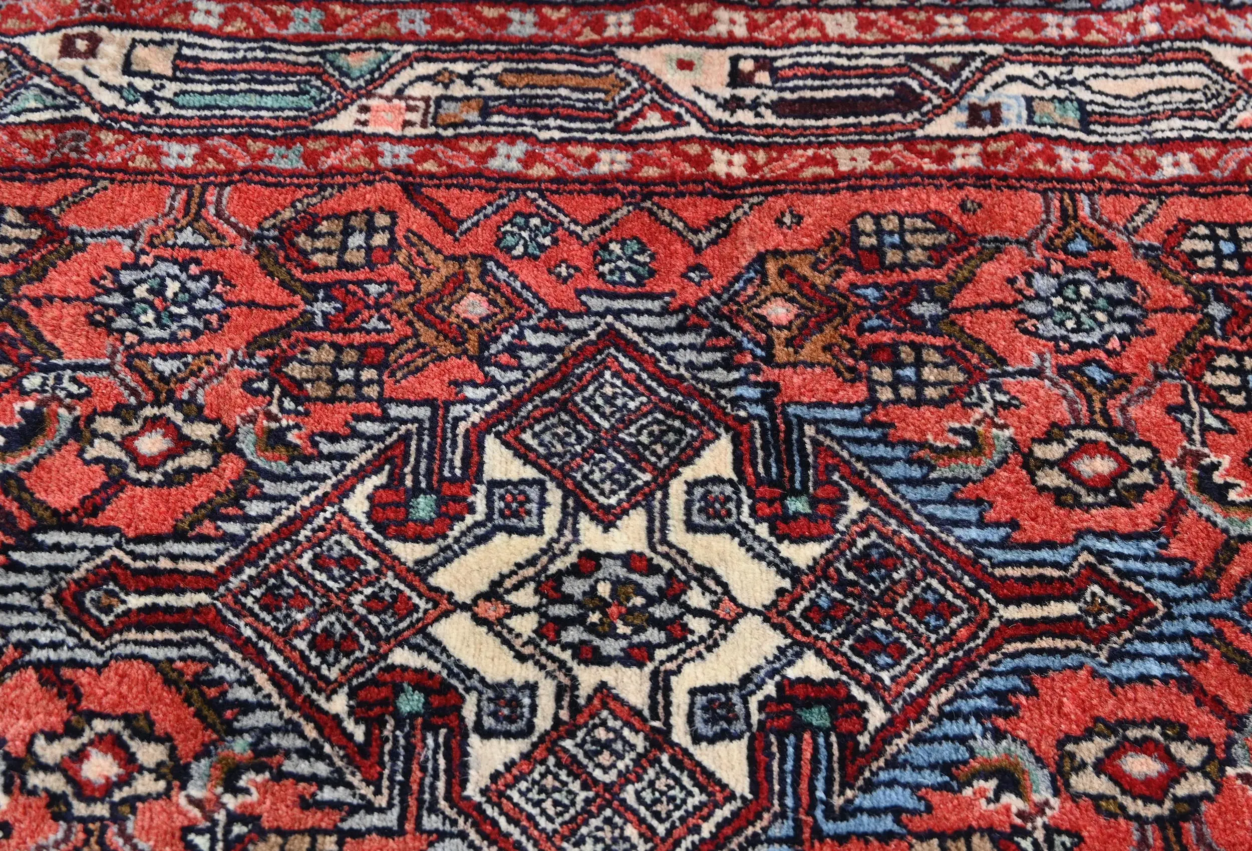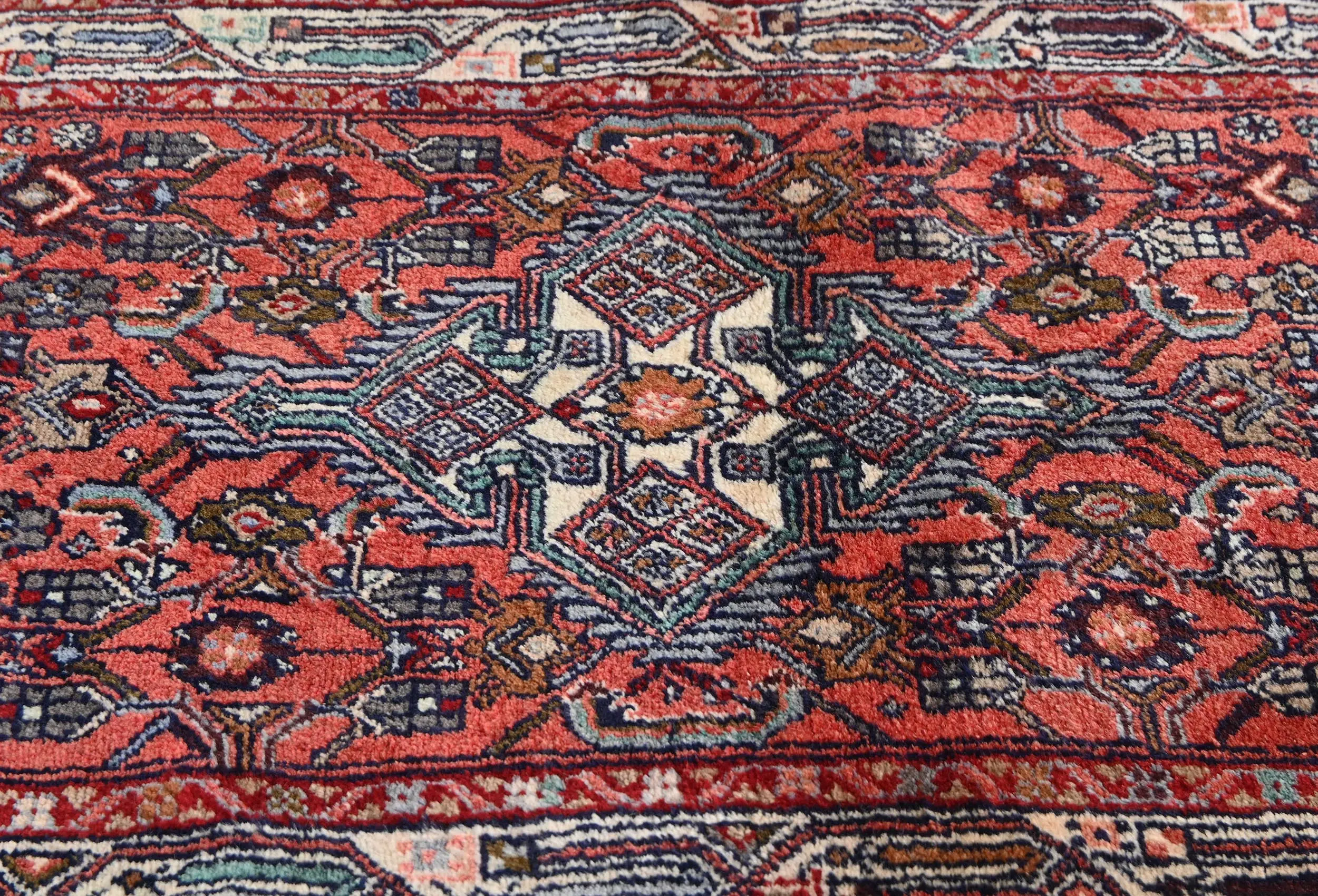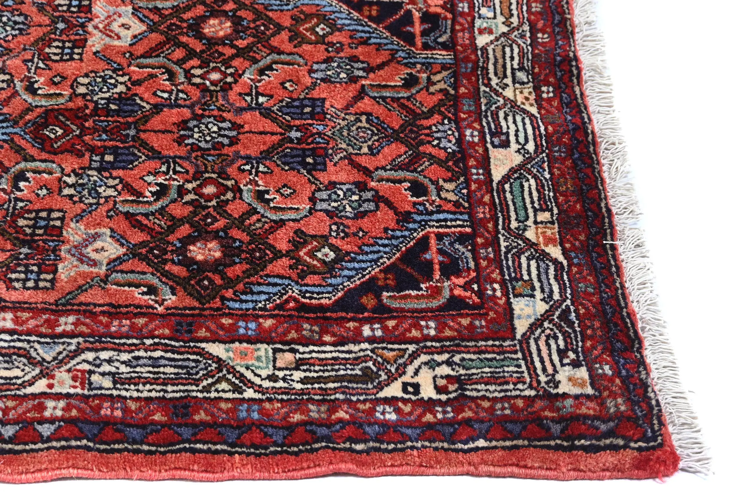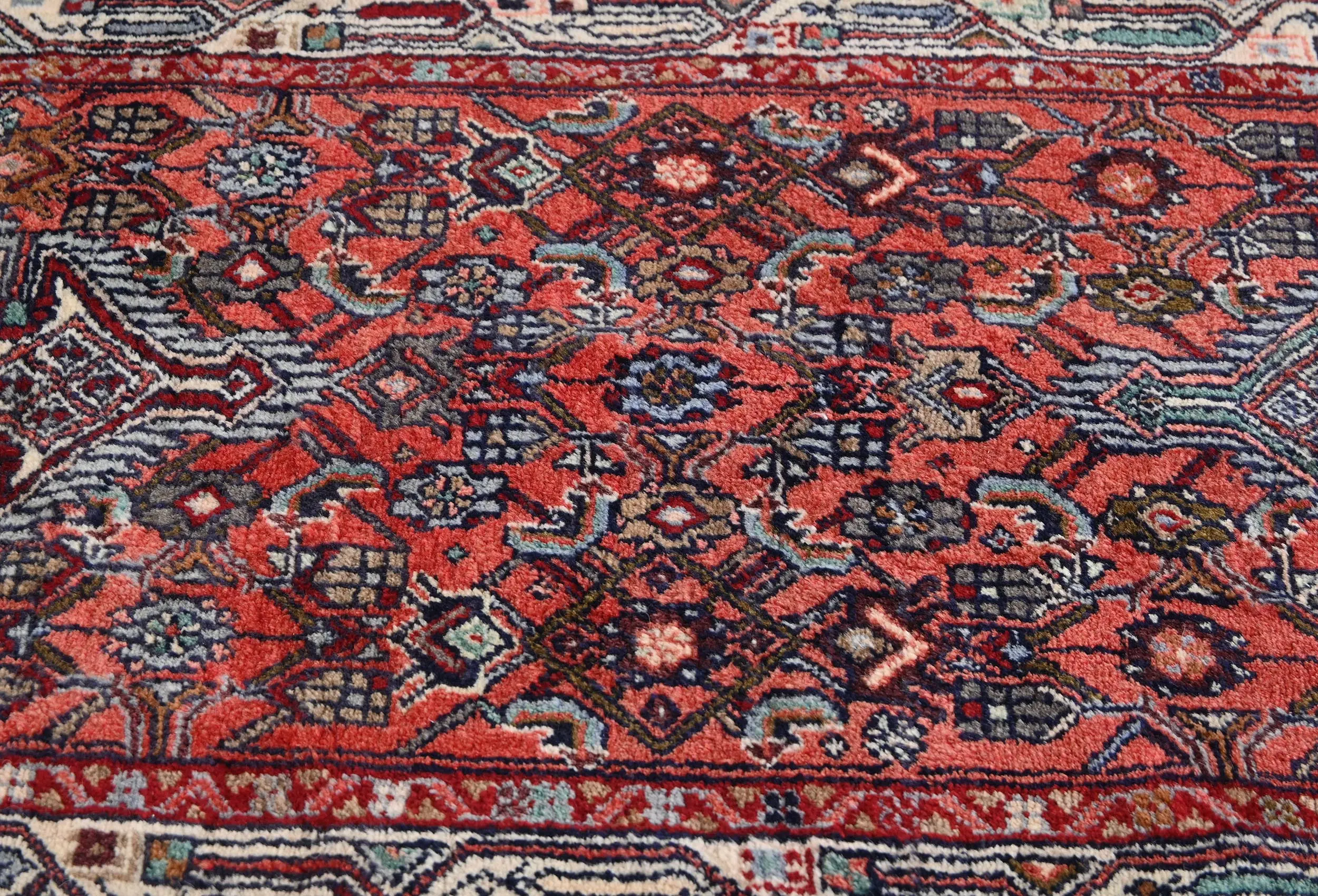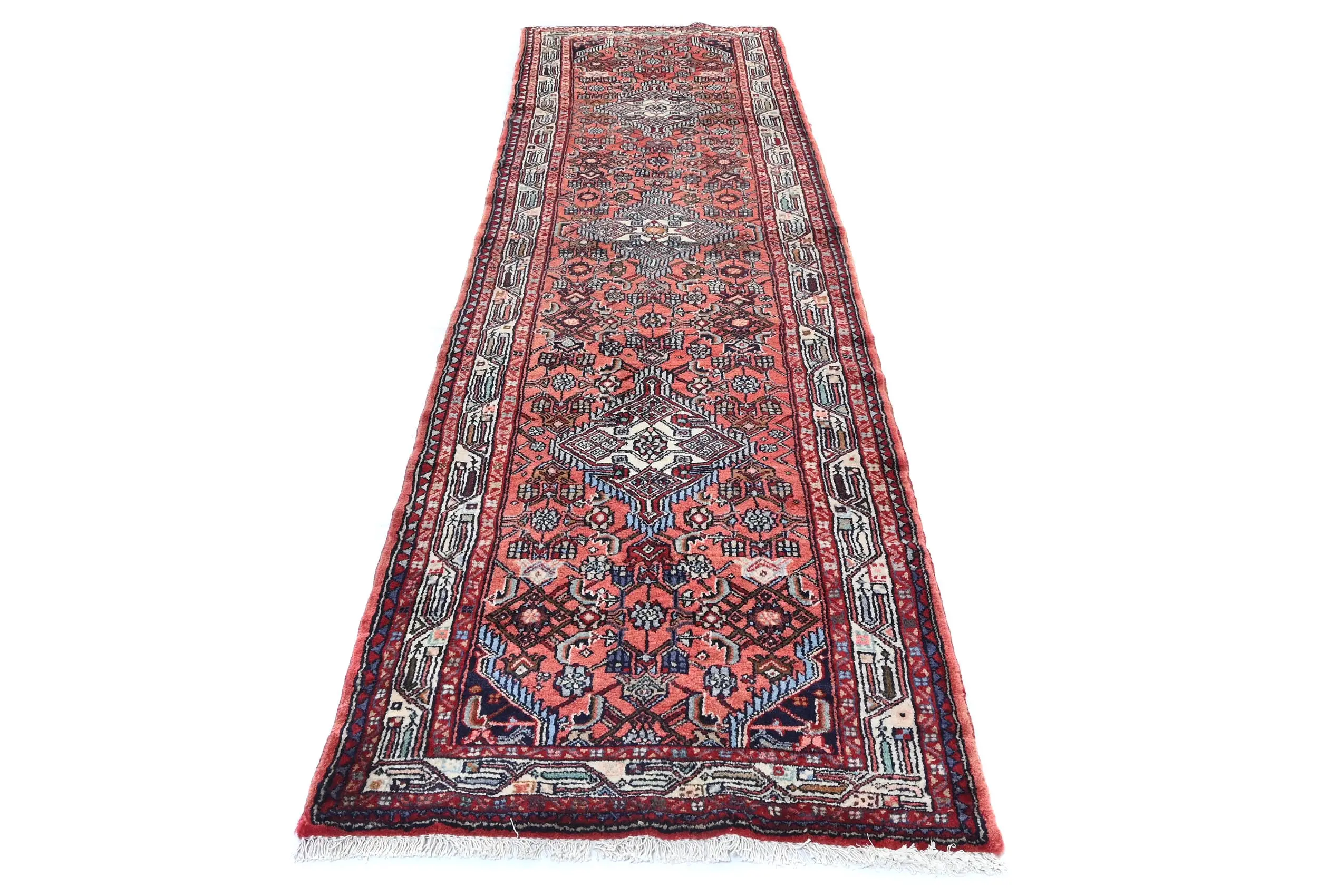 Handmade vintage 2'8X10'5 red Persian runner made with vegetable dyes (fine wool pile and cotton foundation), exceptional knot count, and appealing ancient designs. This Oriental runner never will go out of style and would be among your most valuable treasures.