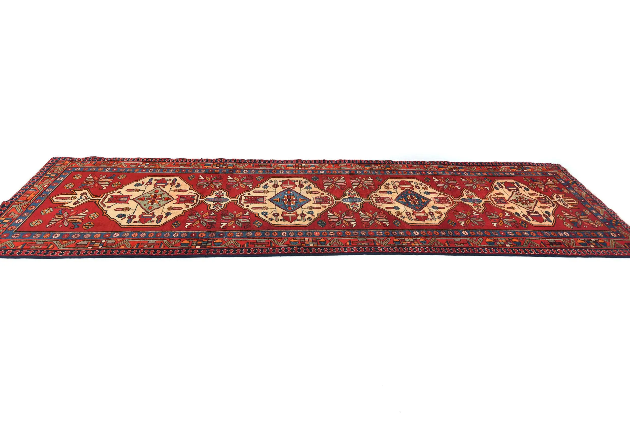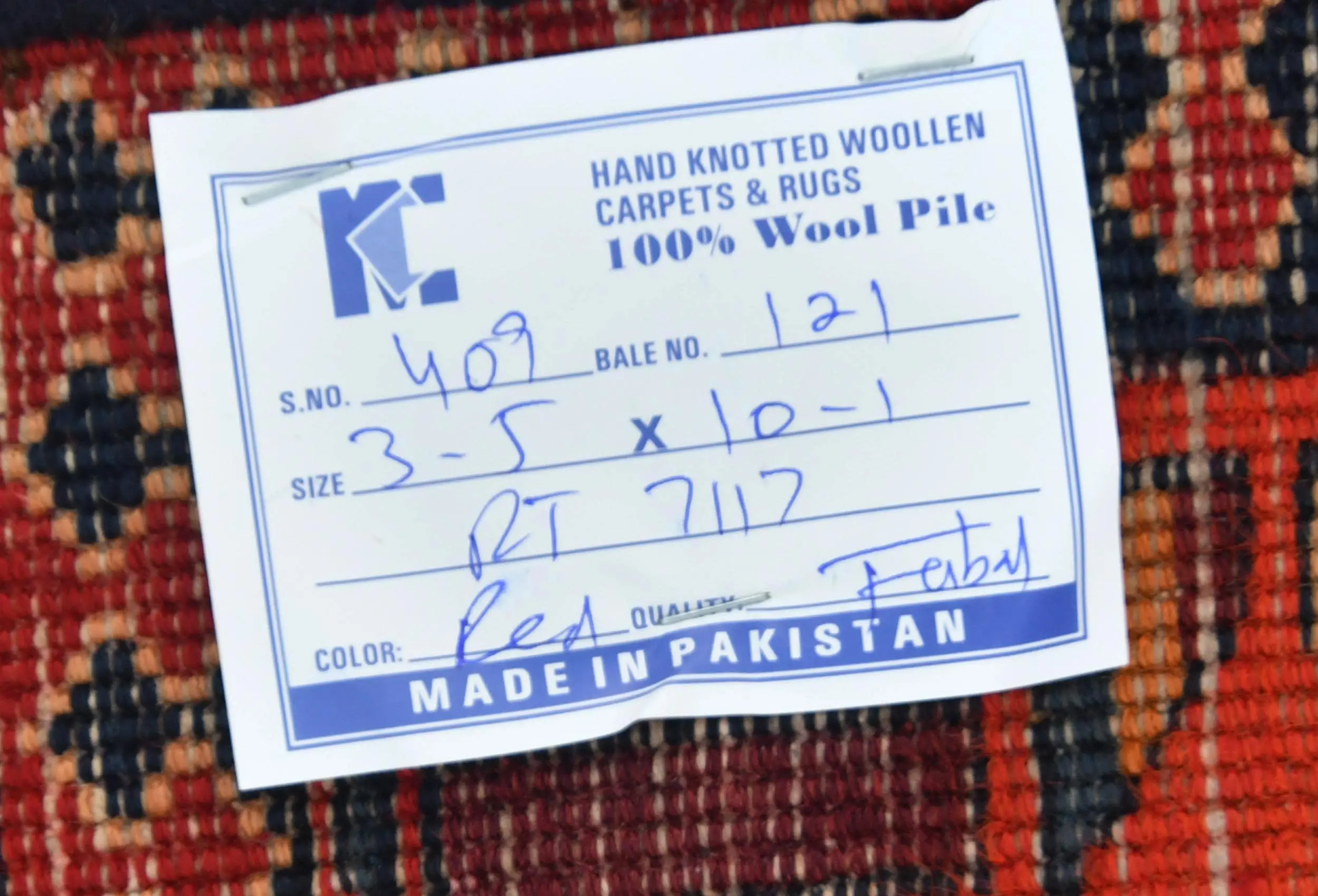 Hand Knotted vintage 3'5X10 red runner made with natural dyes (fine wool pile and cotton foundation), superior knot count, and alluring ancient designs. This Oriental runner never will go out of style and would be among your most valuable treasures.