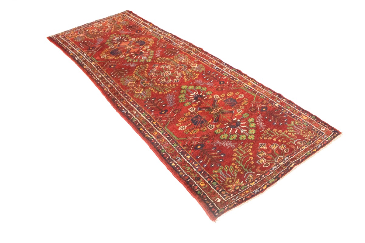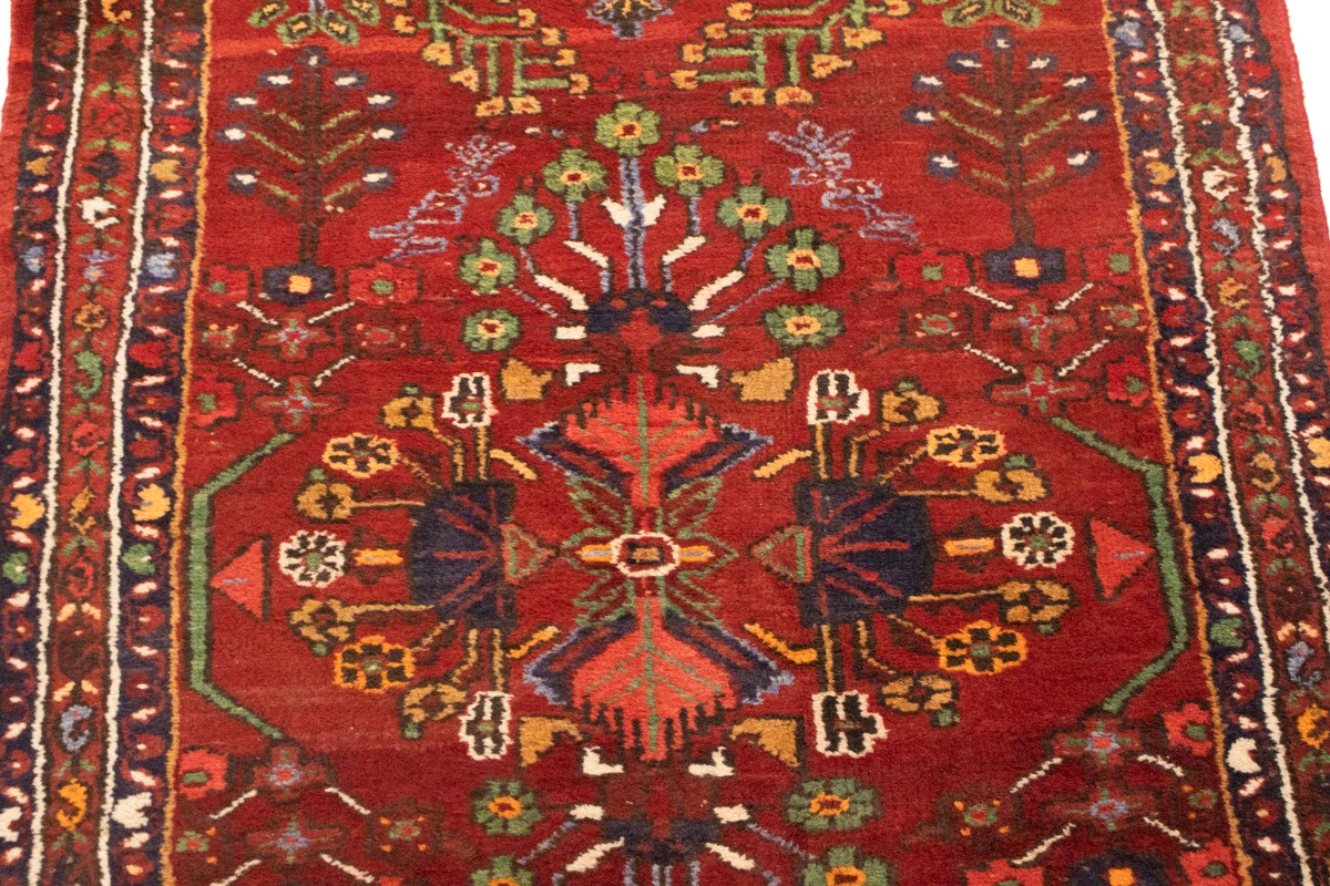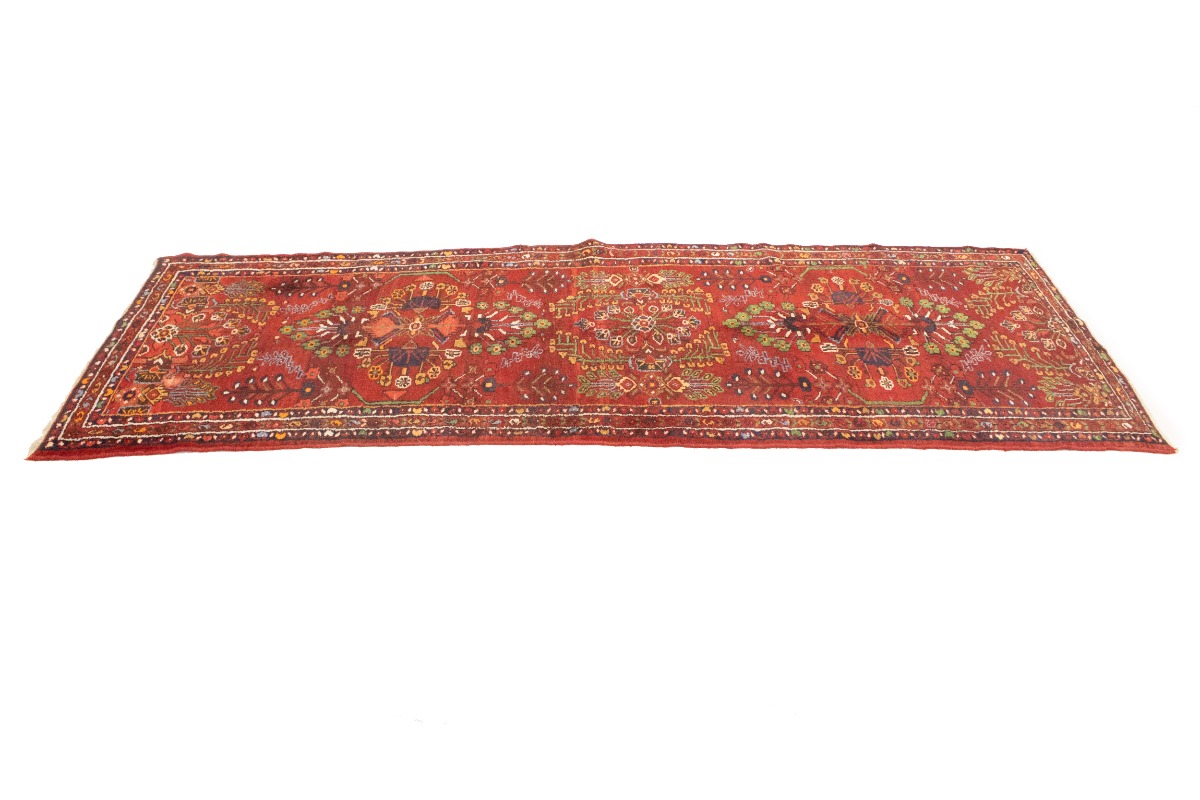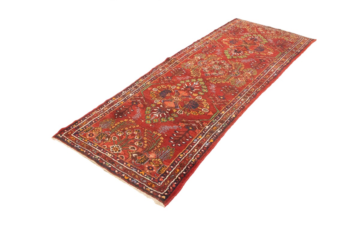Handmade vintage 3'7X9'5 red Persian runner made with natural dyes (fine wool pile and cotton foundation), superior knot count, and appealing ancient designs. This Oriental runner never will go out of style and would be among your most valuable treasures.