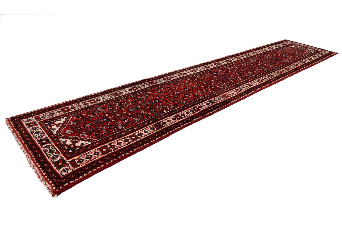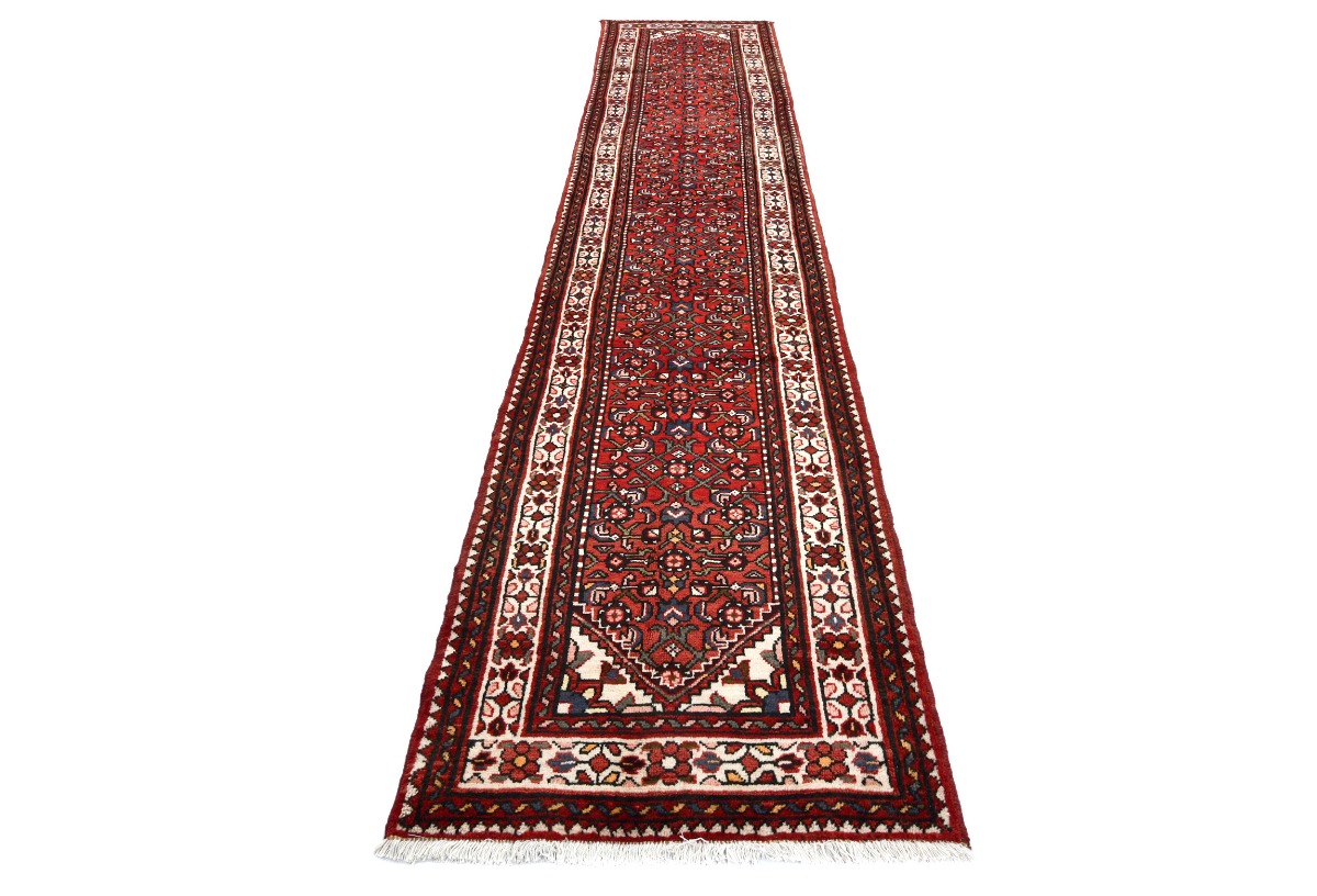 Handmade vintage 3X13'5 red Persian runner made with vegetable dyes (fine wool pile and cotton foundation), superior knot count, and alluring ancient designs. This Oriental runner never will go out of style and would be among your most valuable treasures.