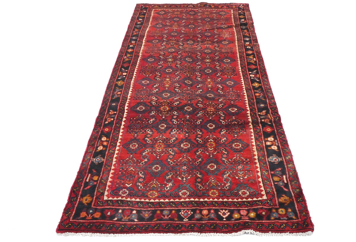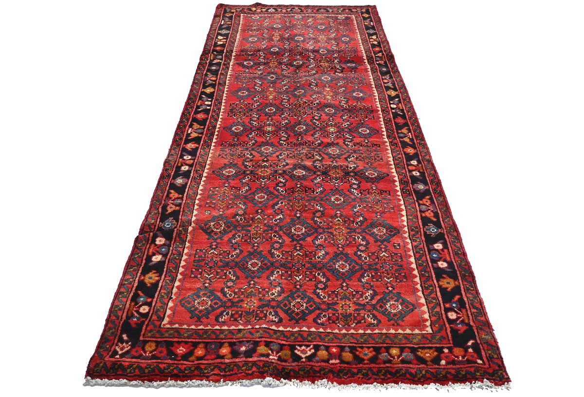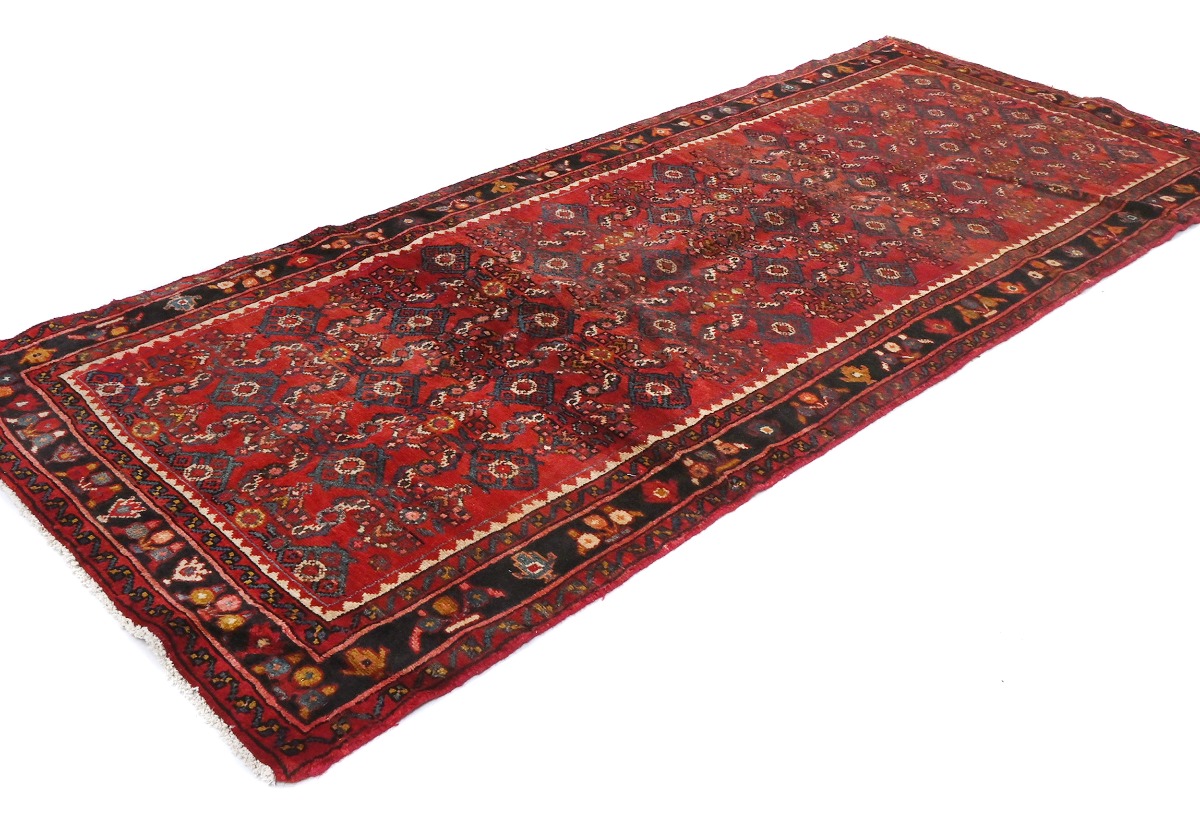 Handmade vintage 4X9 red Persian runner made with vegetable dyes (fine wool pile and cotton foundation), superior knot count, and alluring ancient designs. This Oriental runner never will go out of style and would be among your most valuable treasures.