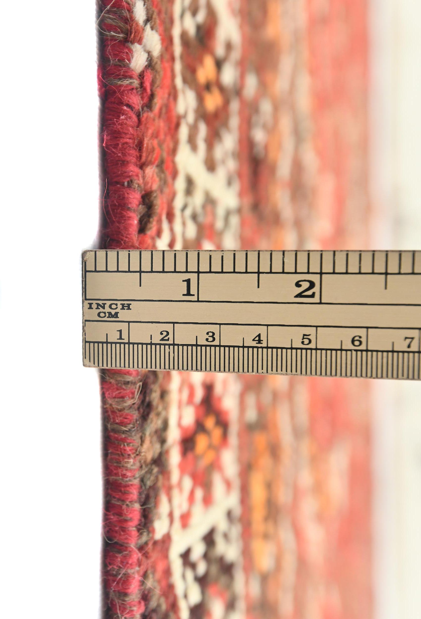 - Rich palette of red, cream, dark brown, gray, and peach yellow with natural abrash