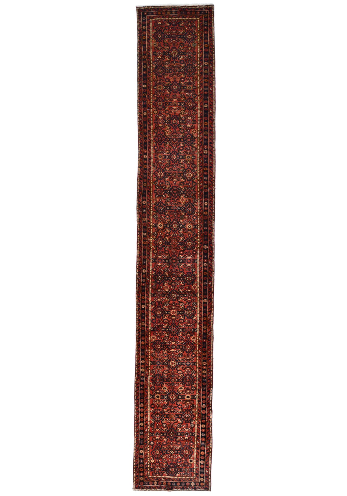 Handmade vintage 3X17 rusty red Persian runner made with vegetable dyes (fine wool pile and cotton foundation), superior knot count, and alluring ancient designs. This Oriental runner never will go out of style and would be among your most valuable treasures.