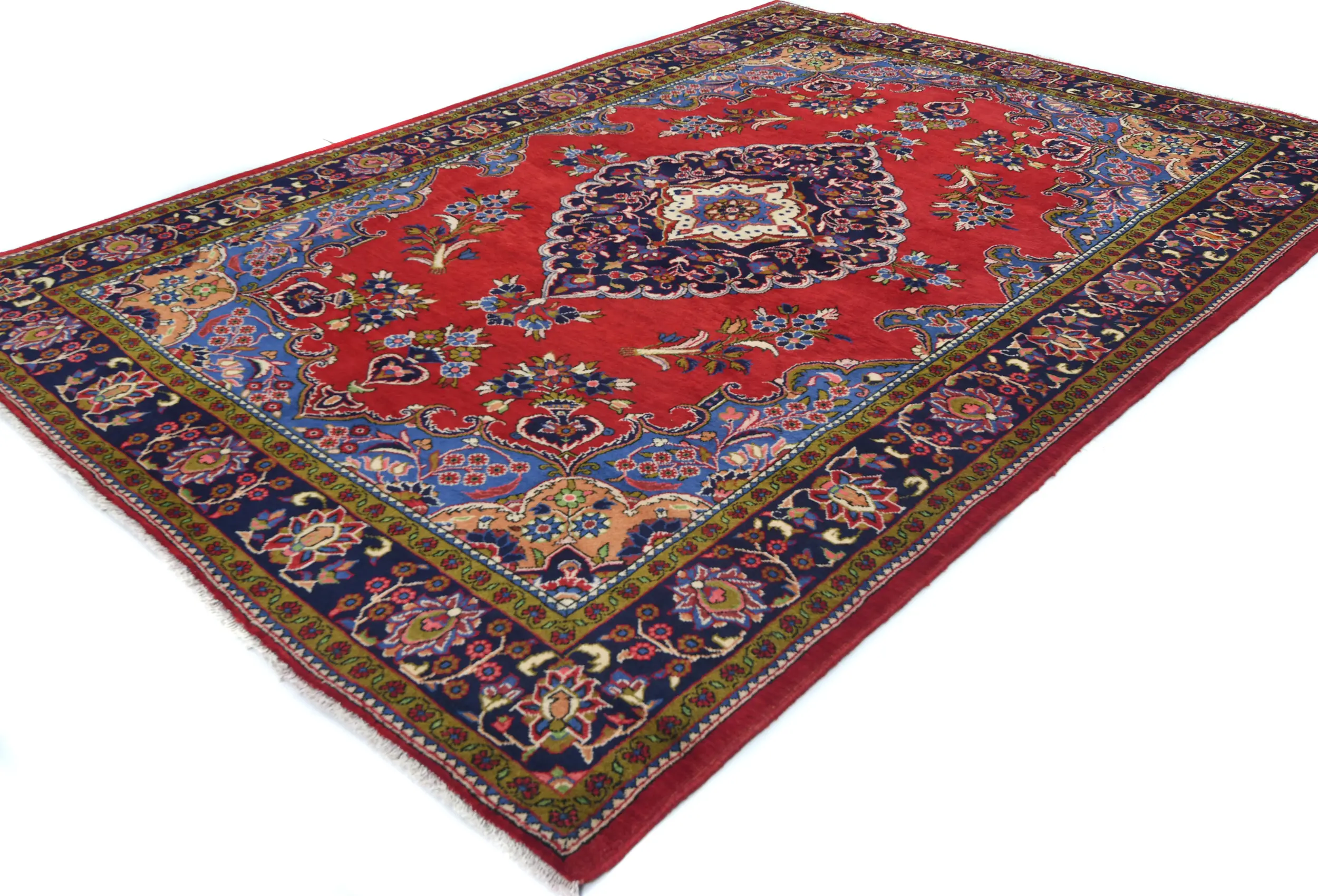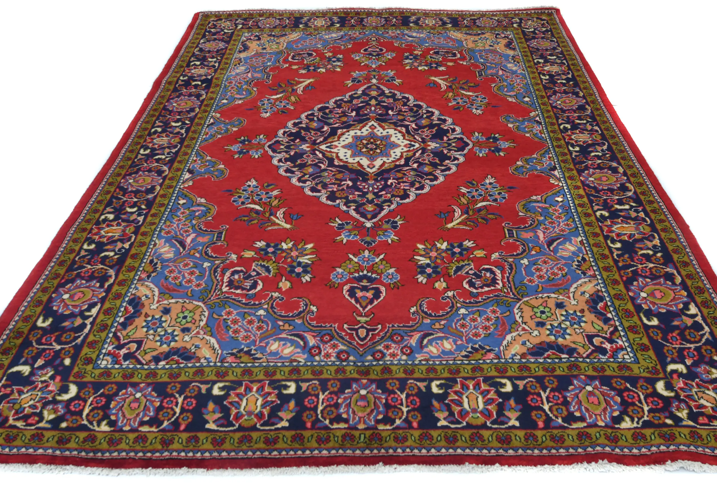 This authentic 7X10 red vintage Persian rug was finely knotted by the hands of weavers influenced by a variety of amazing artistic designs, to recreate the aged look of the exceptional piece with a richness of color and embellished floral background field. What set this traditional Oriental area rug from the others are the material and dye used (wool pile and cotton foundation), knot count, antique designs, fantastic grades, and its regional historical connection: it has deep roots, from the story of the people who produced it to the meaning of the symbols and colors displayed across its canvas that have been praised for centuries. This classic home décor carpet will be completely cozy and inviting that never will go out of style! Also, this Oriental rug would be among your most valuable treasures, it is a great investment that increase in value over time, and it will last a lifetime because was woven with high-quality, all-natural wool; it won’t rip, tear, or shed. Eco-friendly, opulent yet affordable; this Persian rug will give you an extra pop of character to help define your home environment with luxury and warmth that will capture the eyes and attention of your audience (homeowners, designers, decorators, family and friends). RT-7620