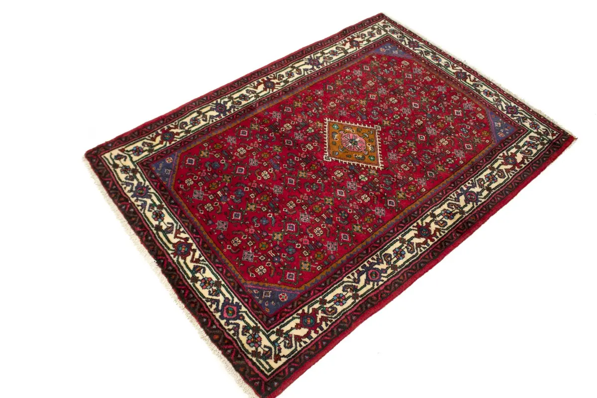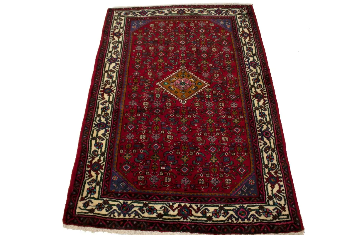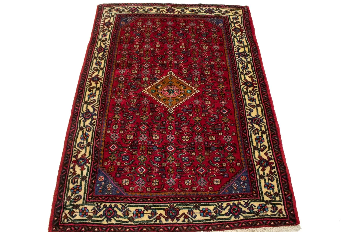 Hand Knotted vintage 3X5 red Persian rug made with vegetable dyes (fine wool pile and cotton foundation), superior knot count, and appealing ancient designs. This Oriental rug never will go out of style and would be among your most valuable treasures.